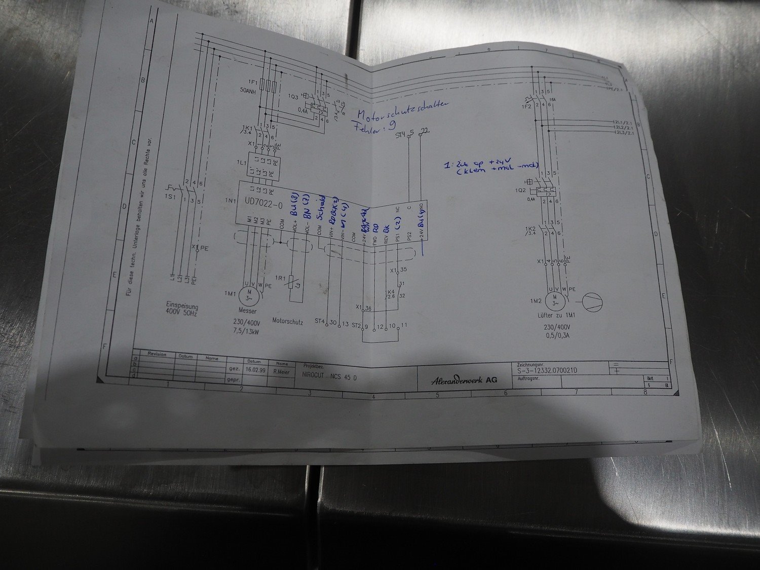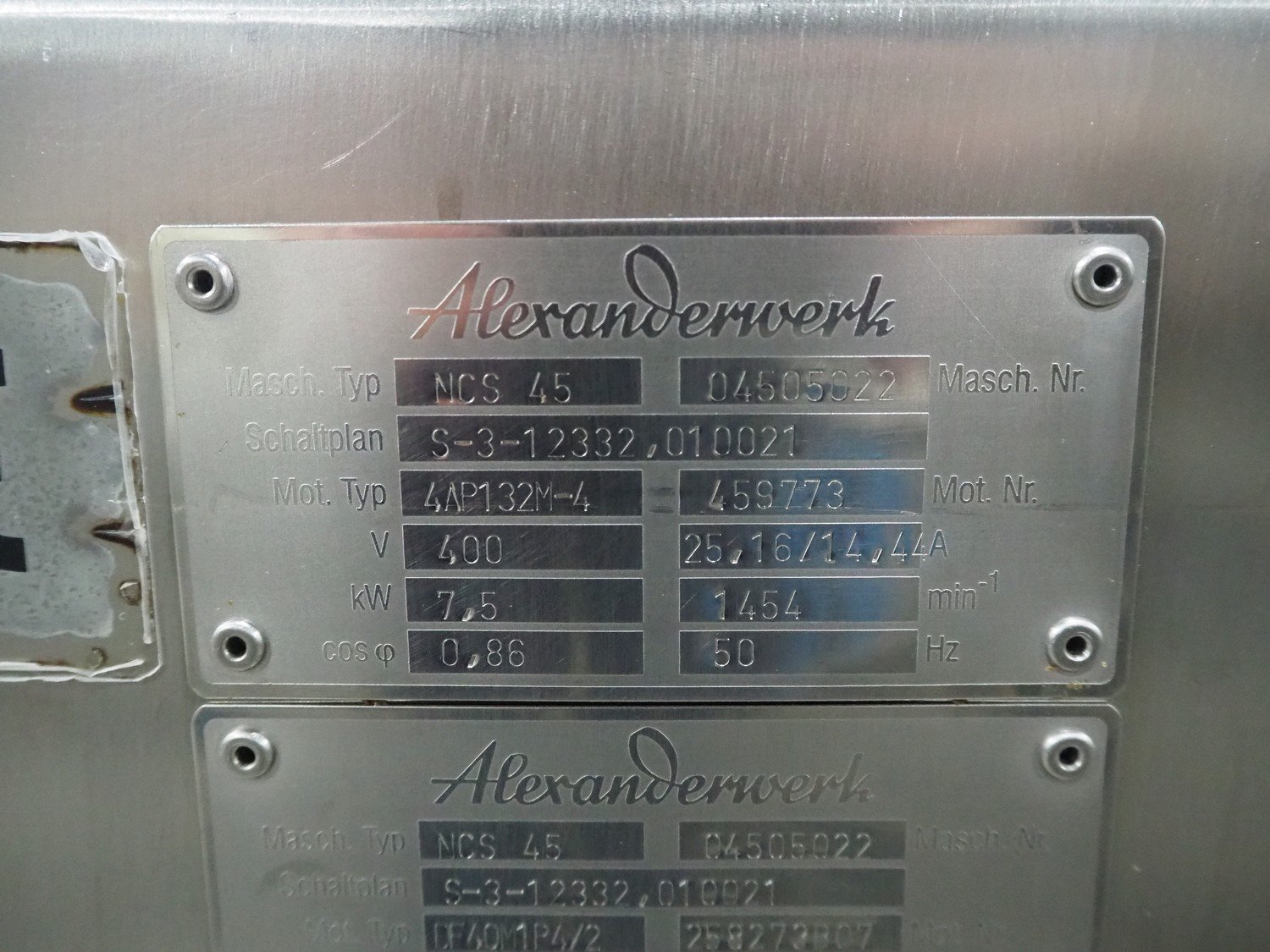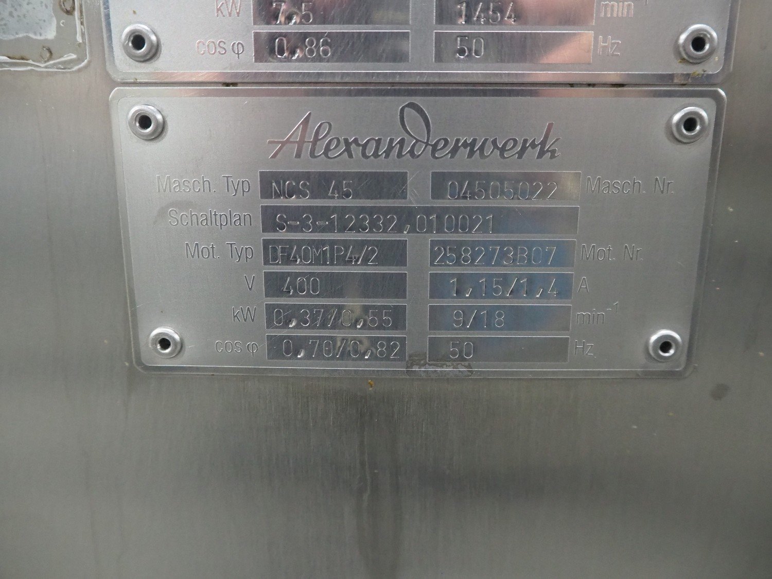 Alexanderwerk cutter, type: NCS 45, machine number: 04505022, 400 V, 50 Hz, 25.16/14.44 A, 7.5 kW, s/s bowl, volume: 45 liter, dimensions: 1150 mm x 950 mm x 1150 mm.