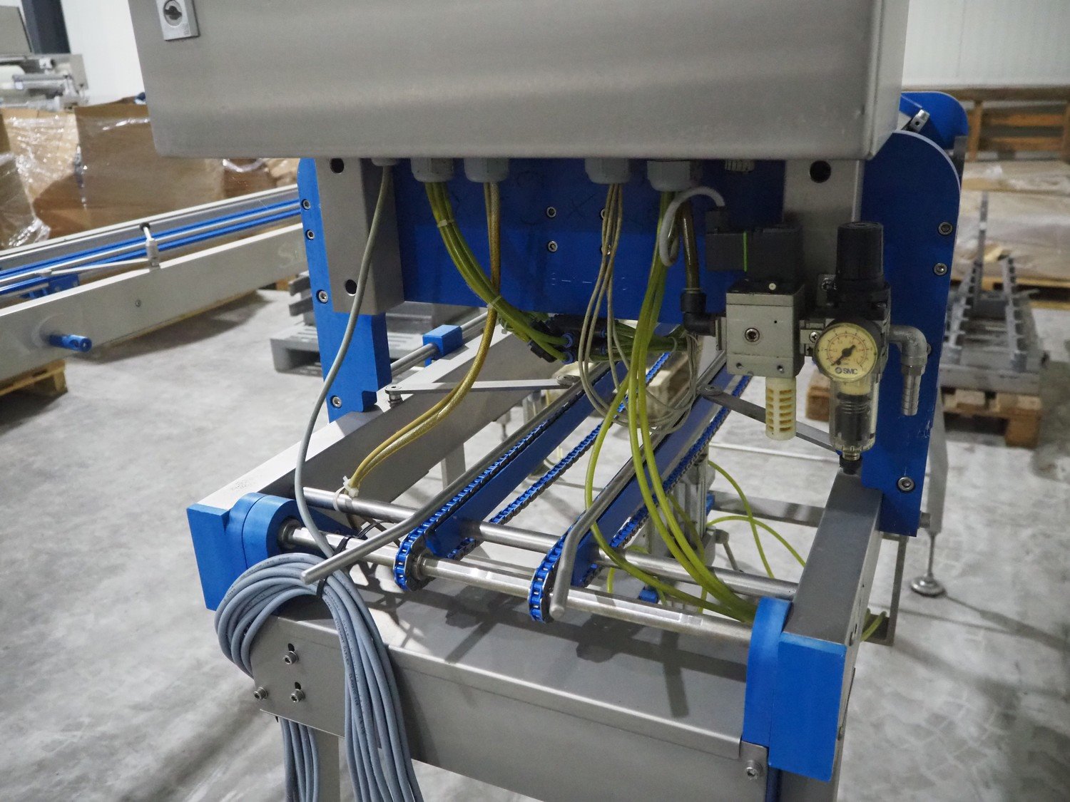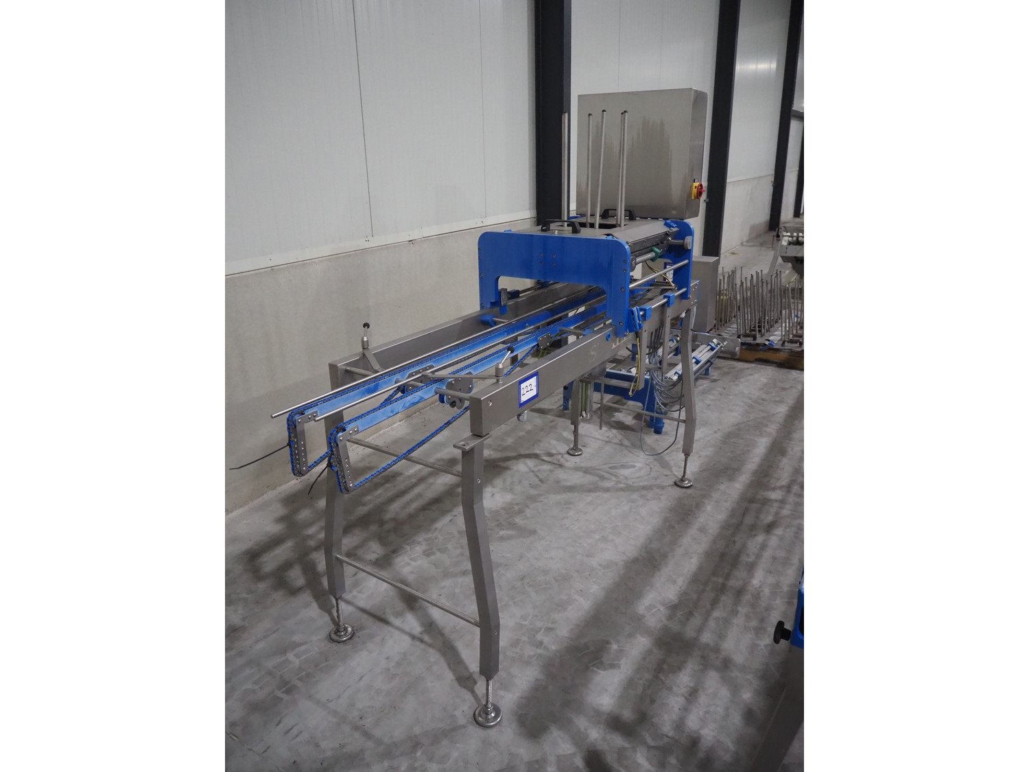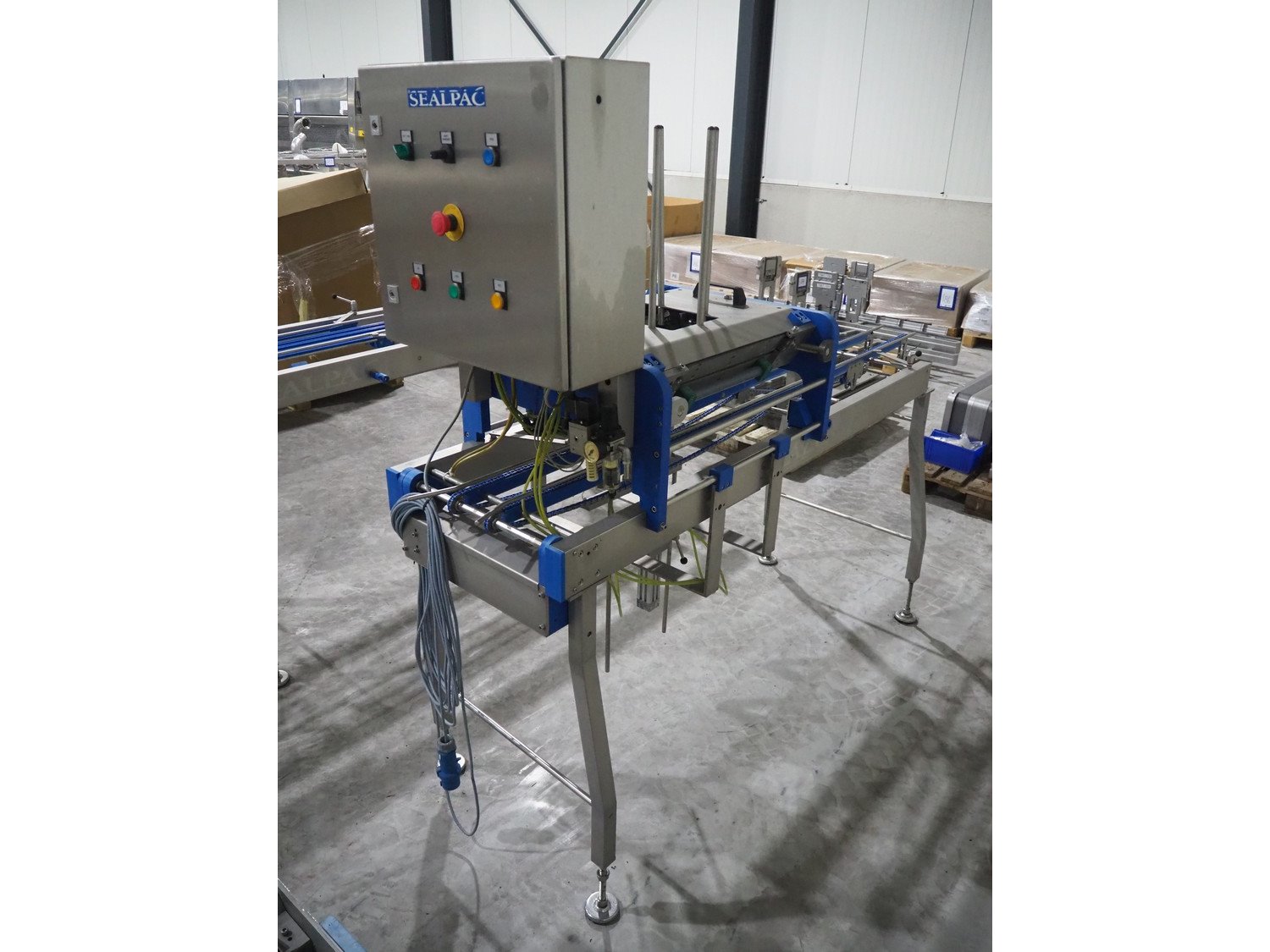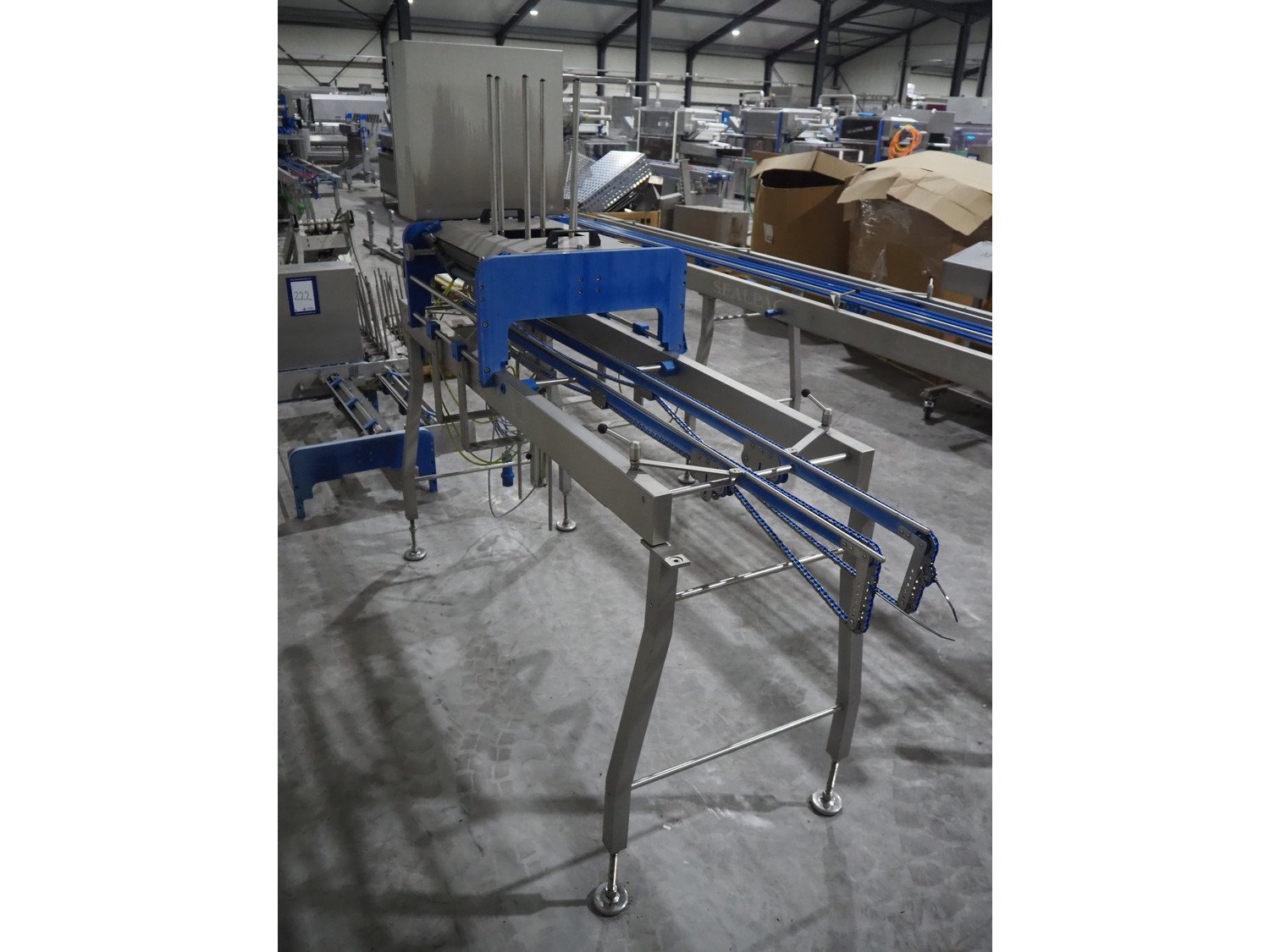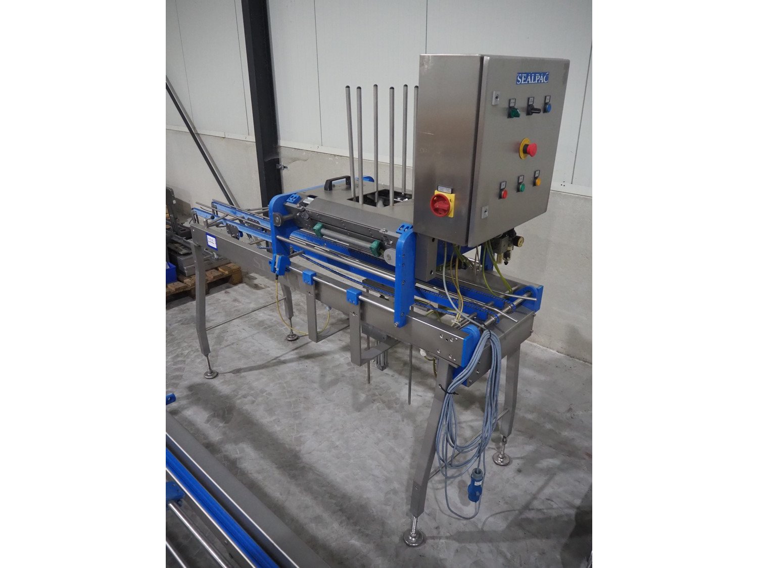 Sealpac denester, dye: 230 mm x 180 mm, chain conveyor, chain width: 110 mm, total dimensions: 2100 mm x 600 mm x 1750 mm. Including pallet with 3 dye's and chain, dye: (5x) 190 mm x 140 mm, (5x) 187 mm x 137 mm, (5x) 183 mm x 143 mm, total dimensions: 1200 mm x 1000 mm x 500 mm.