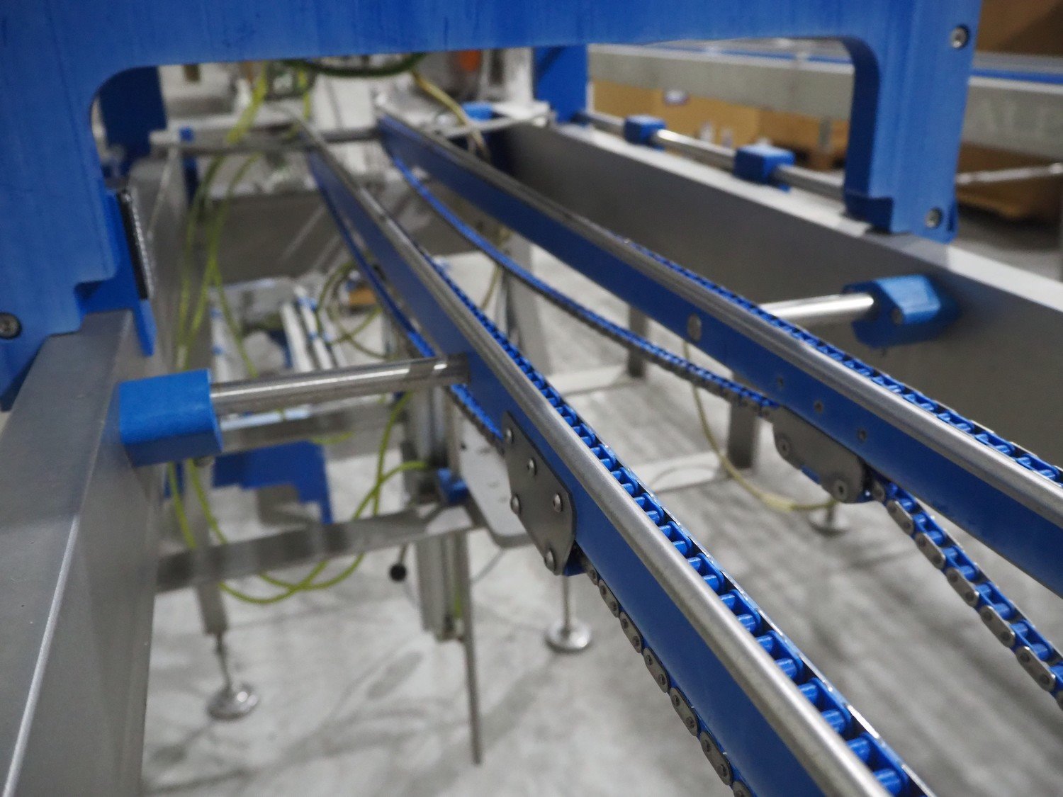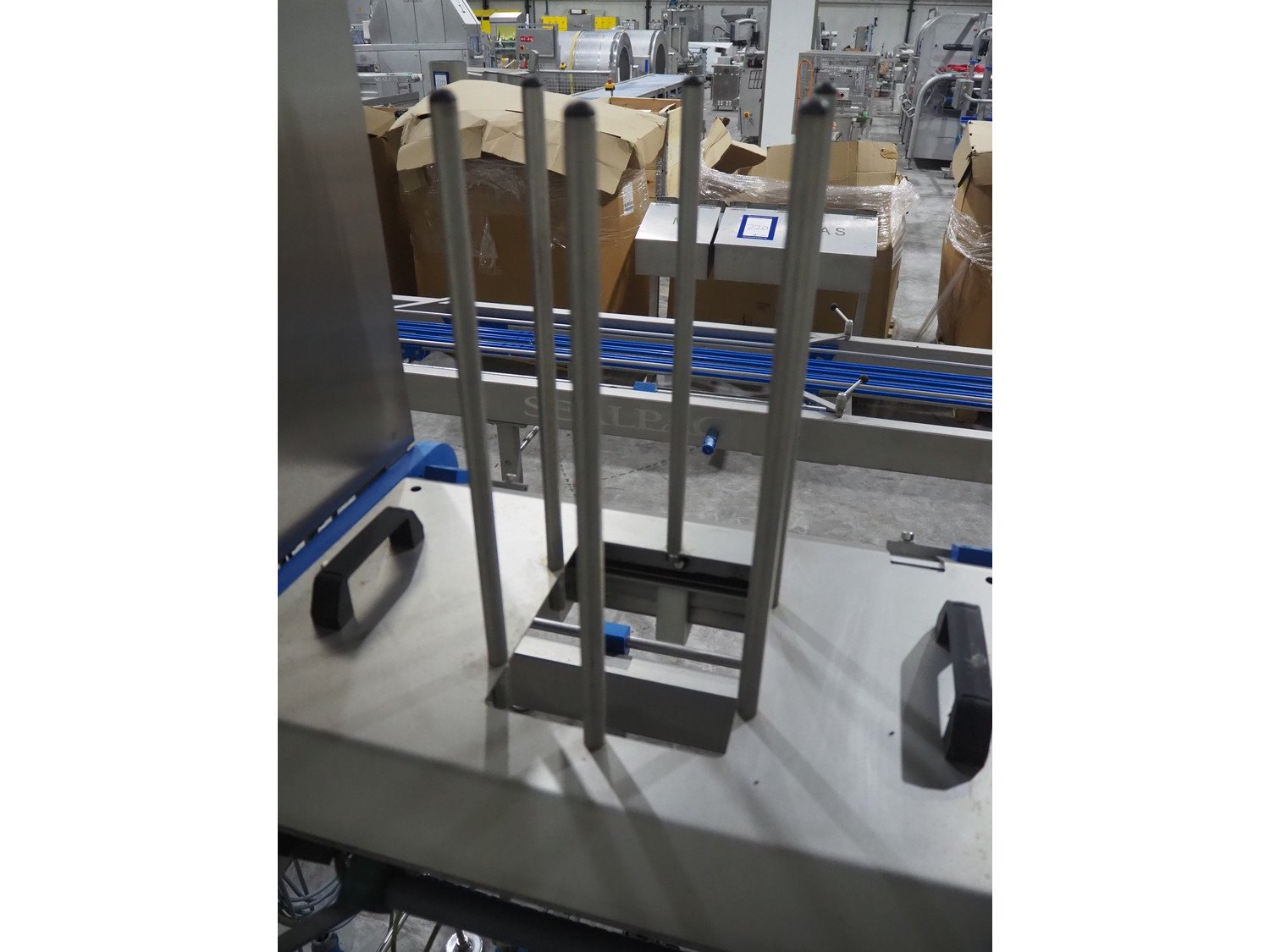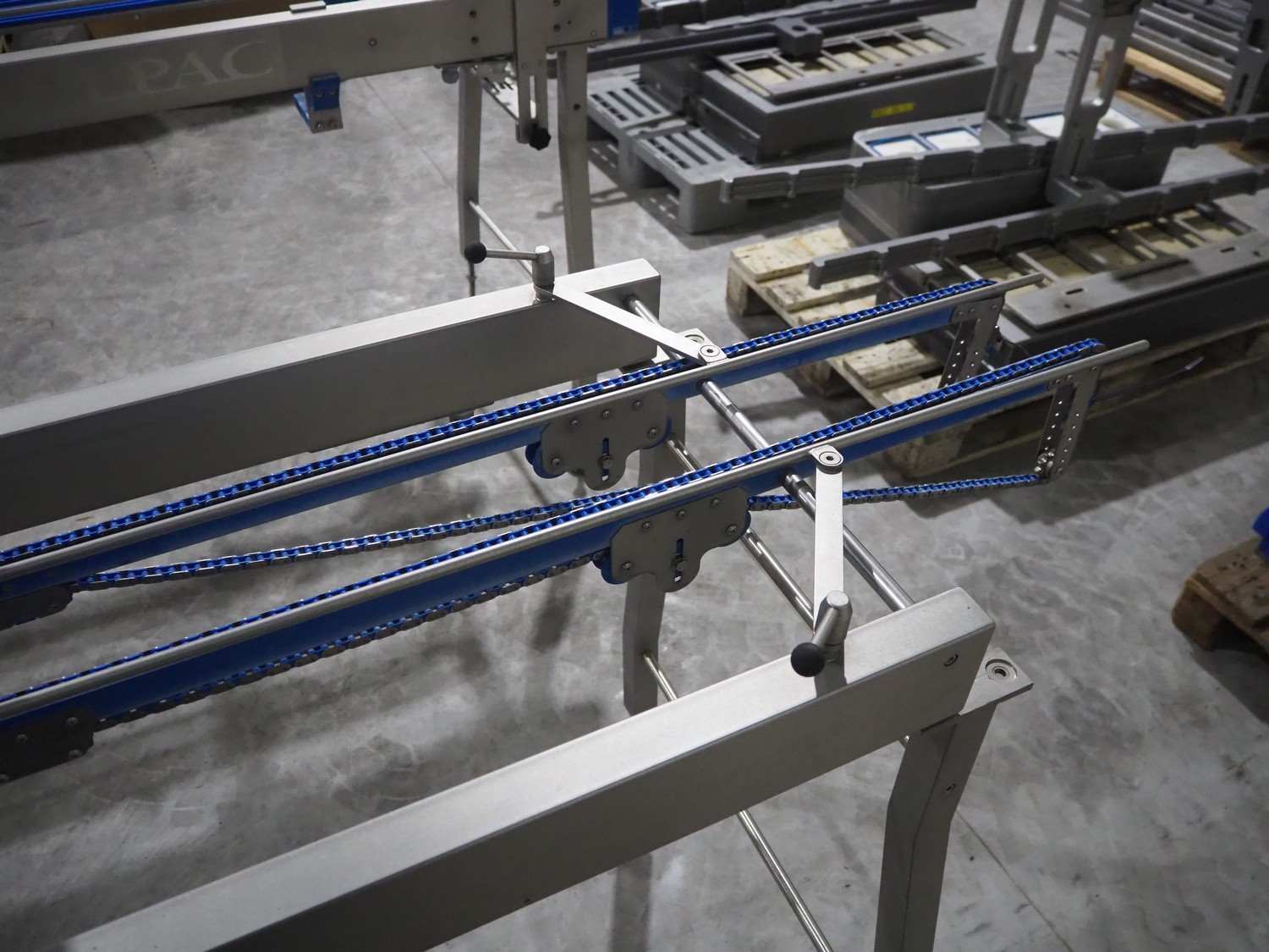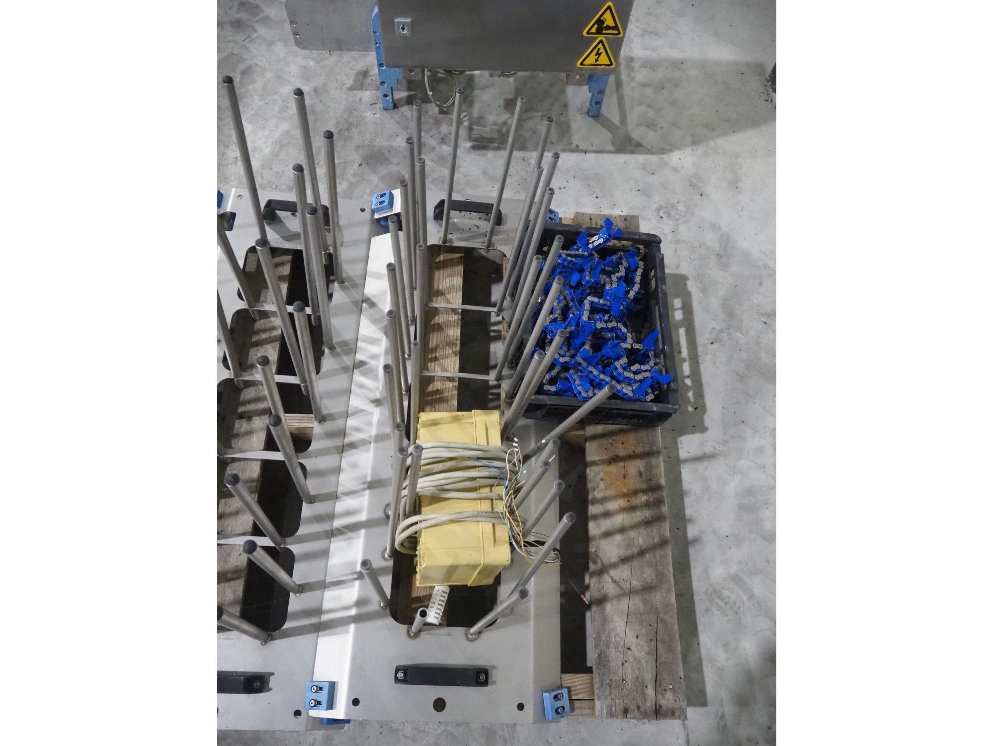 Sealpac denester, dye: 230 mm x 180 mm, chain conveyor, chain width: 110 mm, total dimensions: 2100 mm x 600 mm x 1750 mm. Including pallet with 3 dye's and chain, dye: (5x) 190 mm x 140 mm, (5x) 187 mm x 137 mm, (5x) 183 mm x 143 mm, total dimensions: 1200 mm x 1000 mm x 500 mm.