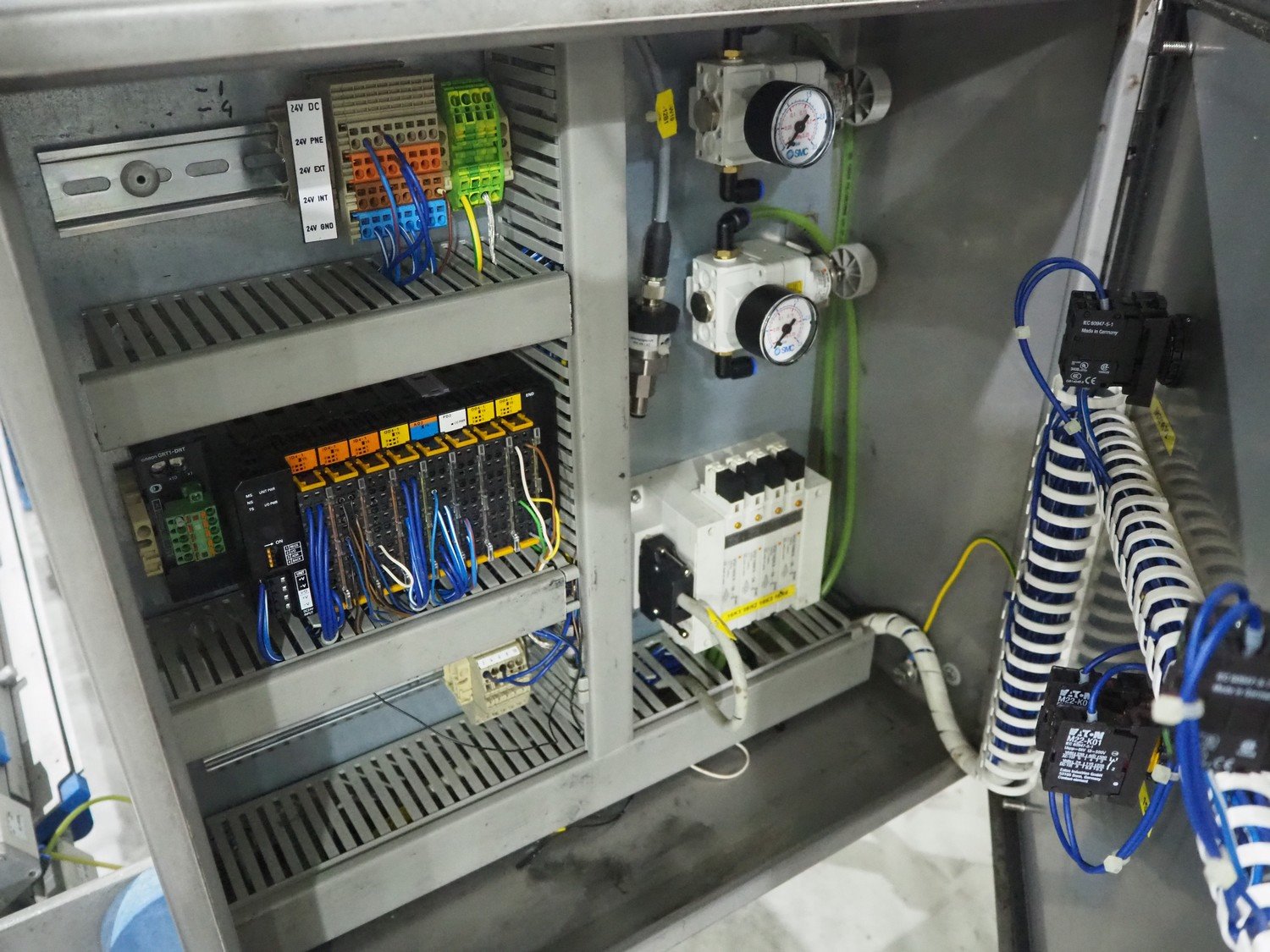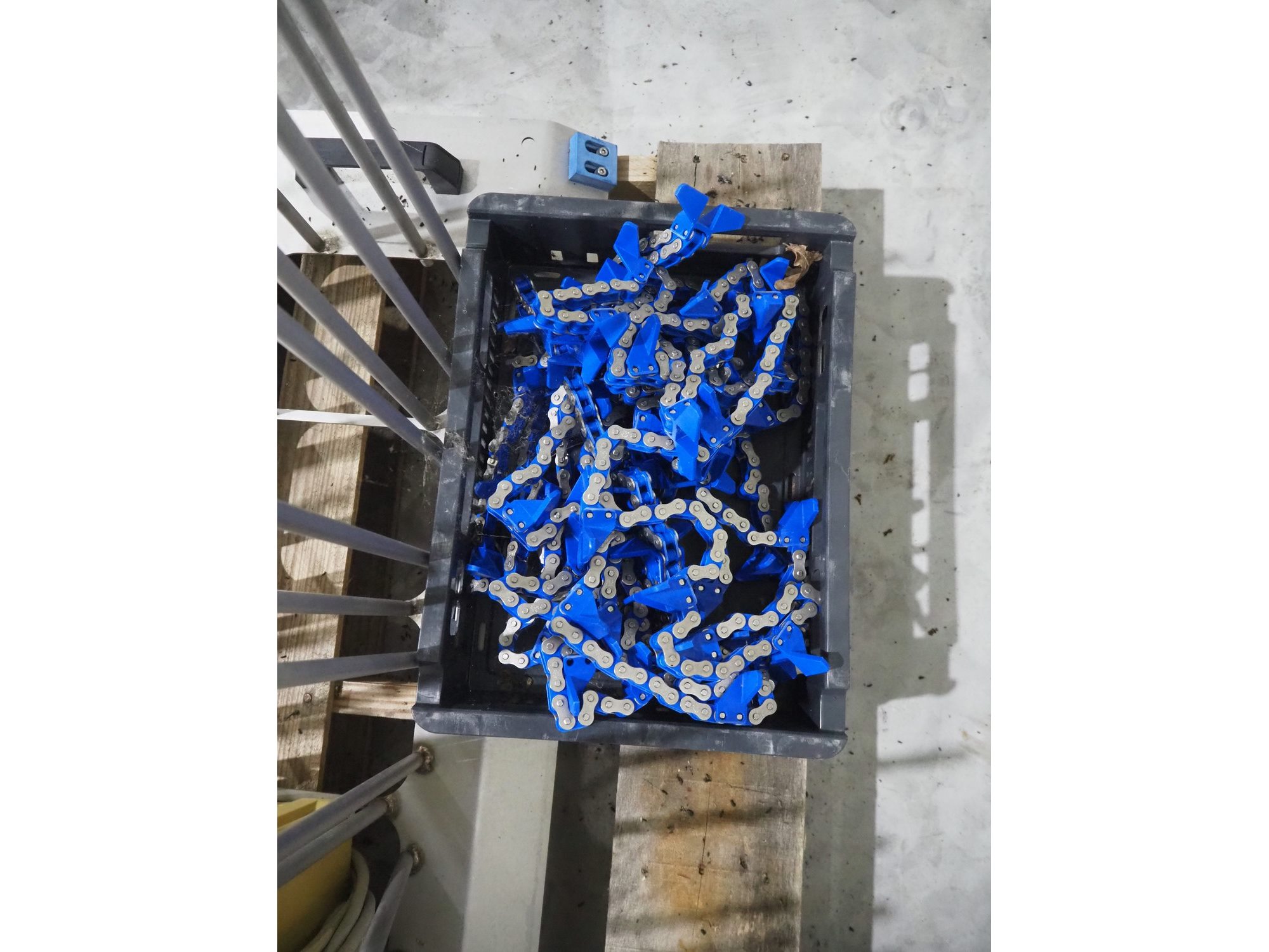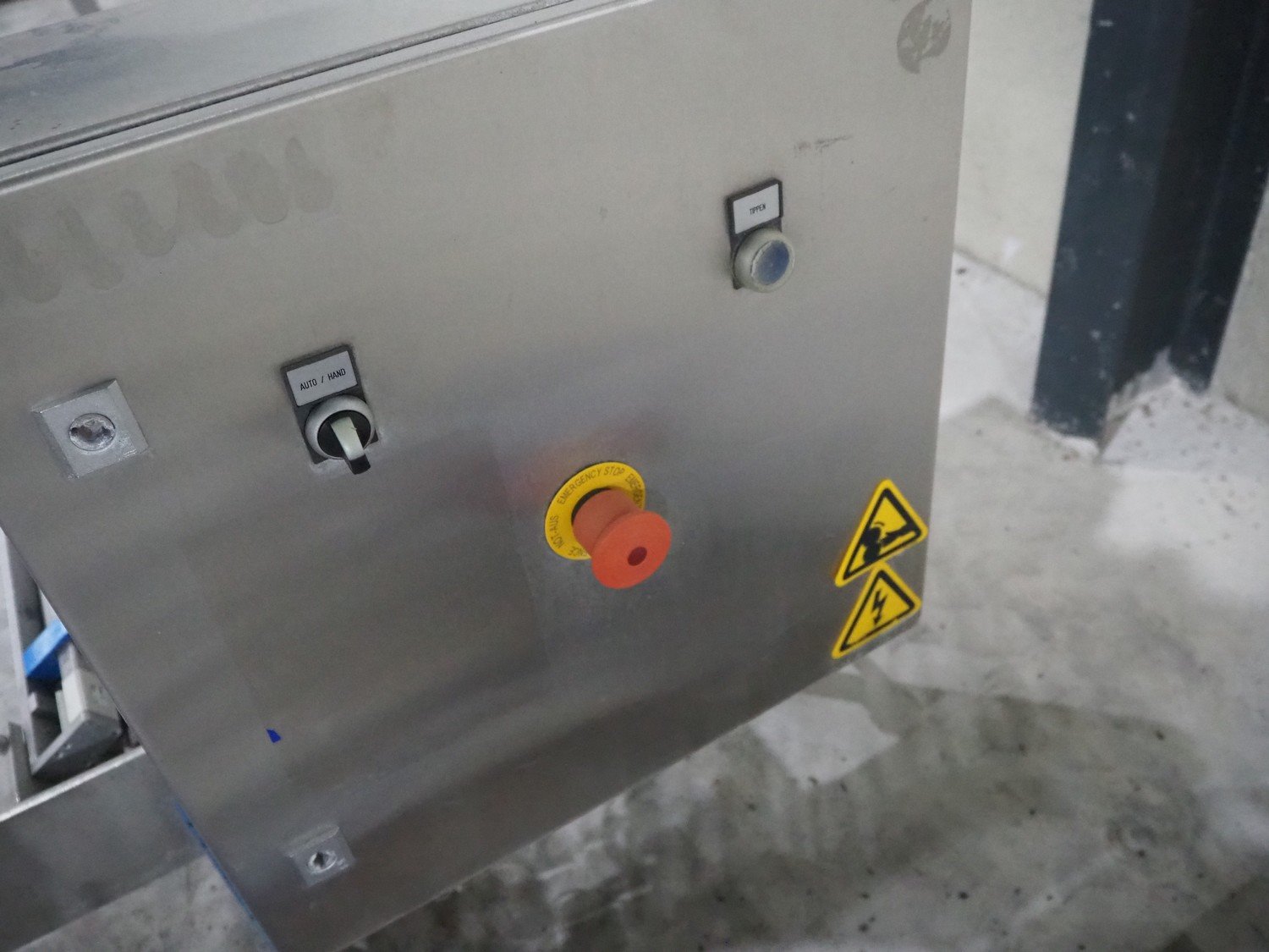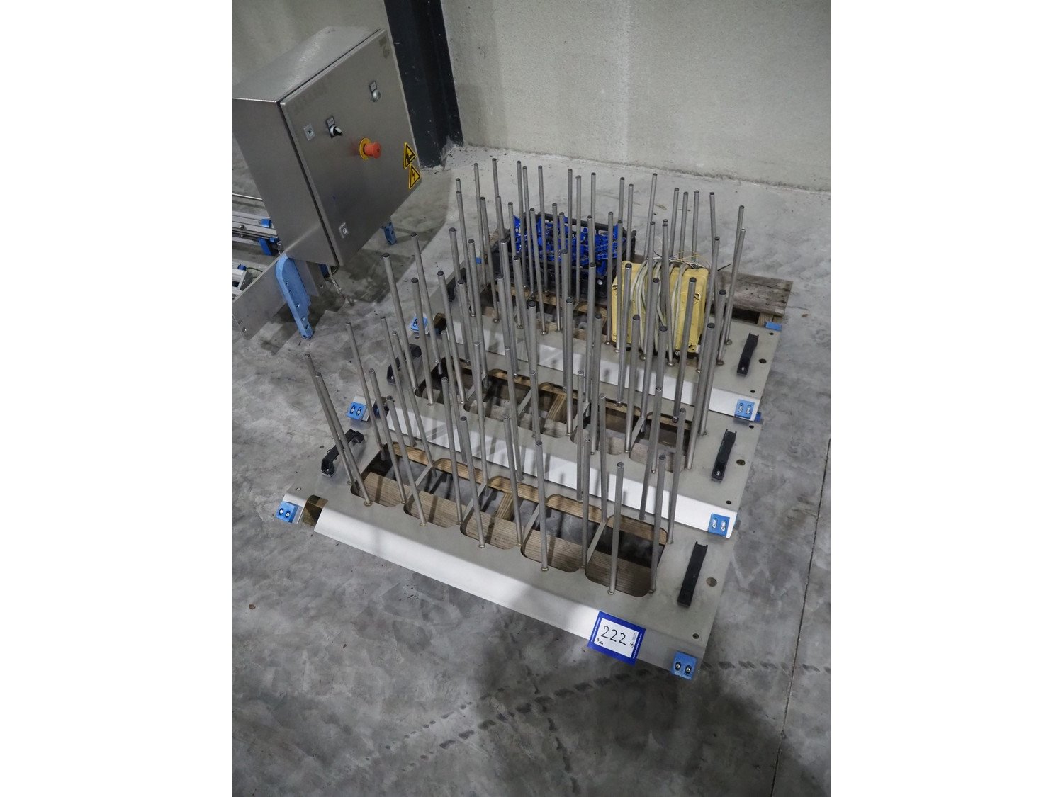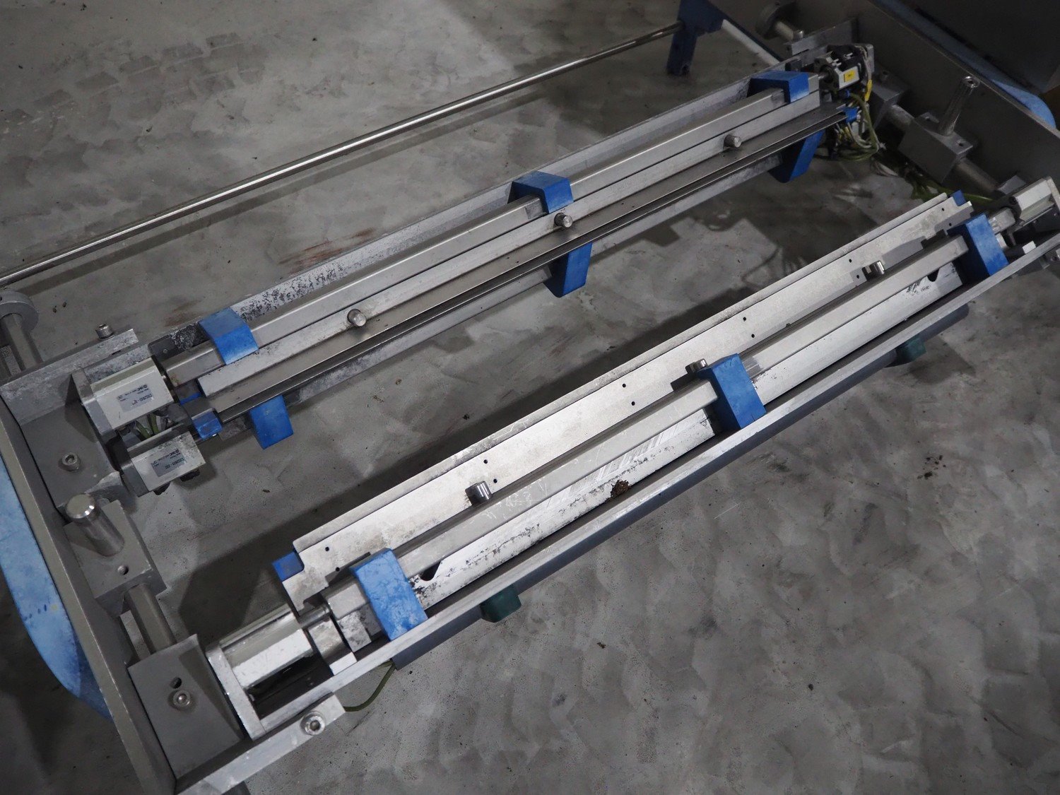 Sealpac denester, dye: 230 mm x 180 mm, chain conveyor, chain width: 110 mm, total dimensions: 2100 mm x 600 mm x 1750 mm. Including pallet with 3 dye's and chain, dye: (5x) 190 mm x 140 mm, (5x) 187 mm x 137 mm, (5x) 183 mm x 143 mm, total dimensions: 1200 mm x 1000 mm x 500 mm.