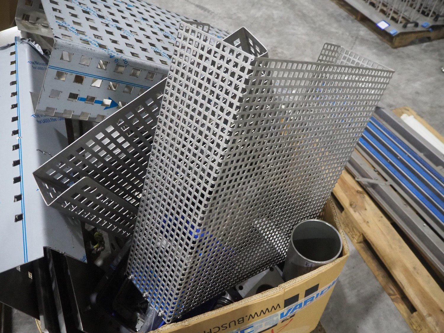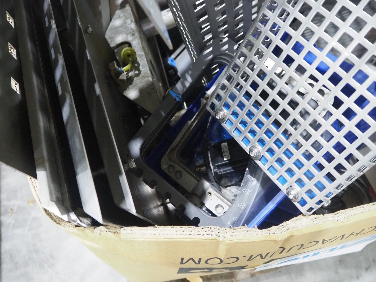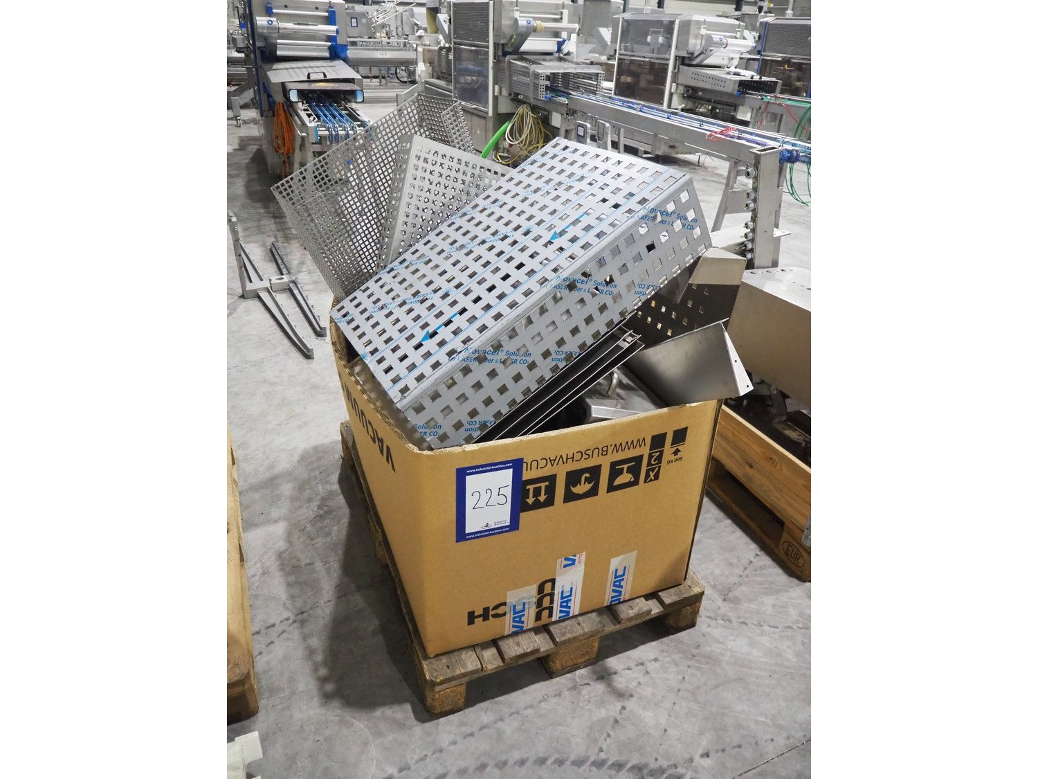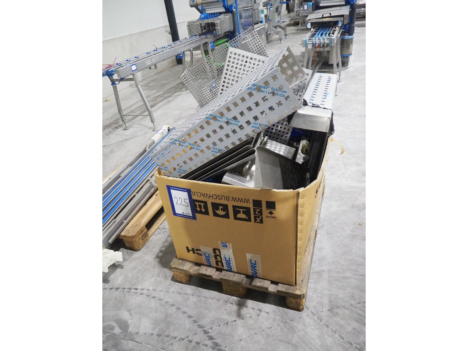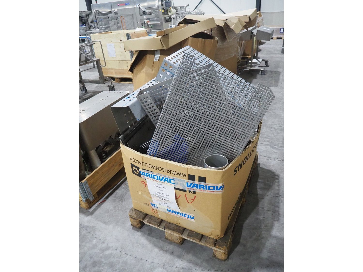 Pallet with parts and s/s covers for Sealpac traysealer, dimensions: 1200 mm x 800 mm x 1200 mm.