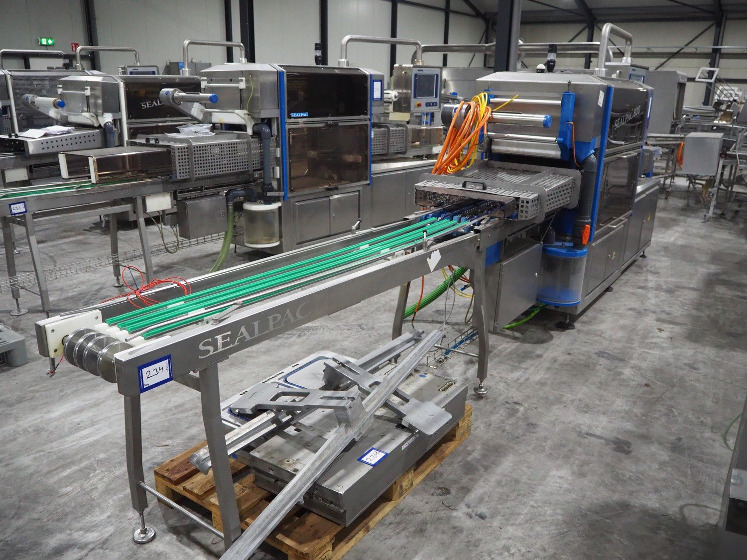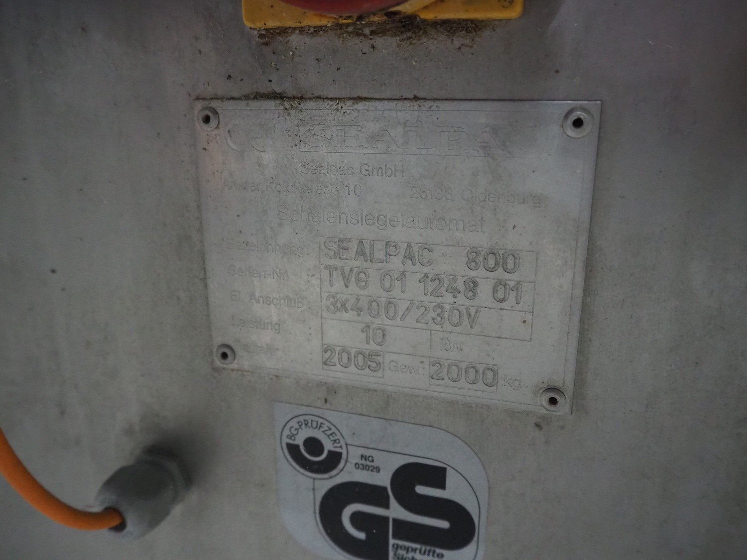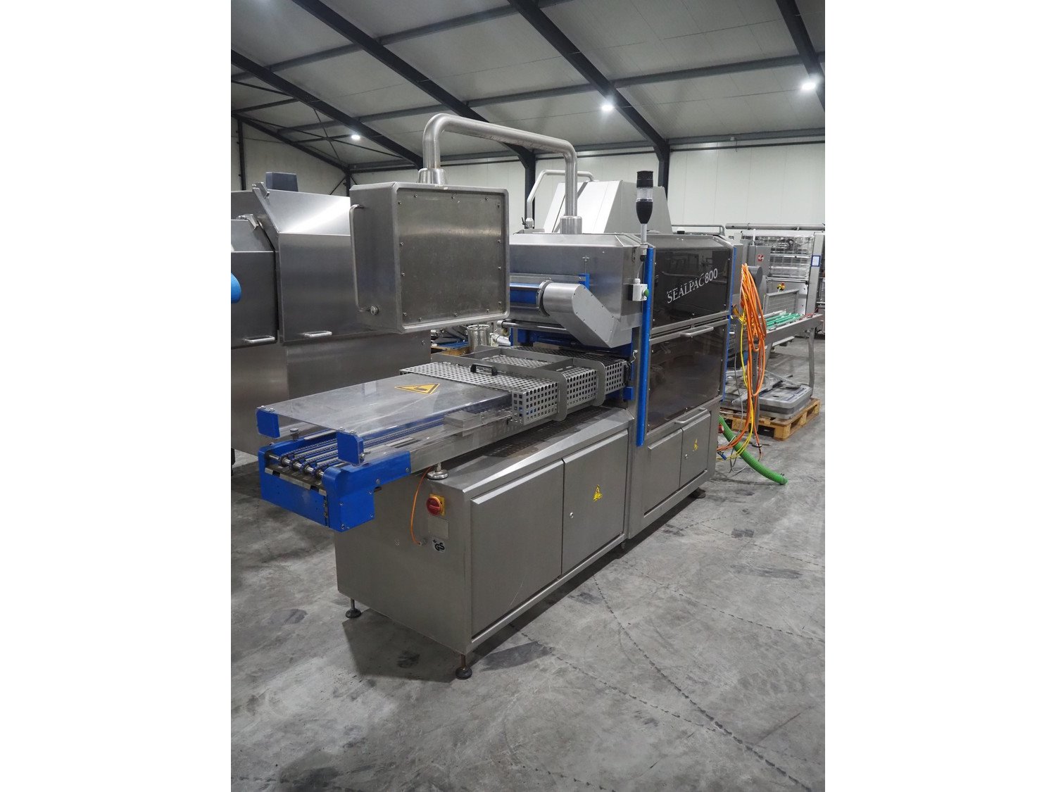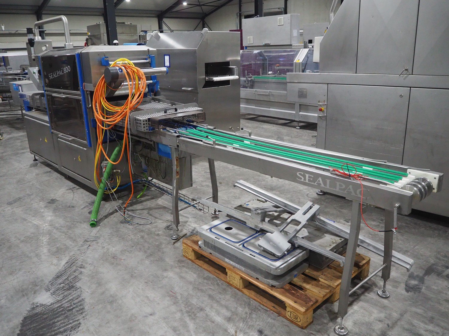 Sealpac traysealer, type: Sealpac 800, serial number: TVG 01124801, year of construction: 2005, 400/230 V, 3 Ph, 10 kW, dye: (4x) 258 mm x 158 mm, total dimensions: 6100 mm x 950 mm x 2100 mm. Including pallet with dye, dye: (2x) 304 mm x 243 mm, total dimensions: 1200 mm x 800 mm x 400 mm.