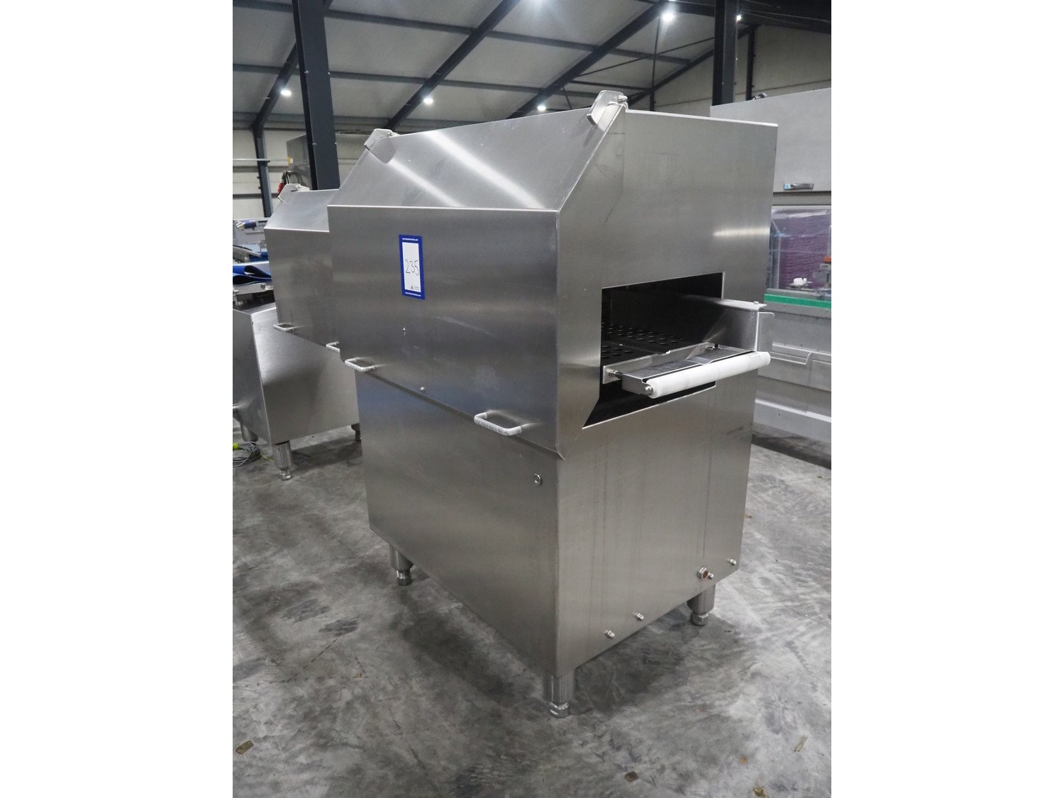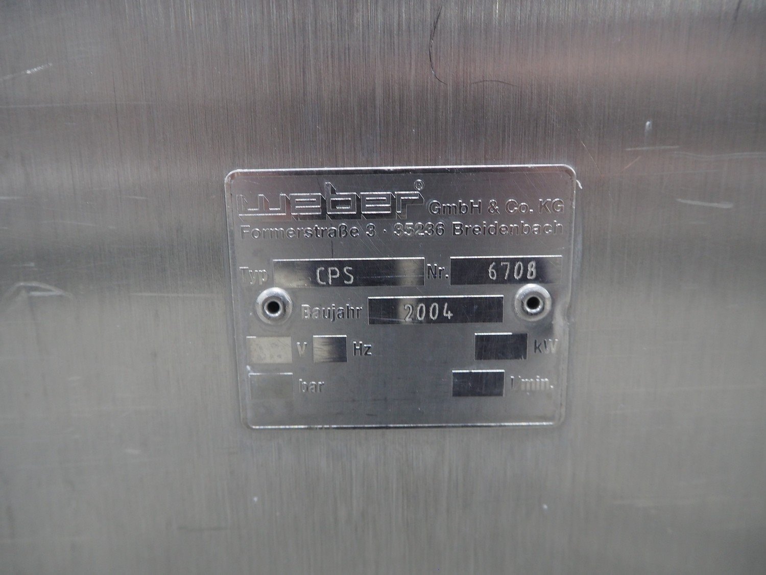 Weber Maschinenbau GmbH product scanner, type: CPS, number: 6708, year of construction: 2004, plastic belt, belt width: 420 mm, total dimensions: 2400 mm x 1100 mm x 1900 mm. Technical condition unknown.