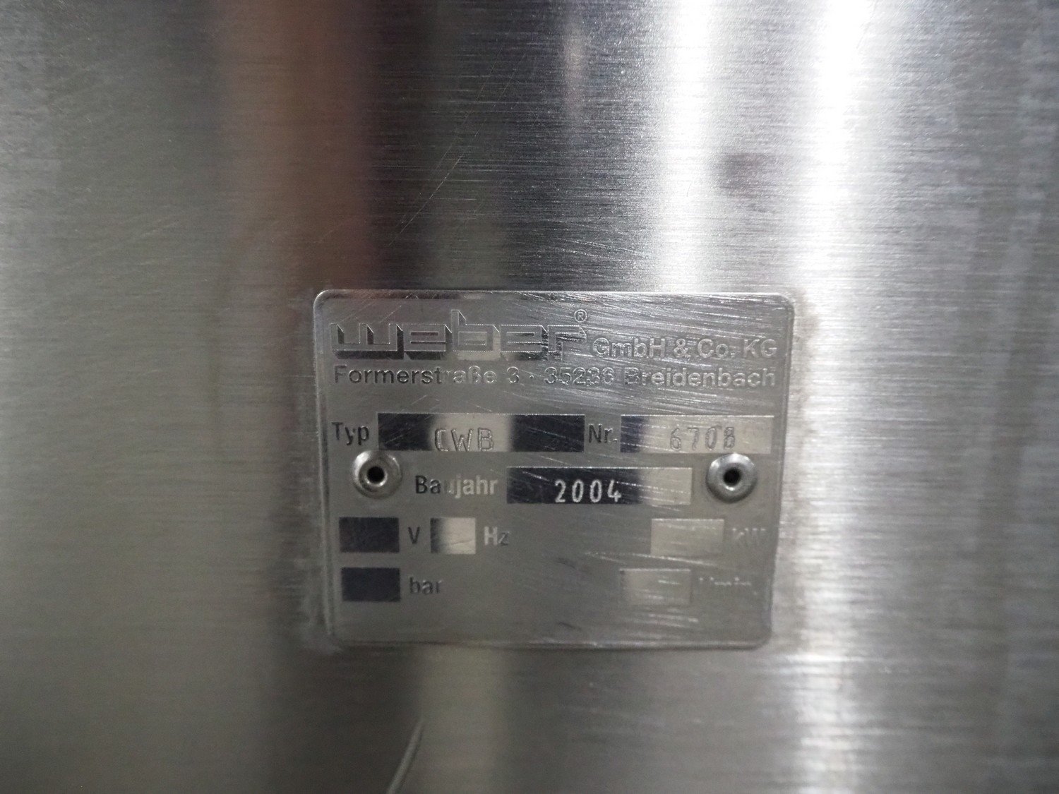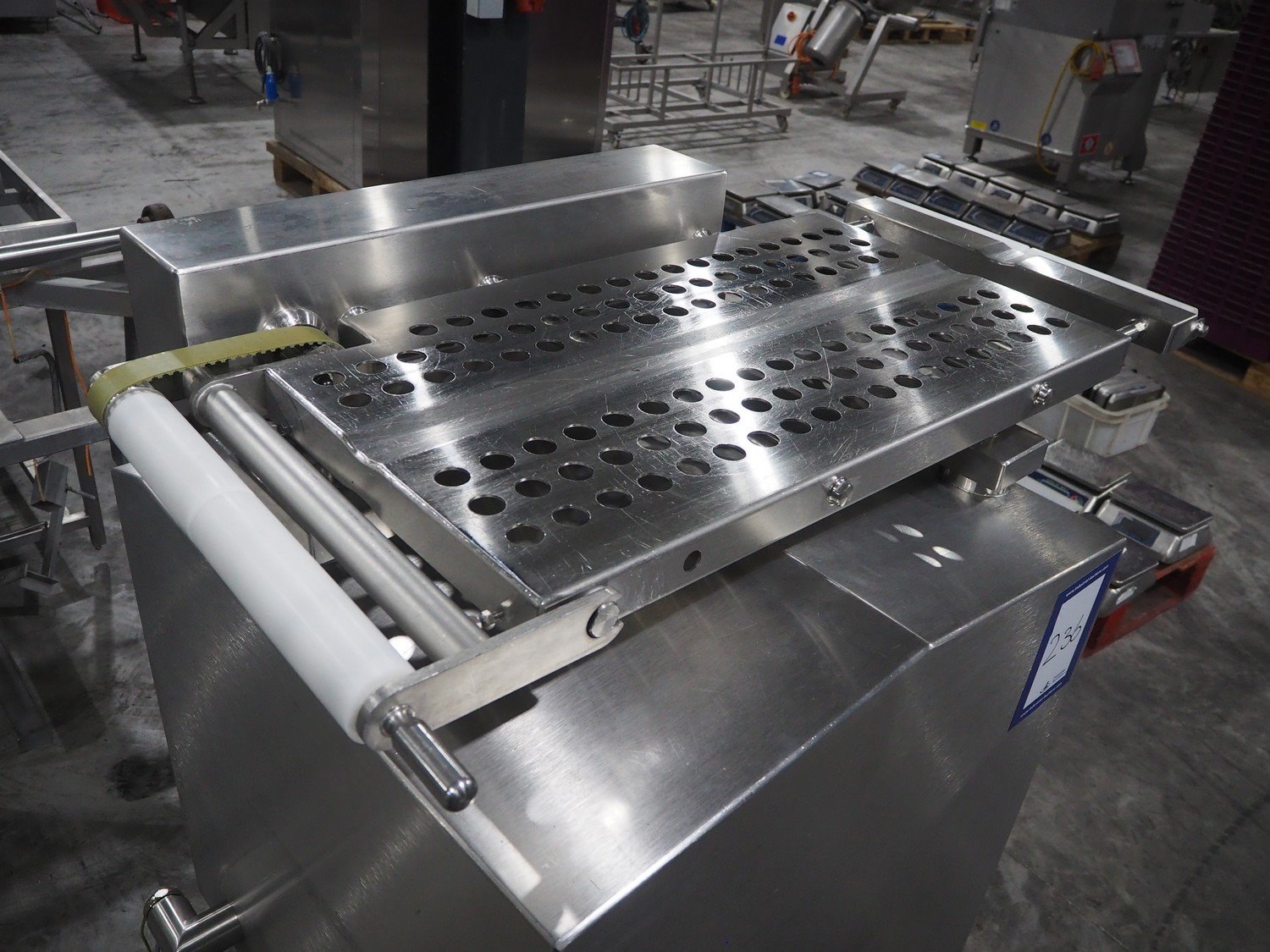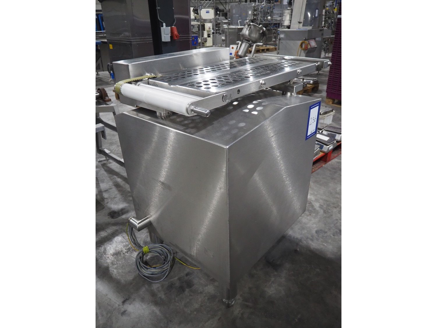 Weber loading conveyor, type: CWB, number: 6708, year of construction: 2004, plastic belt, belt width: 450 mm, total dimensions: 1270 mm x 830 mm x 1260 mm. Missing cover. Technical condition unknown.