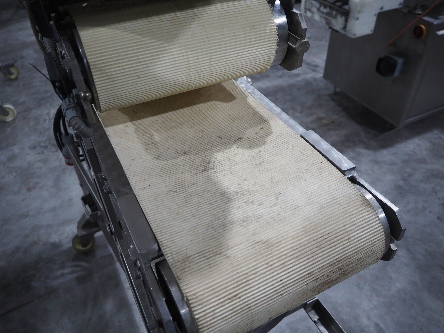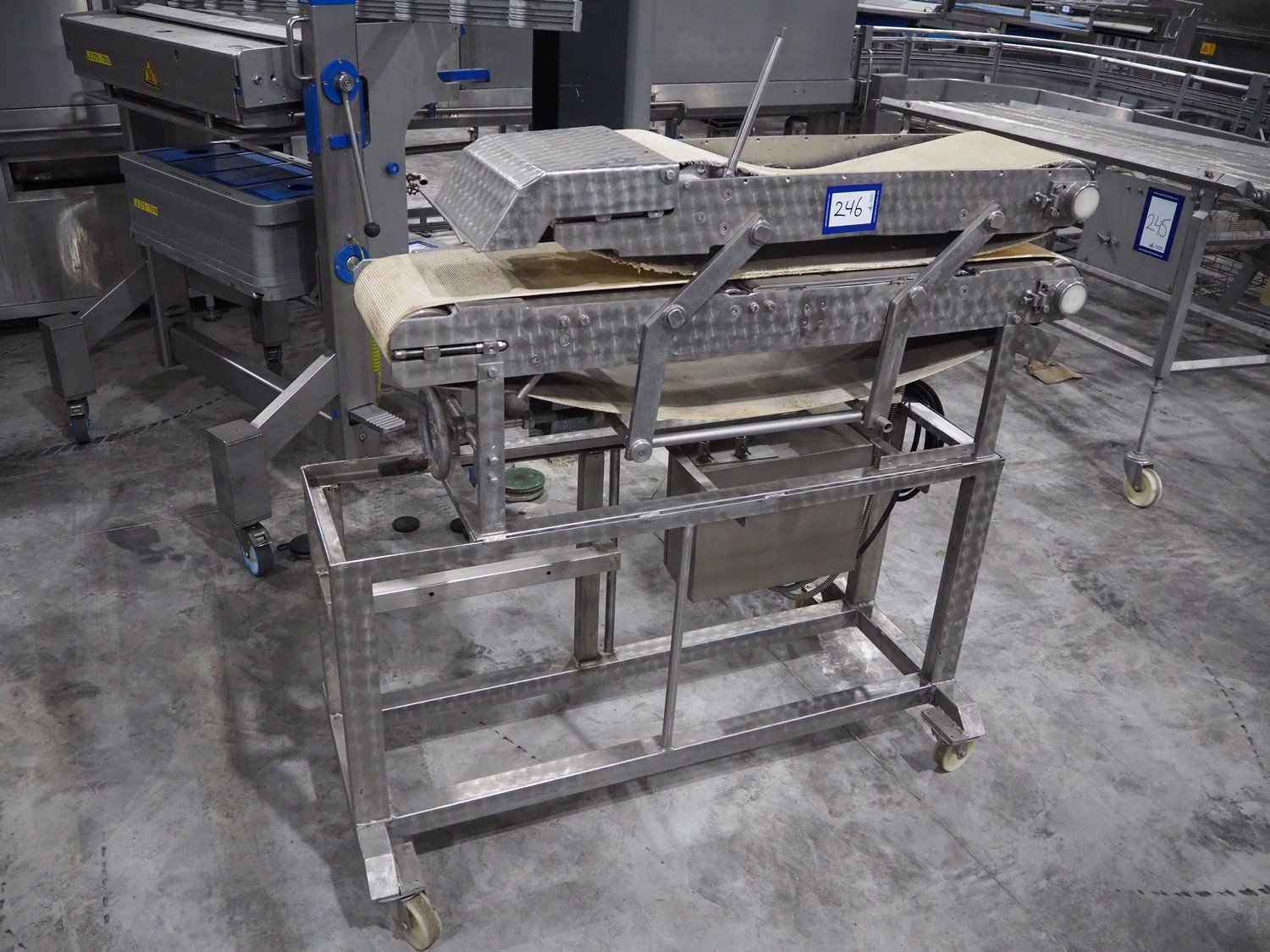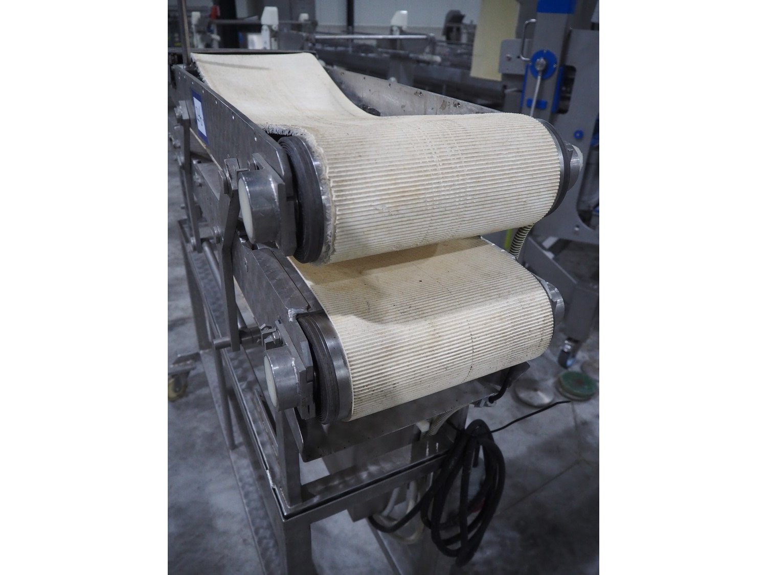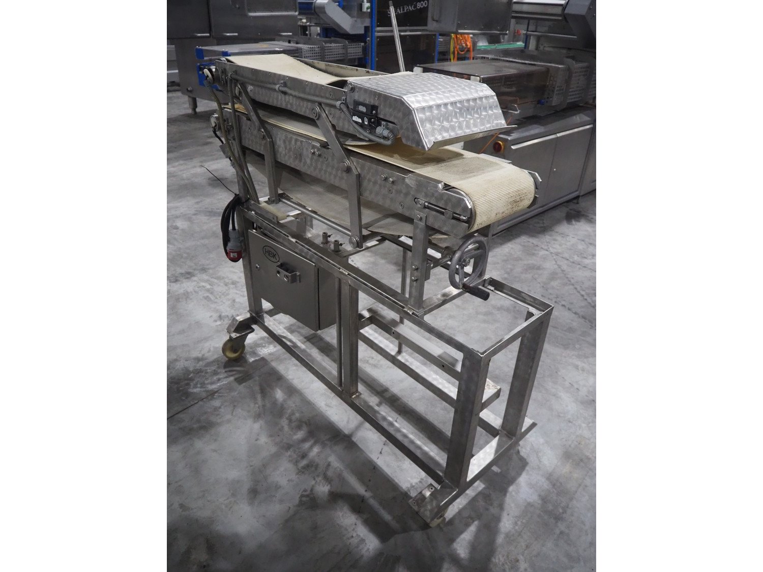 Mobile flattener, plastic belt, belt width: (2x) 250 mm, total dimensions: 1380 mm x 600 mm x 1260 mm.