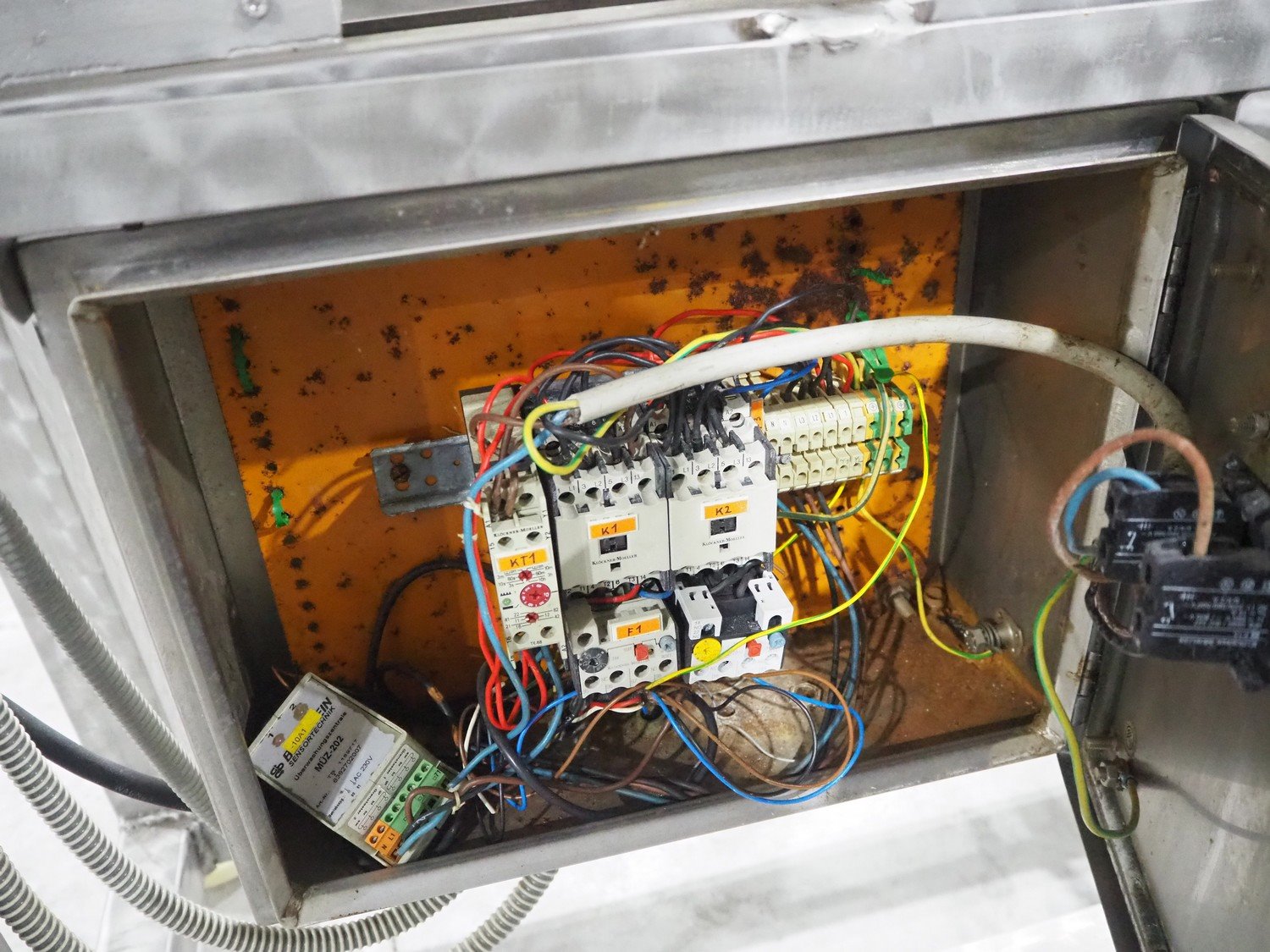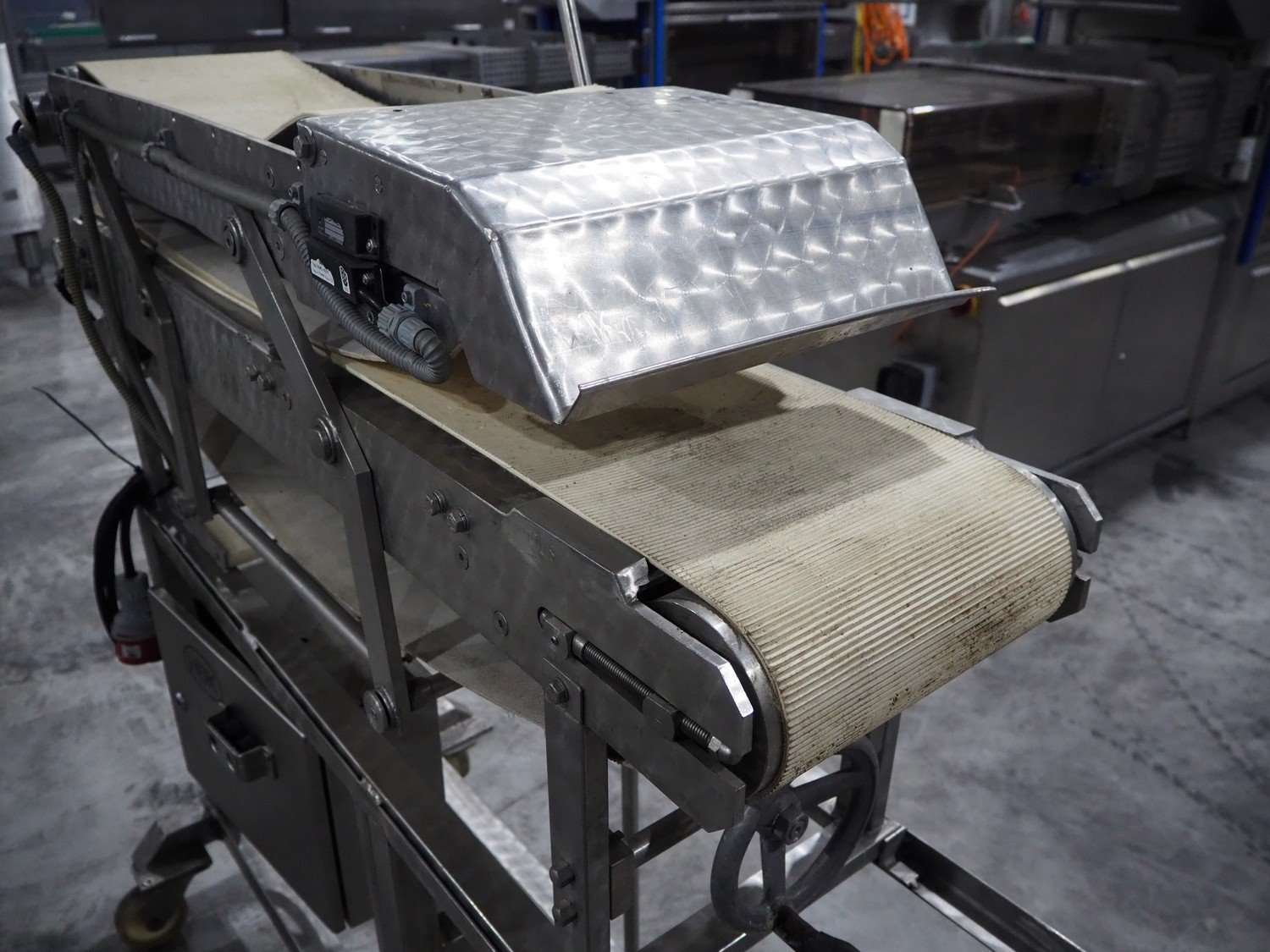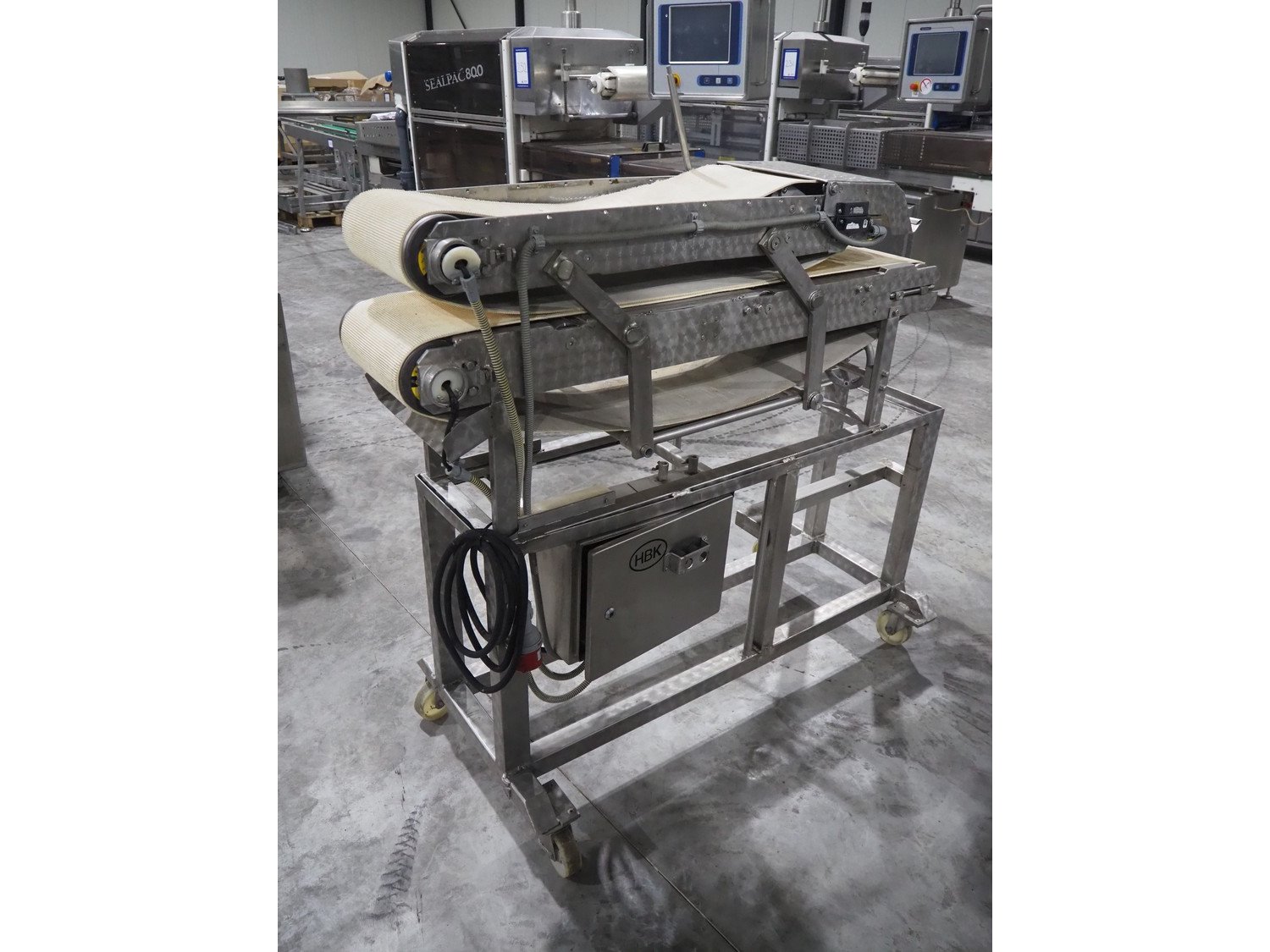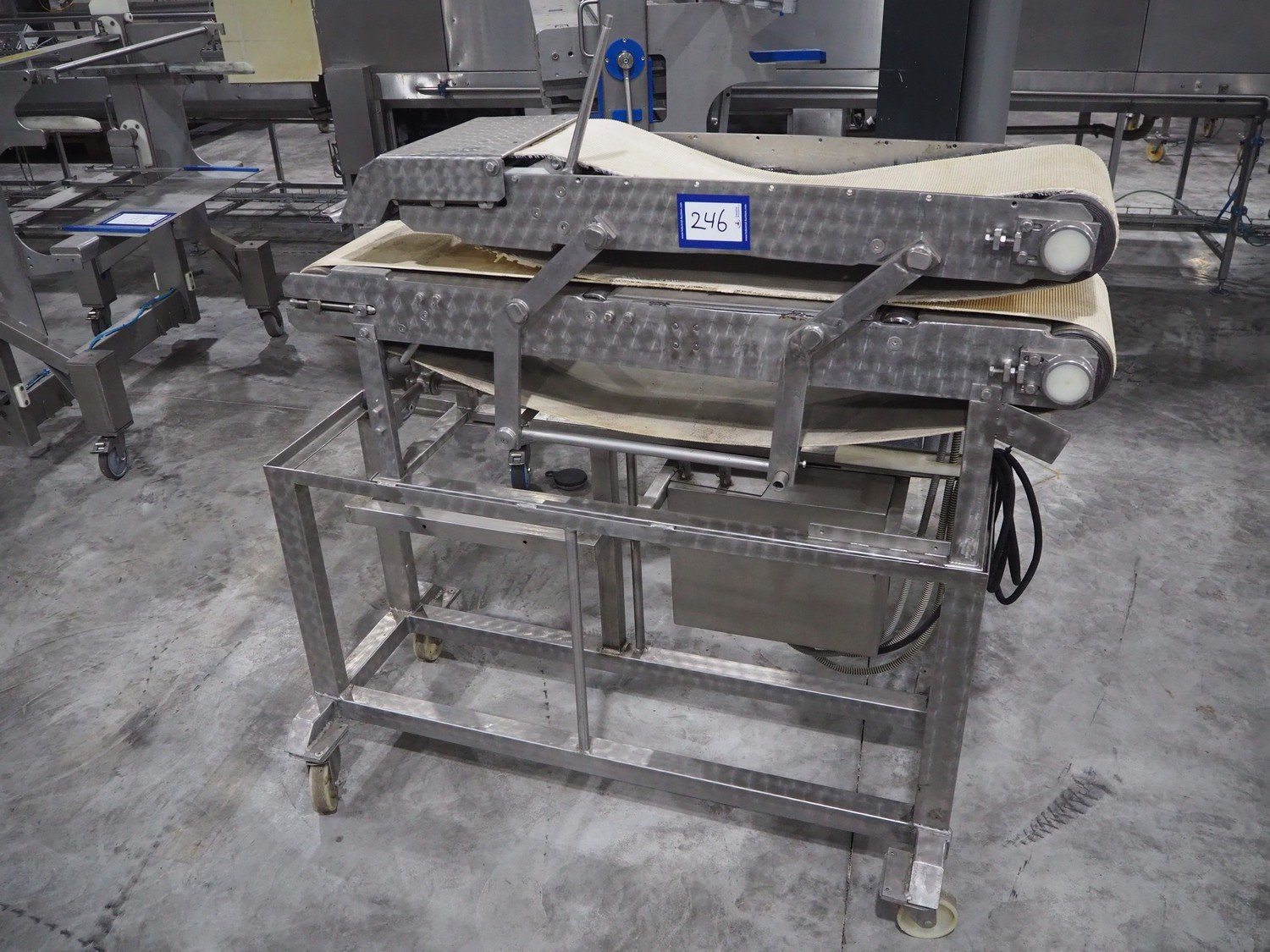 Mobile flattener, plastic belt, belt width: (2x) 250 mm, total dimensions: 1380 mm x 600 mm x 1260 mm.