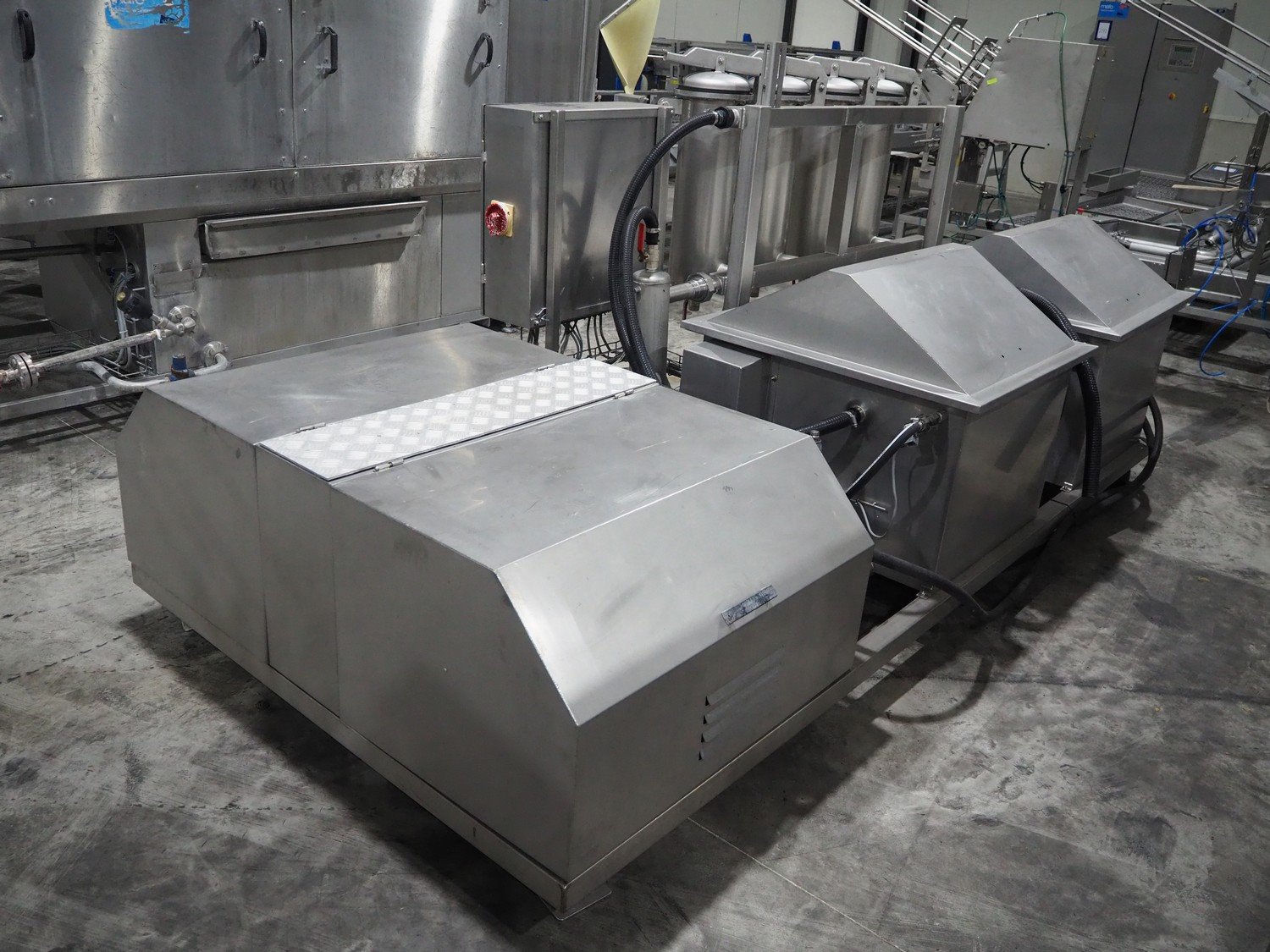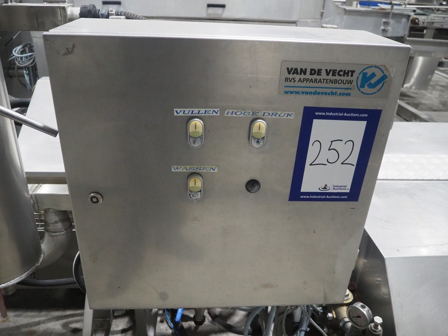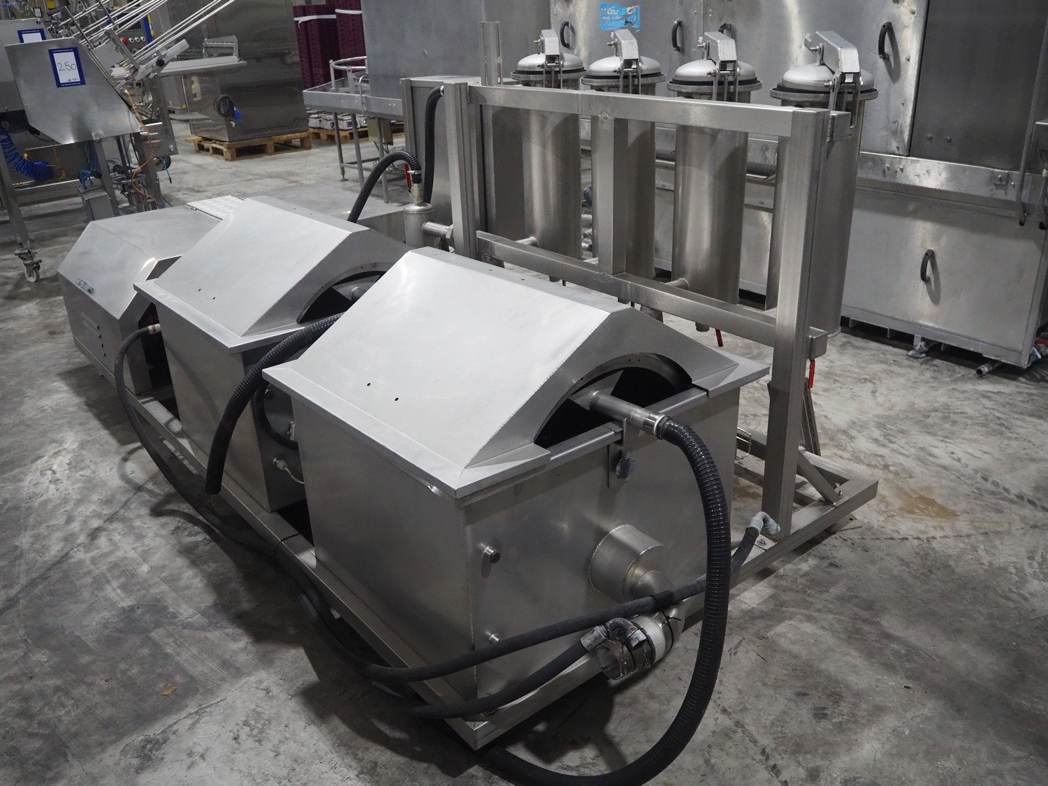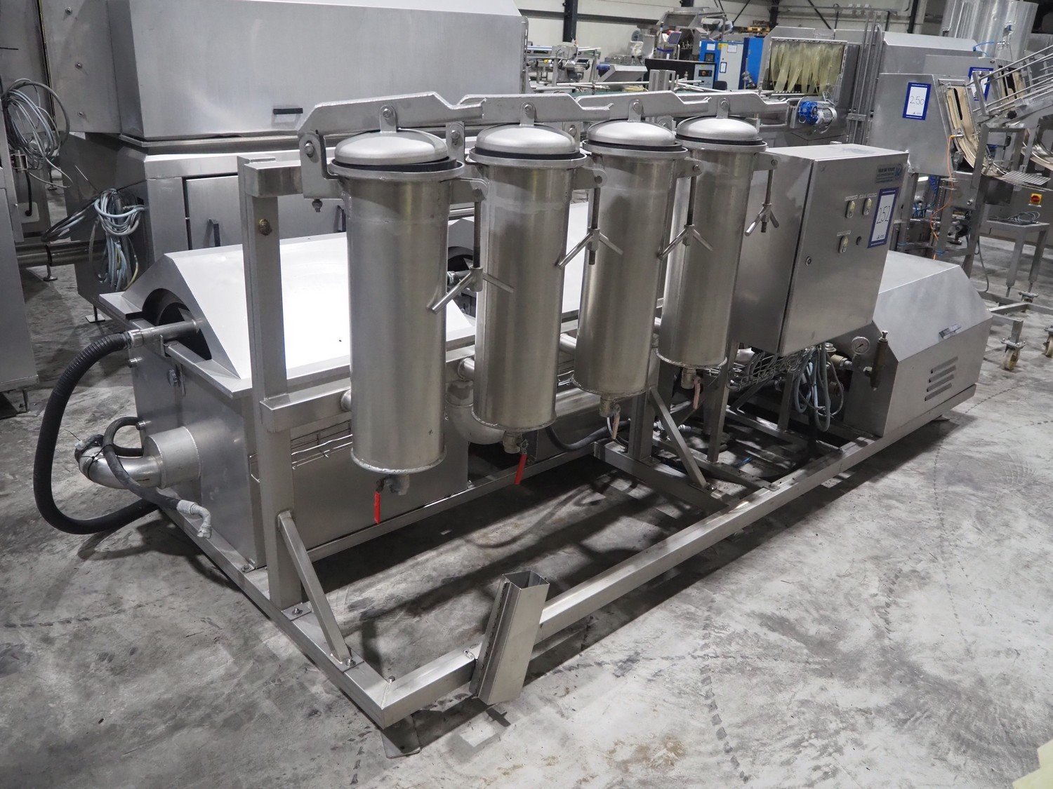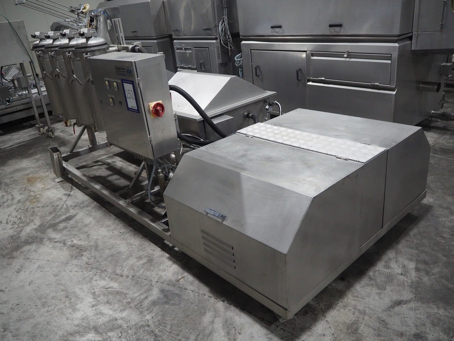 Van de Vecht de-sticker machine, 4 stations, inside dimensions: Ø 180 mm x 380 mm, total dimensions: 3200 mm x 1500 mm x 1440 mm.