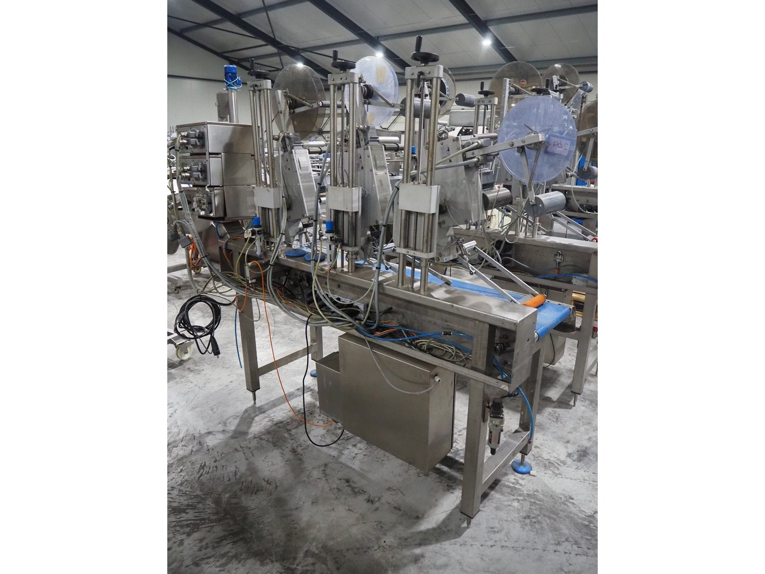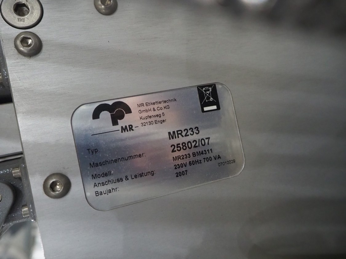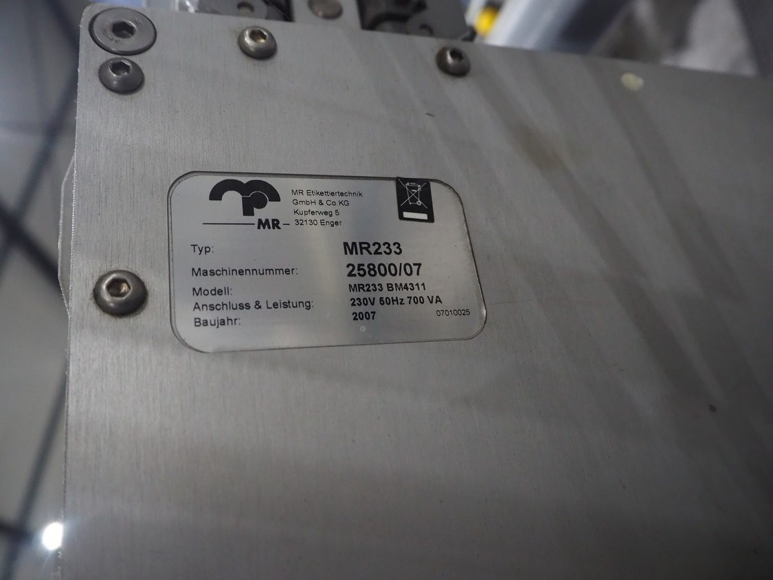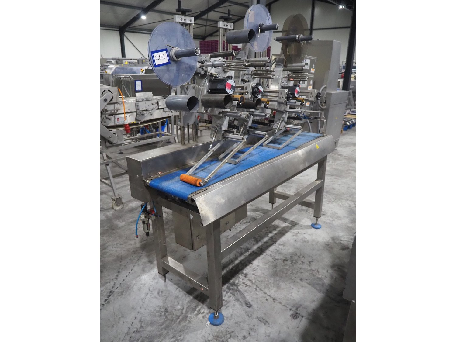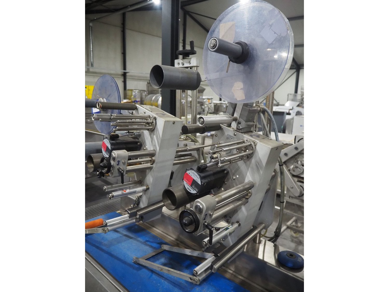 Espera labelling machine with 3 MR Etikettiertechnik labellers, Espera model: ES 7000, labeller type: (3x) MR233, year of construction: 2007, 230 V, 50 Hz, maximum label width: 150 mm, plastic belts, belt width: 350 mm, total dimensions: 2050 mm x 750 mm x 1950 mm.