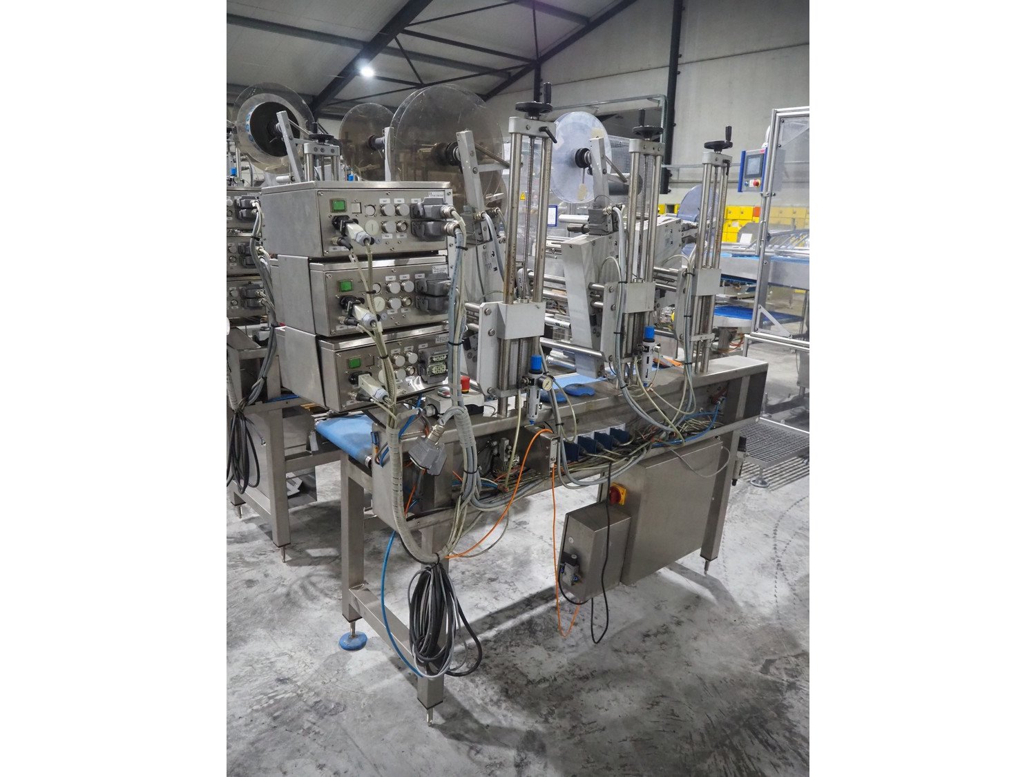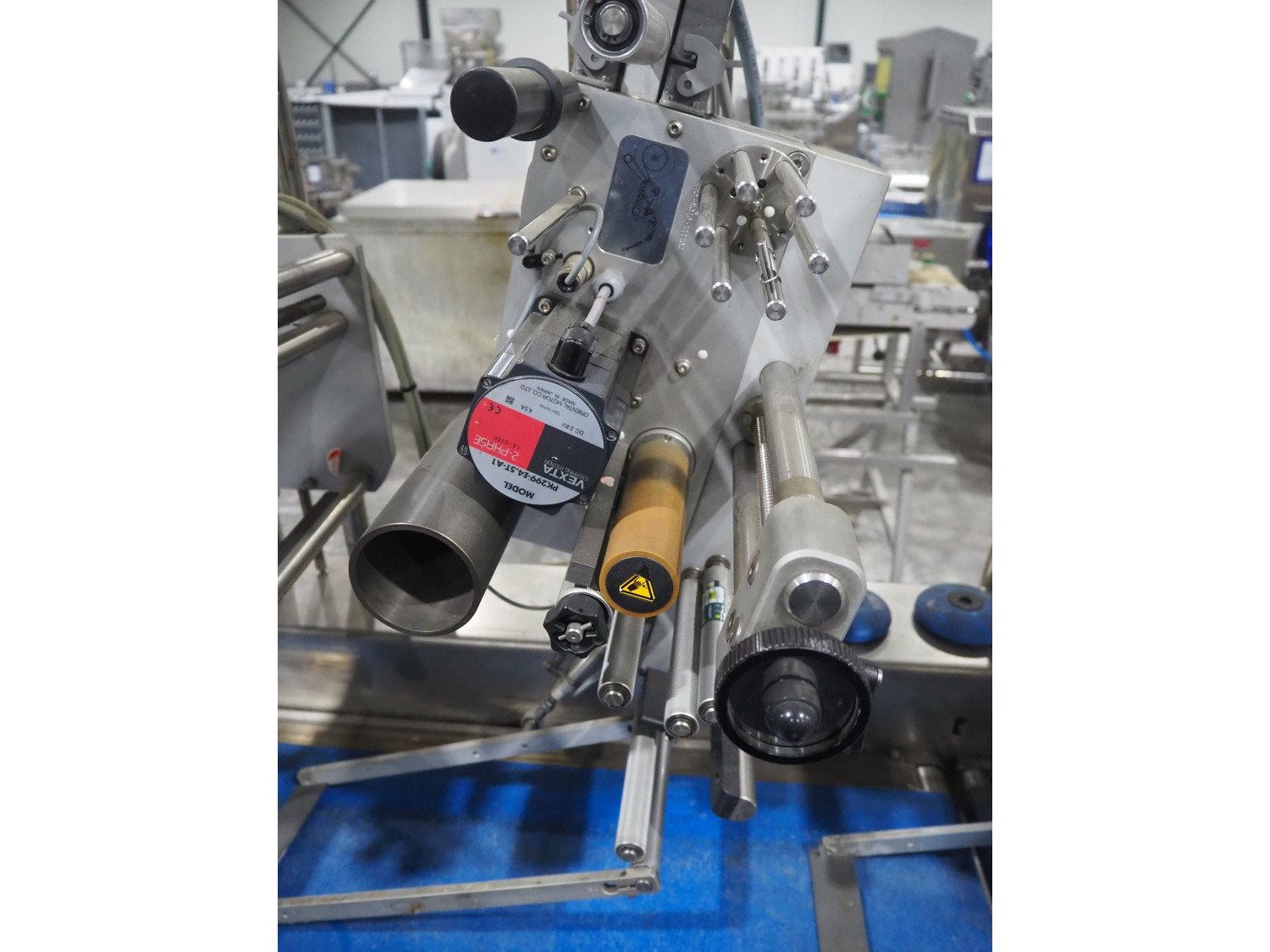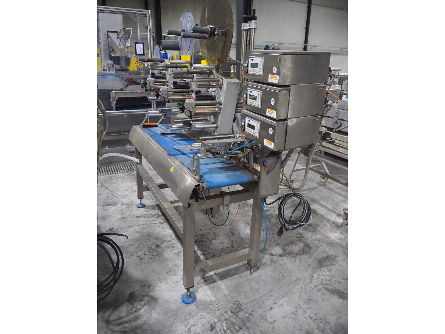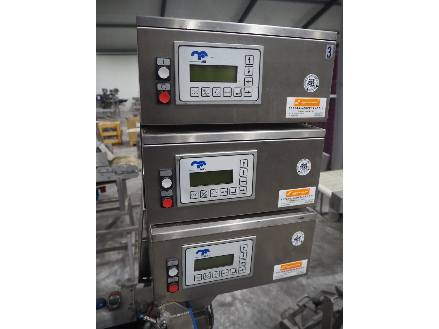 Espera labelling machine with 3 MR Etikettiertechnik labellers, Espera model: ES 7000, labeller type: (3x) MR233, year of construction: 2007, 230 V, 50 Hz, maximum label width: 150 mm, plastic belts, belt width: 350 mm, total dimensions: 2050 mm x 750 mm x 1950 mm.