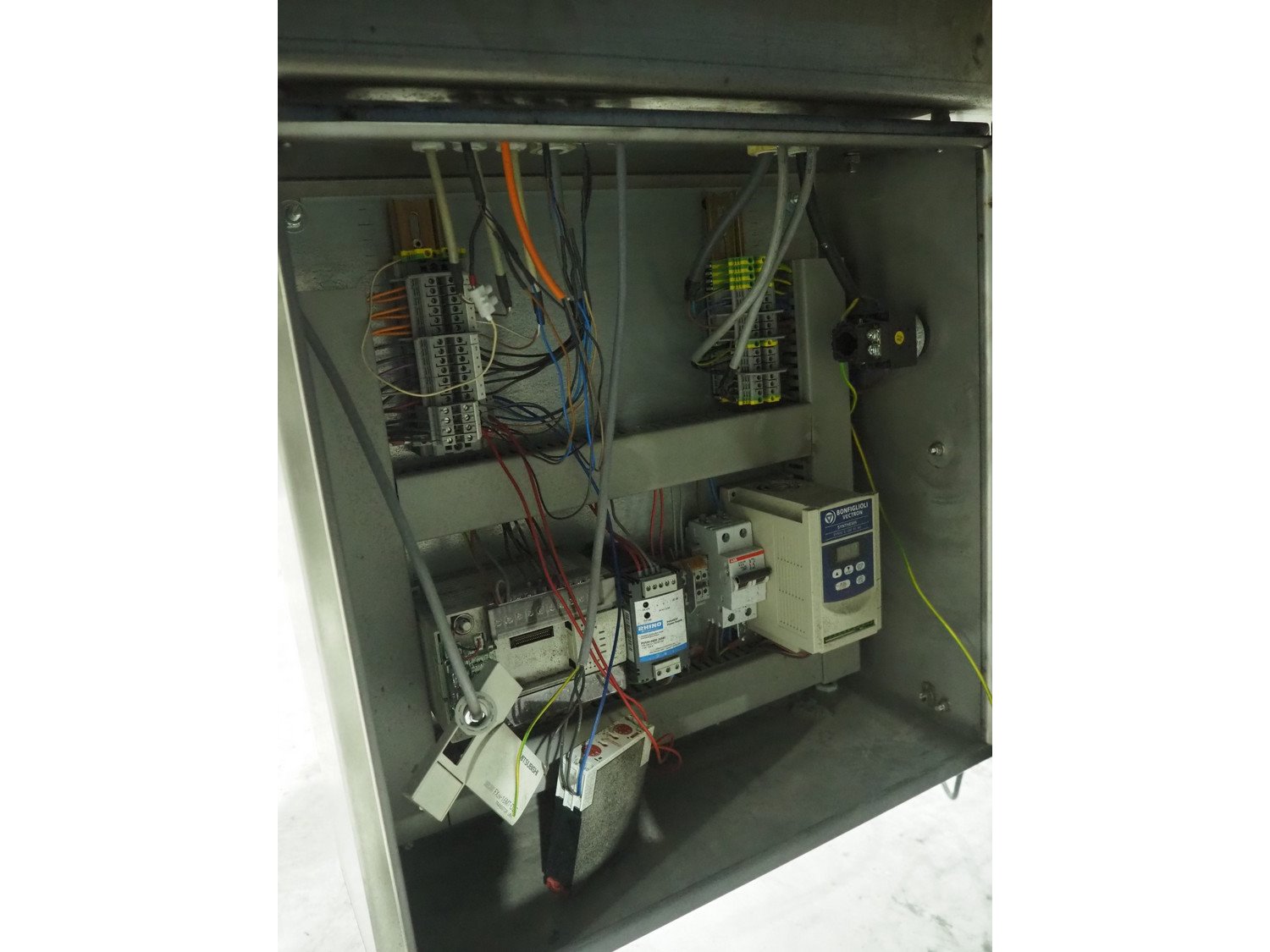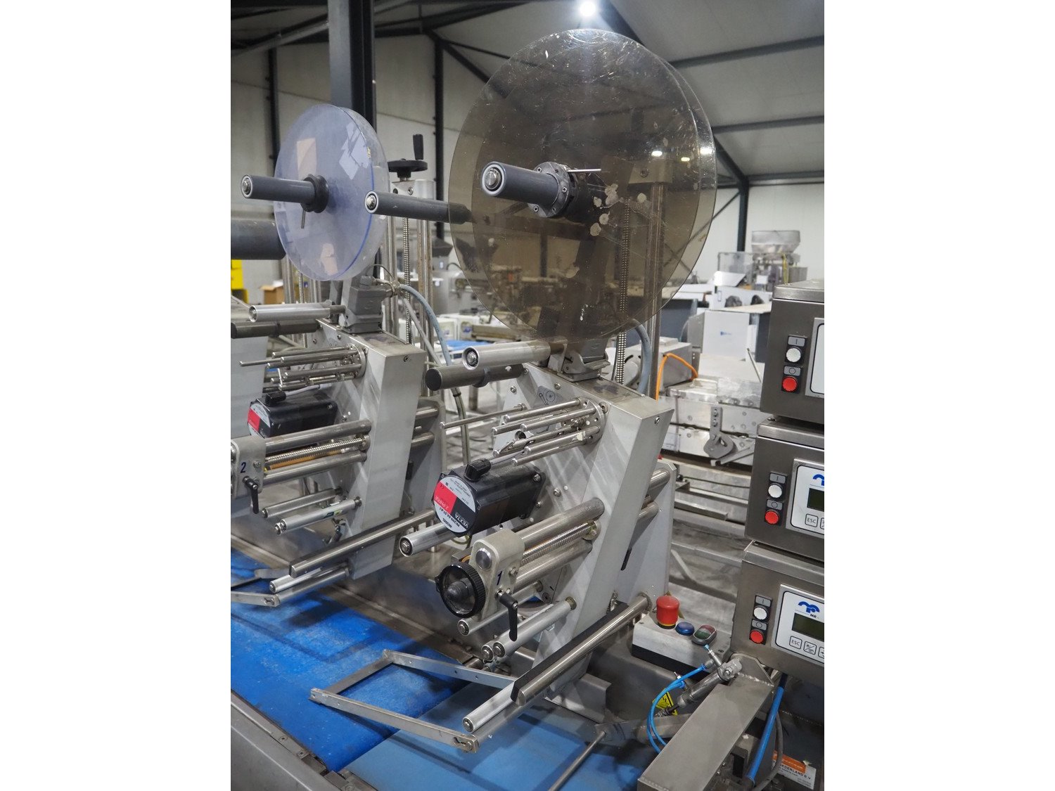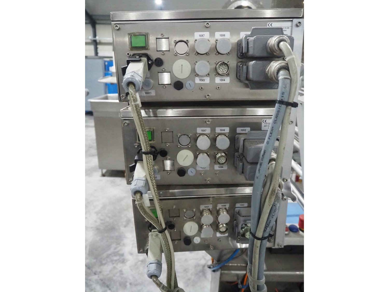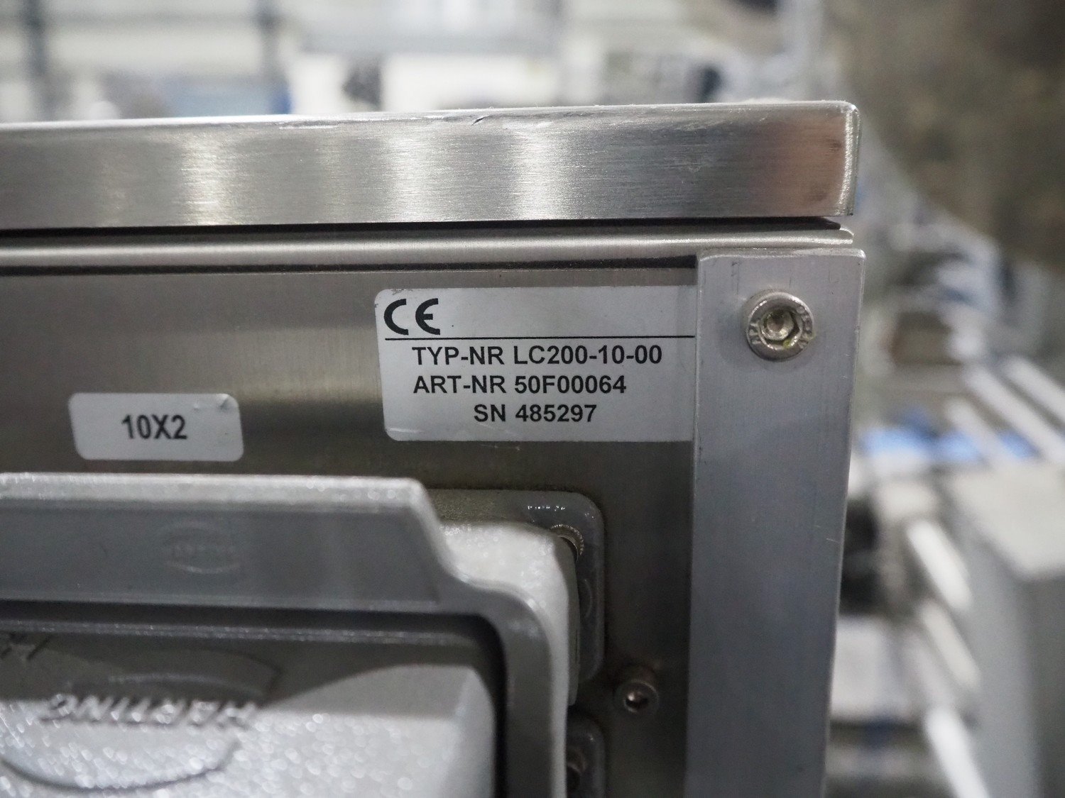 Espera labelling machine with 3 MR Etikettiertechnik labellers, Espera model: ES 7000, labeller type: (3x) MR233, year of construction: 2007, 230 V, 50 Hz, maximum label width: 150 mm, plastic belts, belt width: 350 mm, total dimensions: 2050 mm x 750 mm x 1950 mm.