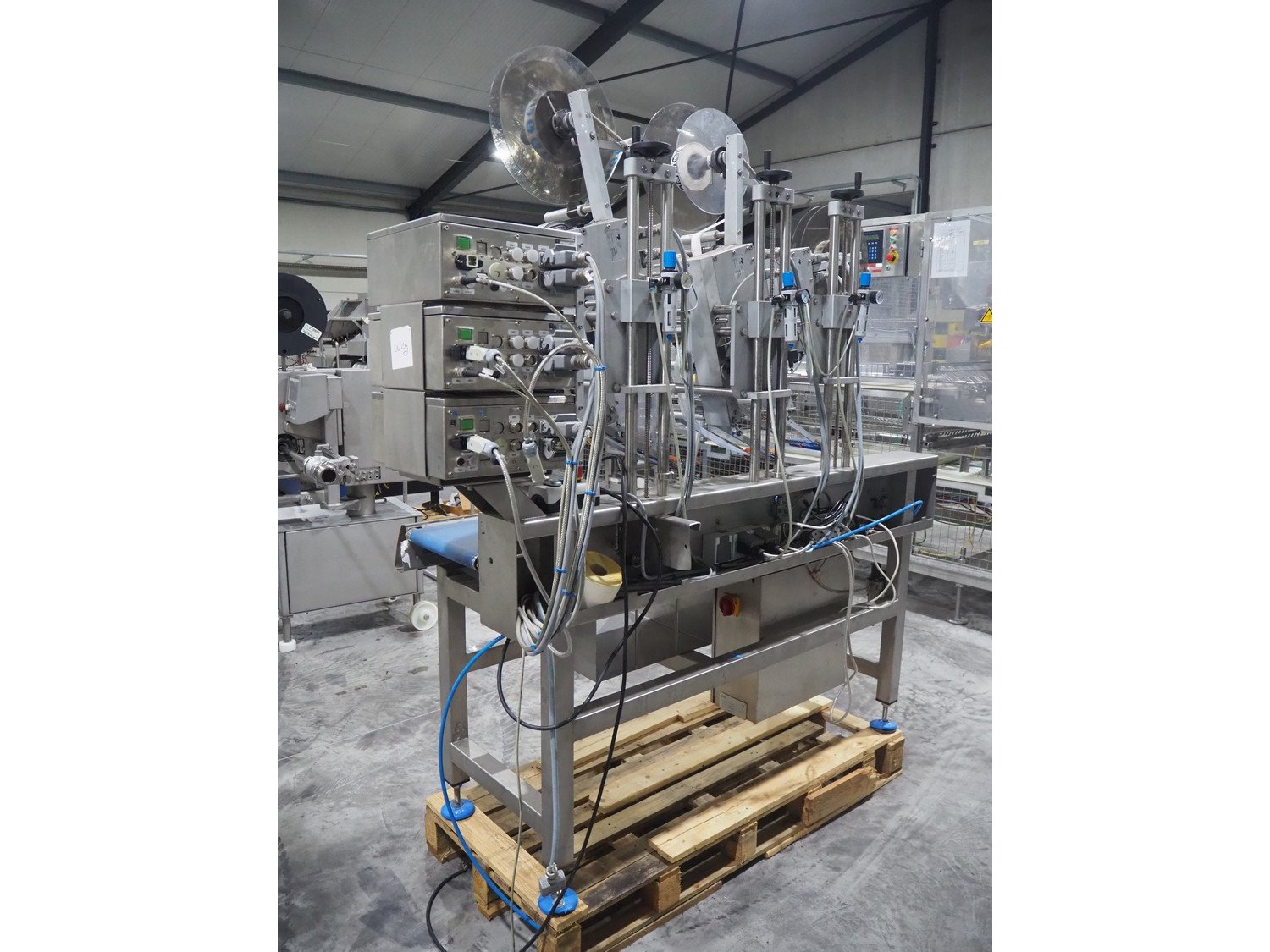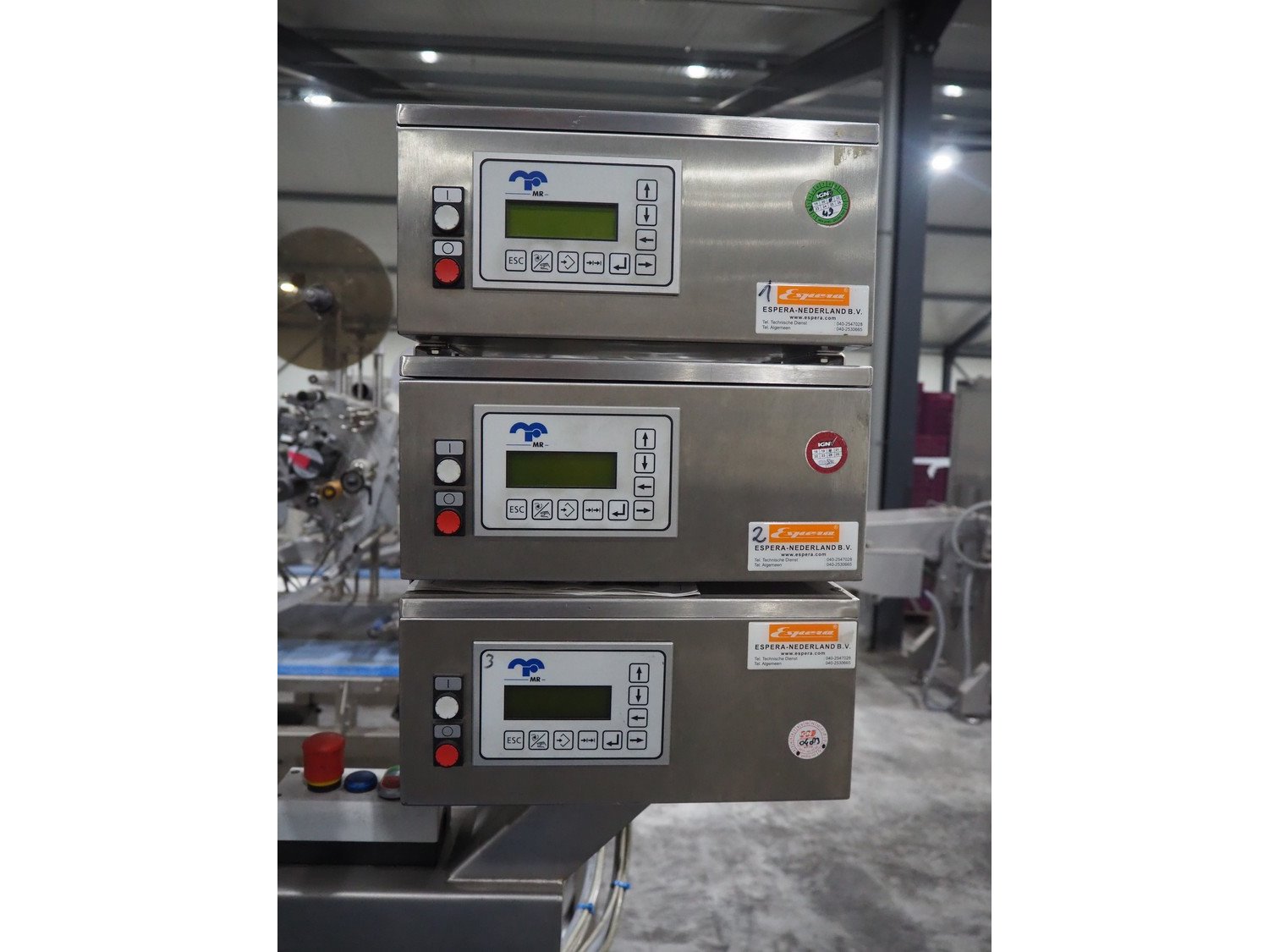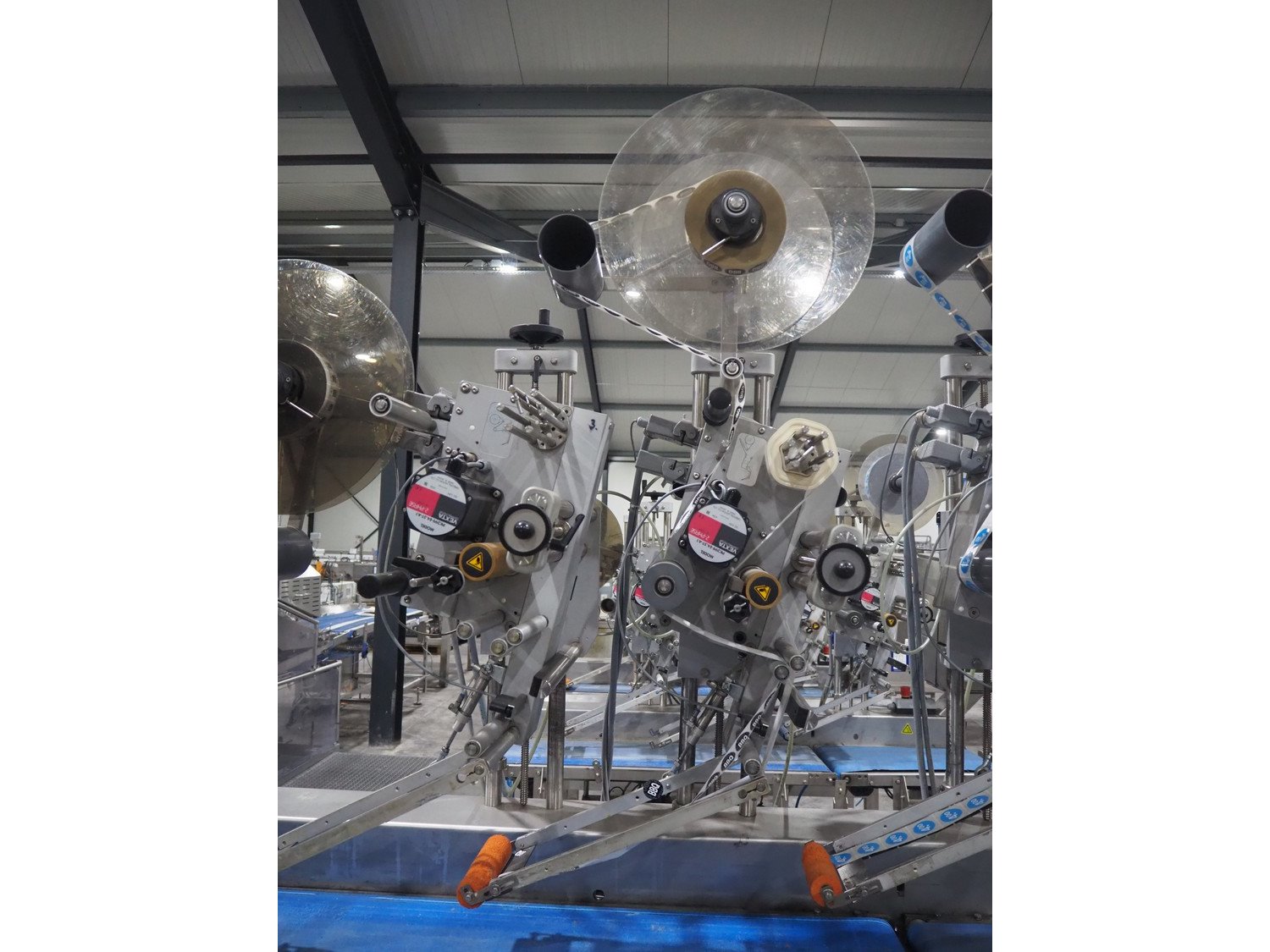 Espera labelling machine with 3 MR Etikettiertechnik labellers, Espera model: ES 7000, labeller type: (3x) MR233, year of construction: 2007, 230 V, 50 Hz, maximum label width: 150 mm, plastic belts, belt width: 350 mm, total dimensions: 2000 mm x 750 mm x 2200 mm.