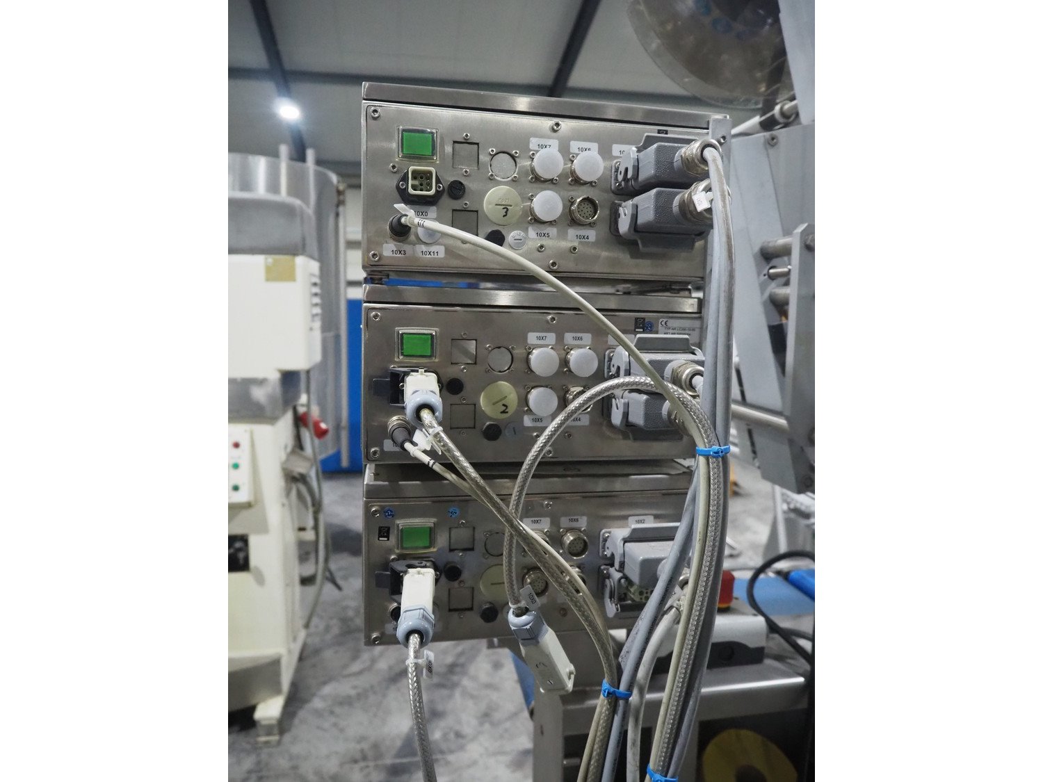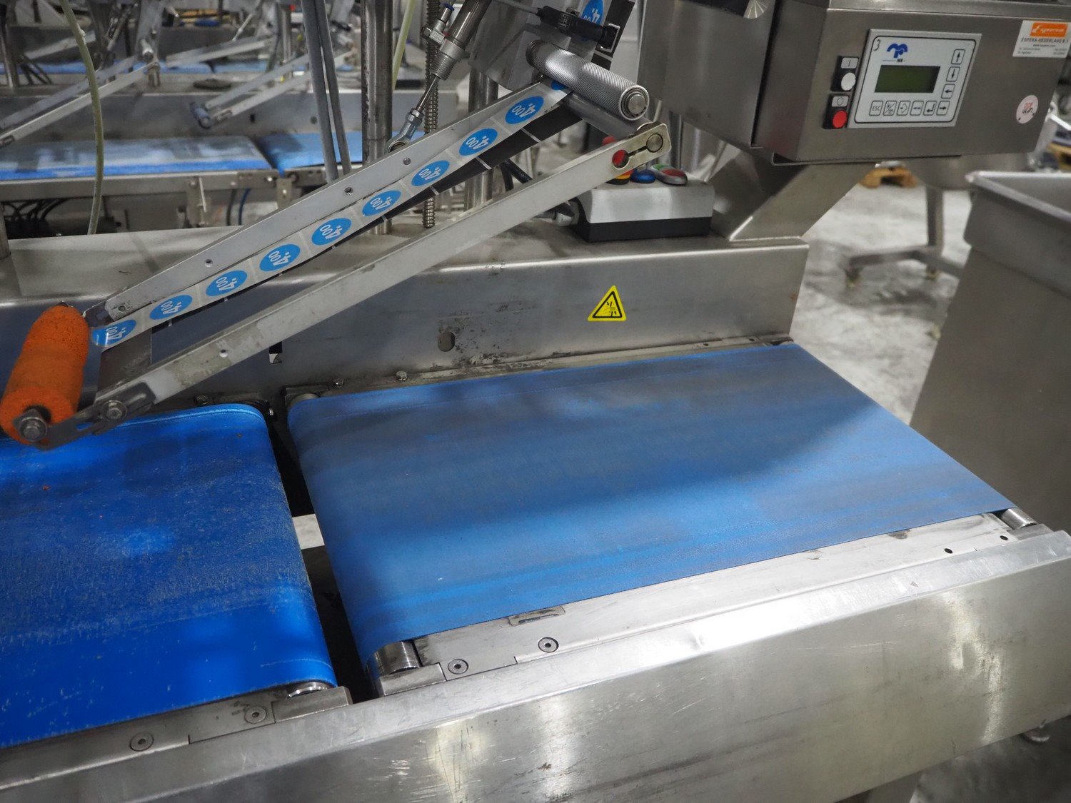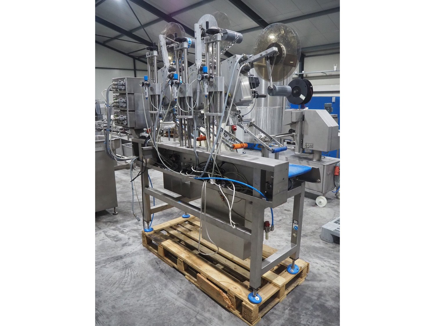 Espera labelling machine with 3 MR Etikettiertechnik labellers, Espera model: ES 7000, labeller type: (3x) MR233, year of construction: 2007, 230 V, 50 Hz, maximum label width: 150 mm, plastic belts, belt width: 350 mm, total dimensions: 2000 mm x 750 mm x 2200 mm.