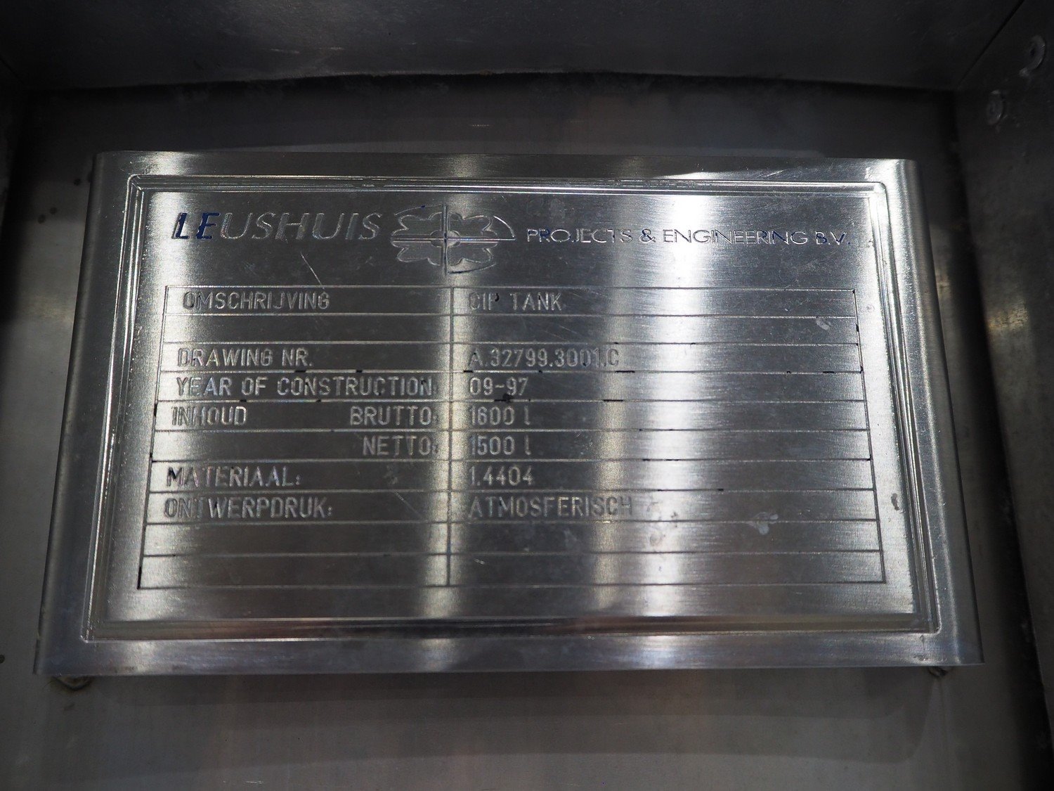 Leushuis insulated tank, number: A.32799.3001.C, year of construction: 09-97, capacity: 1500 liter, dimensions: Ø 1400 mm x 2550 mm.