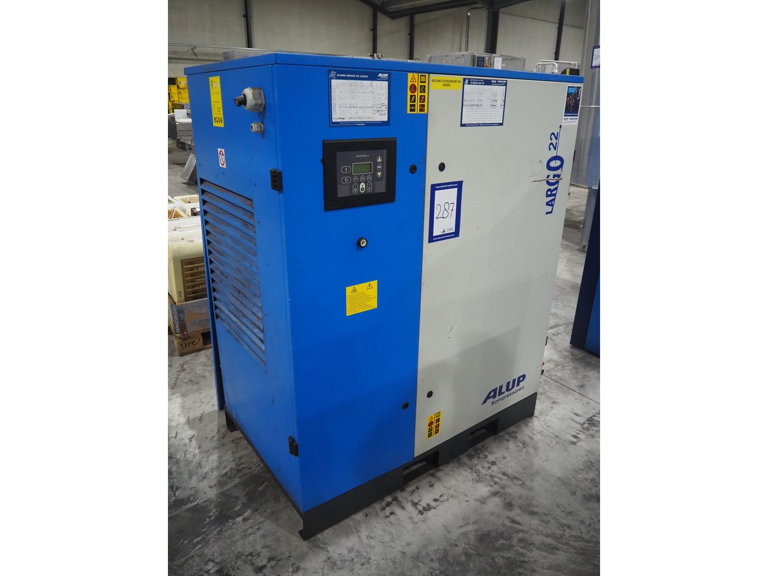 Alup Kompressoren GmbH compressor, type: LARGO 22-10, serial number: CAI465970, year of construction: 2011, 400 V, 3 Ph,50 Hz, 22 kW, 10 bar, weight: 496 kg, dimensions: 1500 mm x 800 mm x 1550 mm.