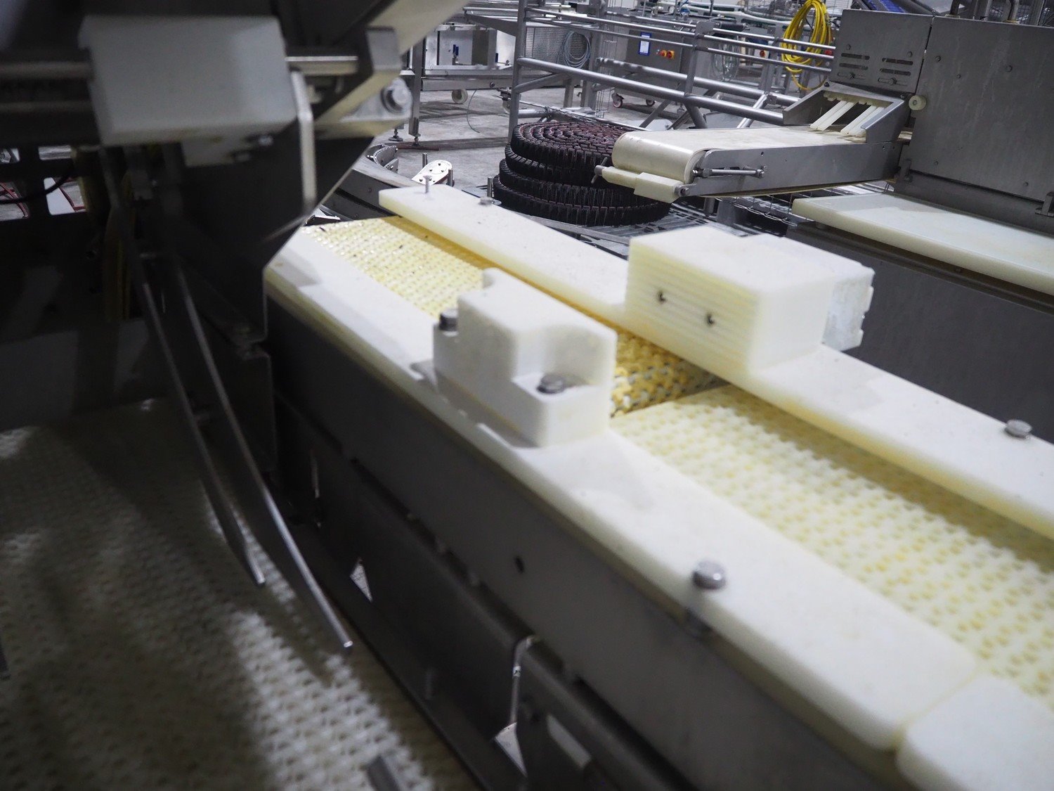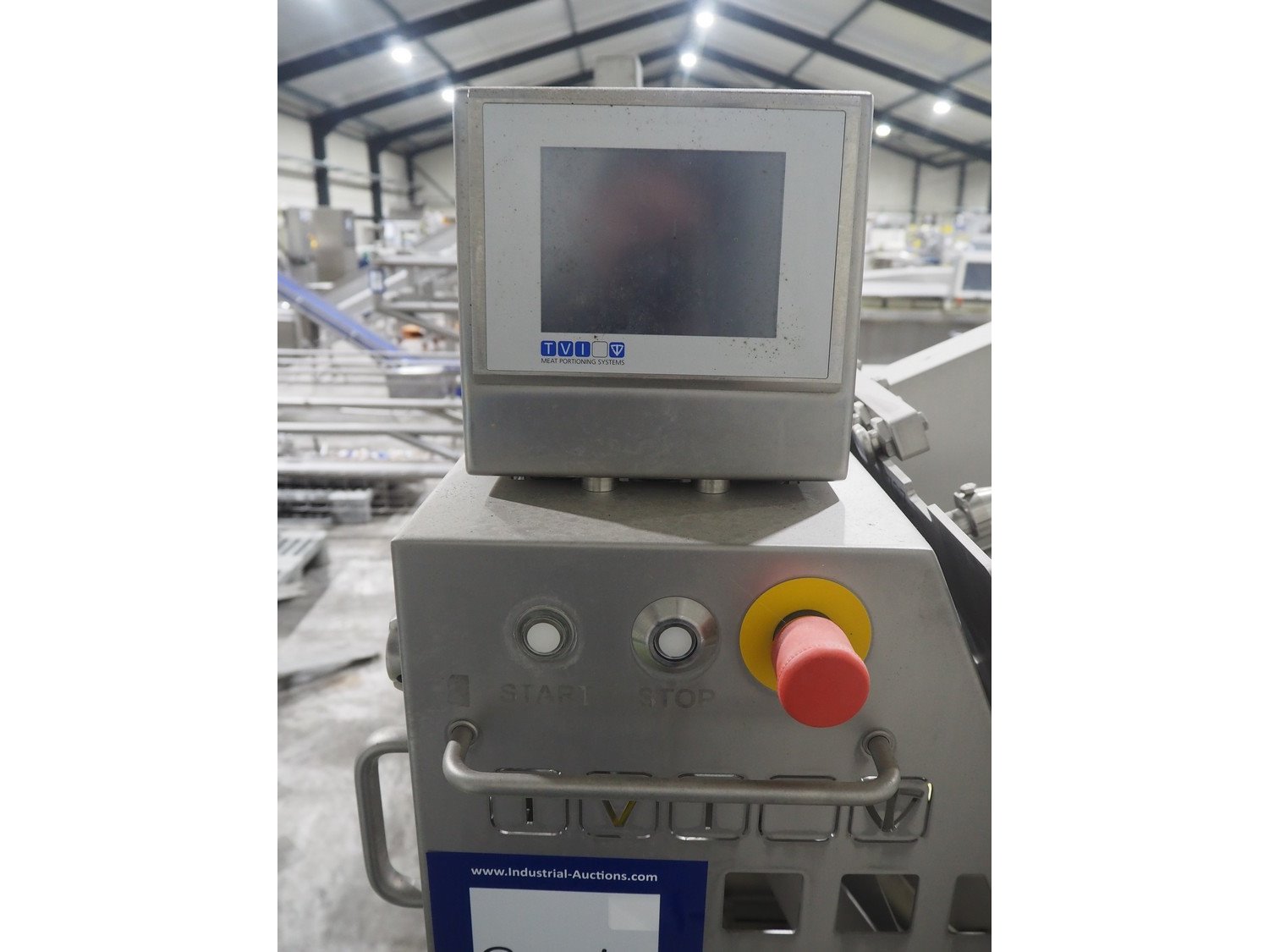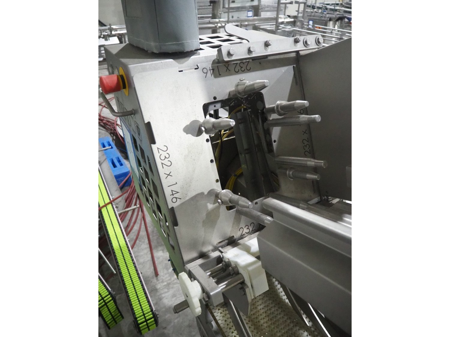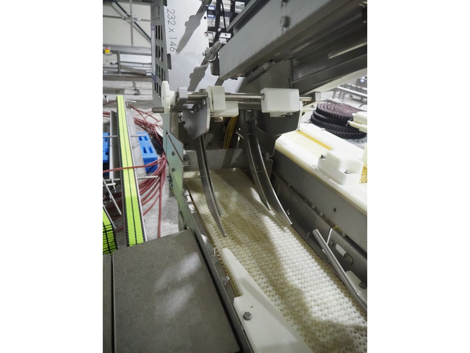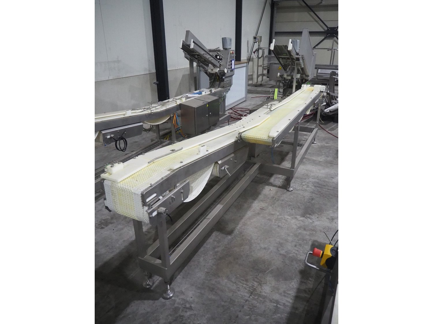 TVI Entwicklung & Produktion GmbH tray denester, type: TDS 300, serial number: 115, year of construction: 2012, 400 V, 3 Ph, weight: 70 Kg, dye: 232 mm x 146 mm, plastic mesh belt, belt width: 250 mm, total dimensions: 4350 mm x 1000 mm x 1800 mm.