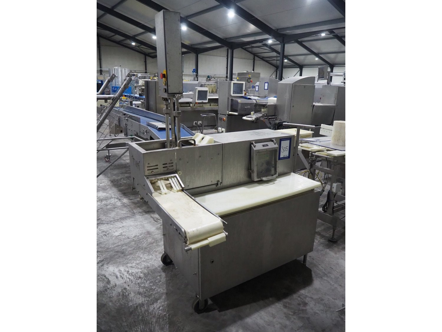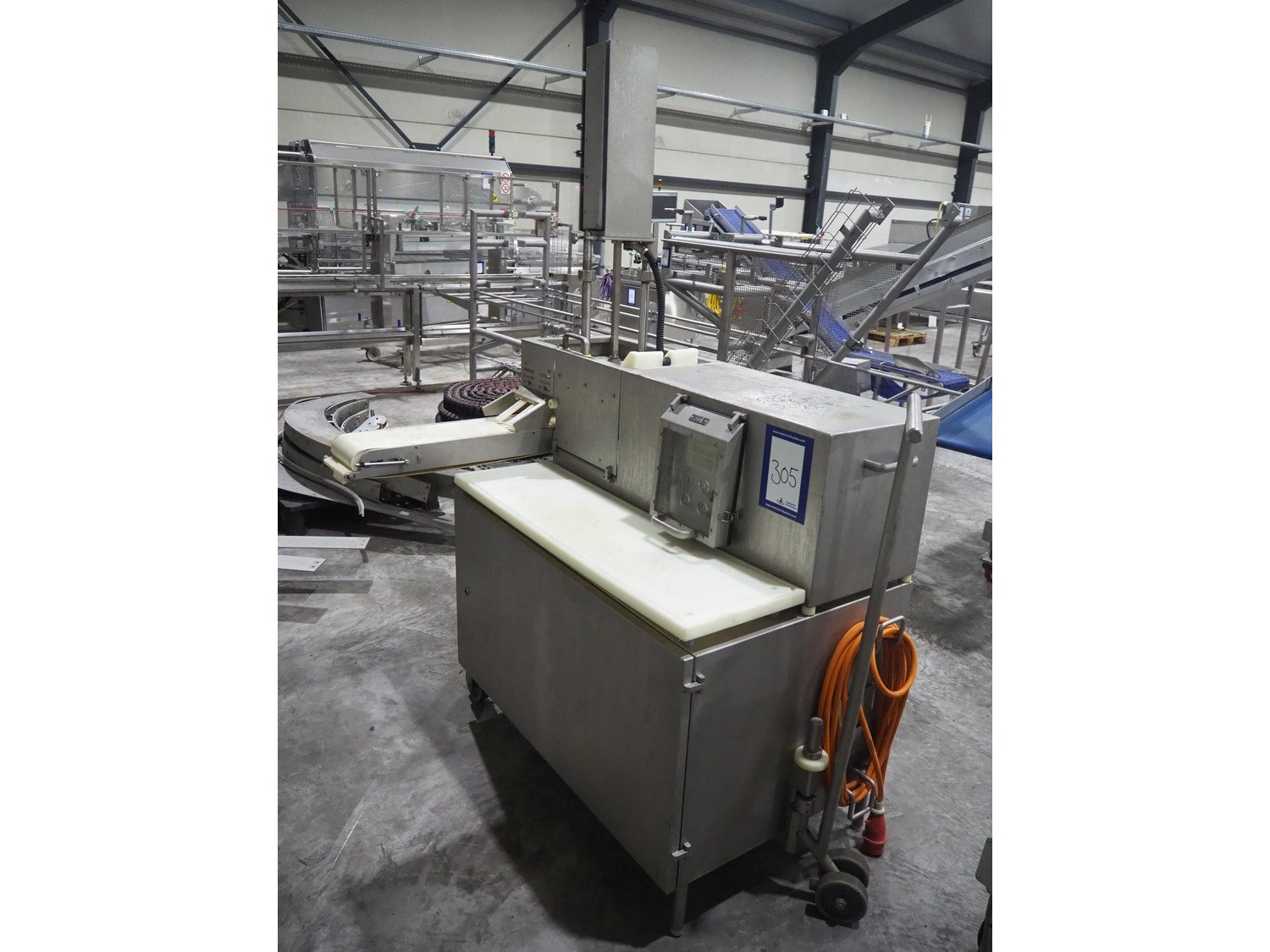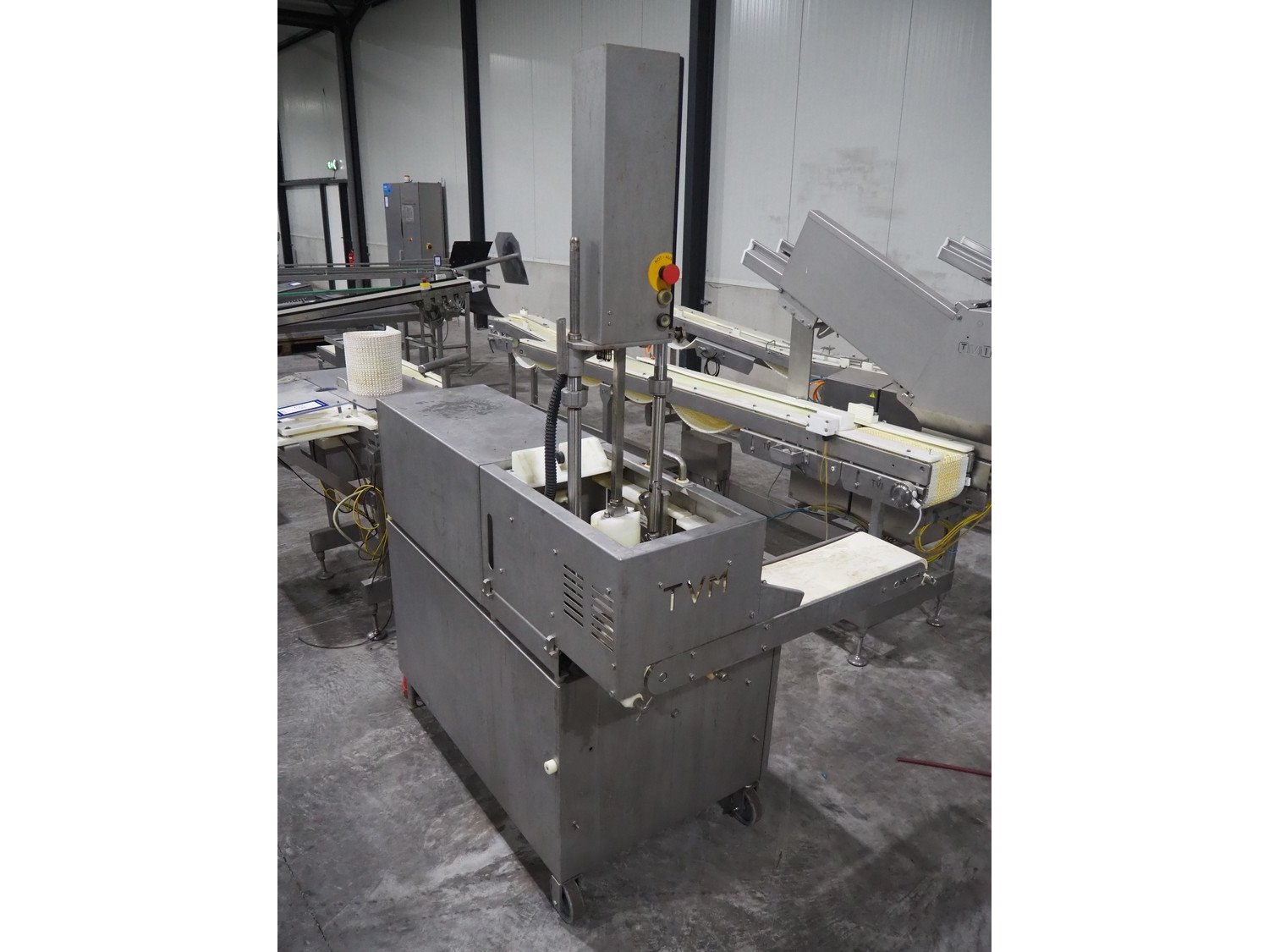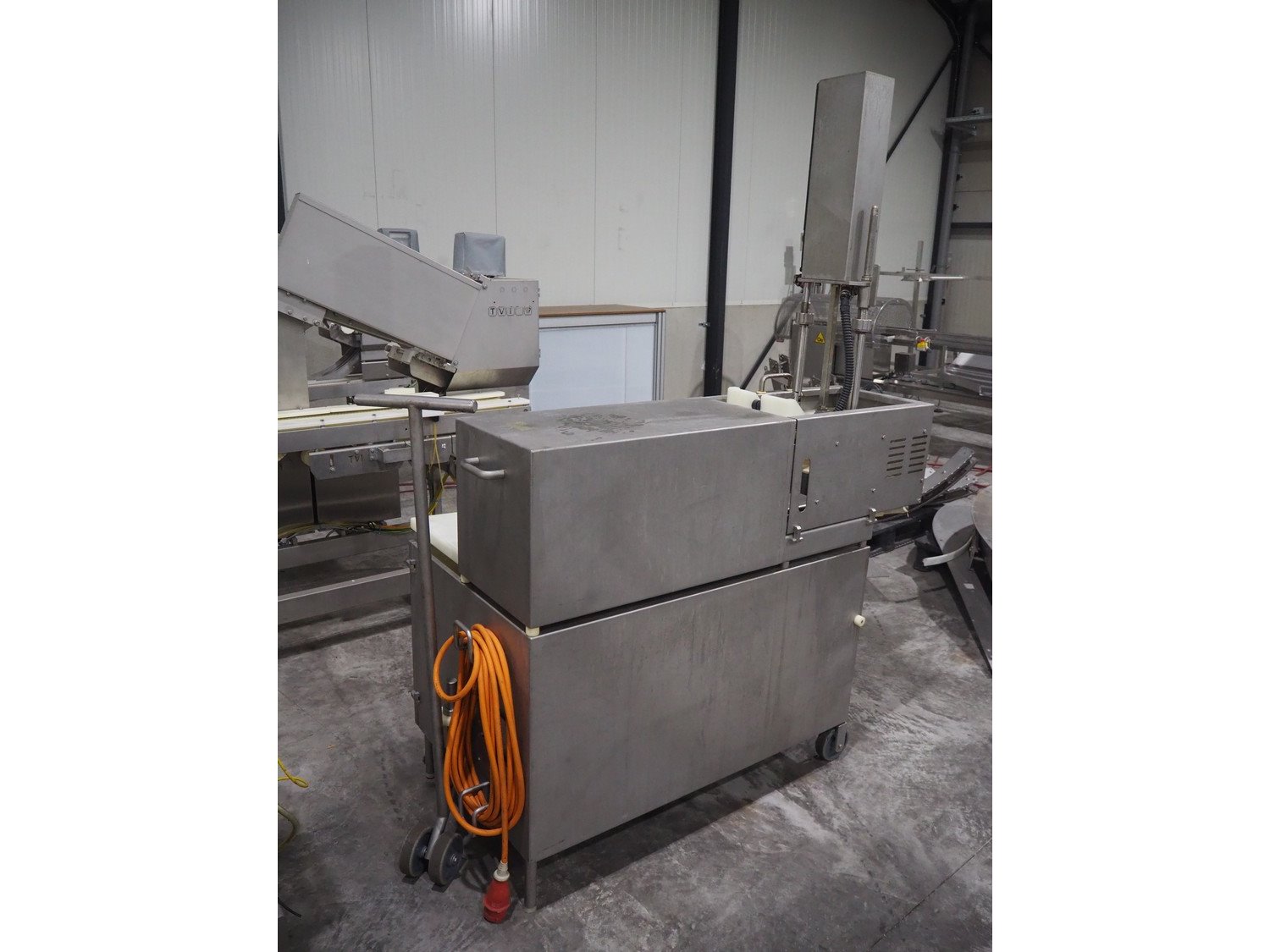 TVM mobile portioning machine, type: TVM - Portio 4000, serial number: 09-99.26445 138, year of construction: 1999, 400 V, 3 Ph, 50 Hz, 2.5 A, weight: 380 kg, plastic belt, belt width: 205 mm, total dimensions: 1600 mm x 1100 mm x 2100 mm. Including s/s trolley with parts, dimensions: 860 mm x 620 mm x 1800 mm.