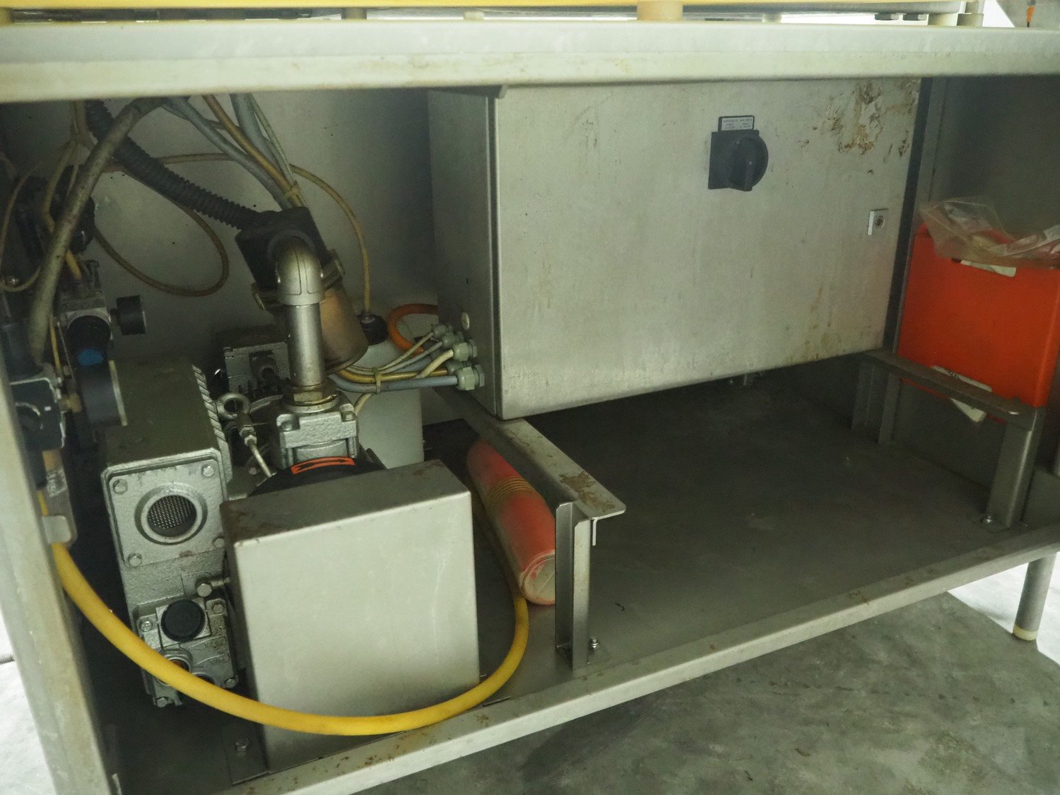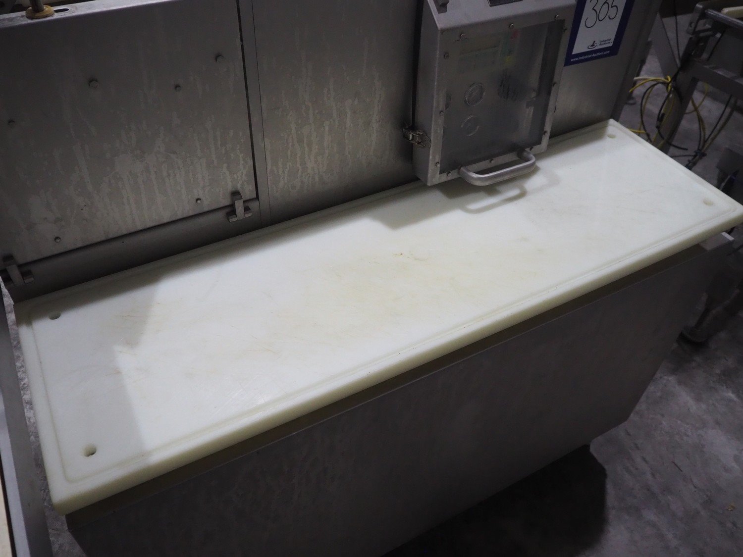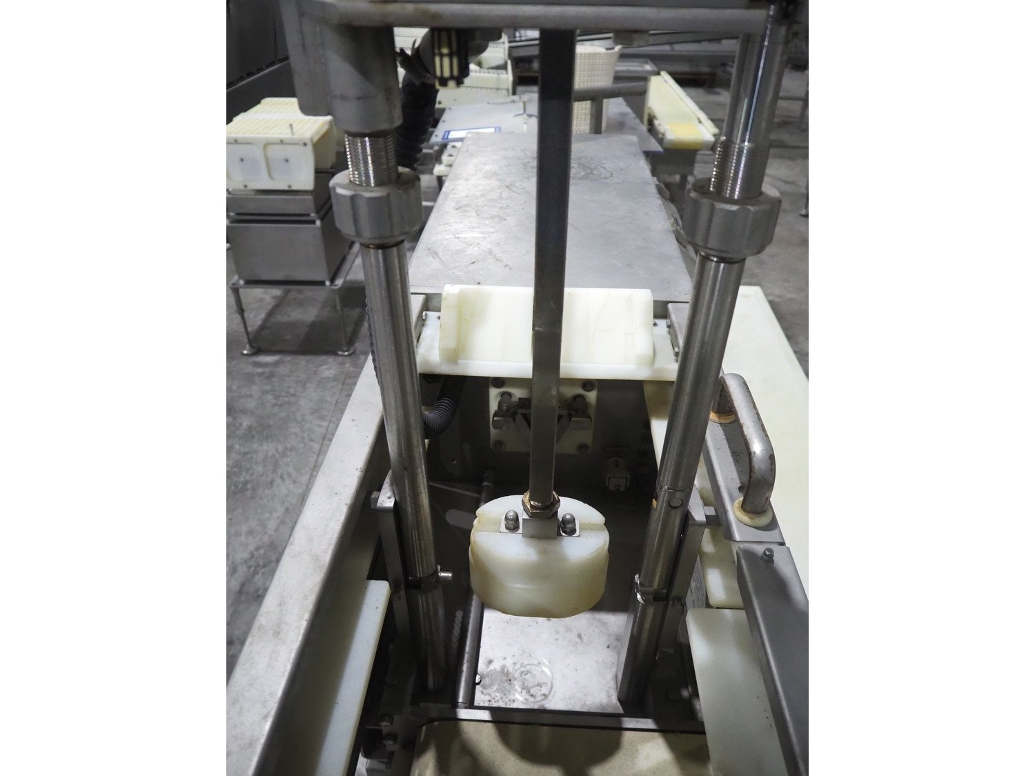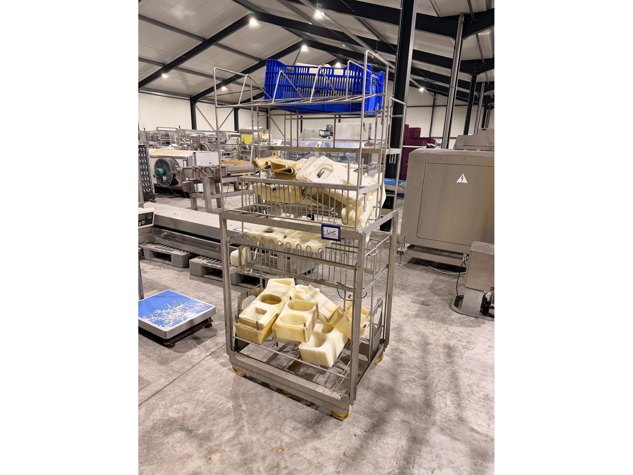 TVM mobile portioning machine, type: TVM - Portio 4000, serial number: 09-99.26445 138, year of construction: 1999, 400 V, 3 Ph, 50 Hz, 2.5 A, weight: 380 kg, plastic belt, belt width: 205 mm, total dimensions: 1600 mm x 1100 mm x 2100 mm. Including s/s trolley with parts, dimensions: 860 mm x 620 mm x 1800 mm.