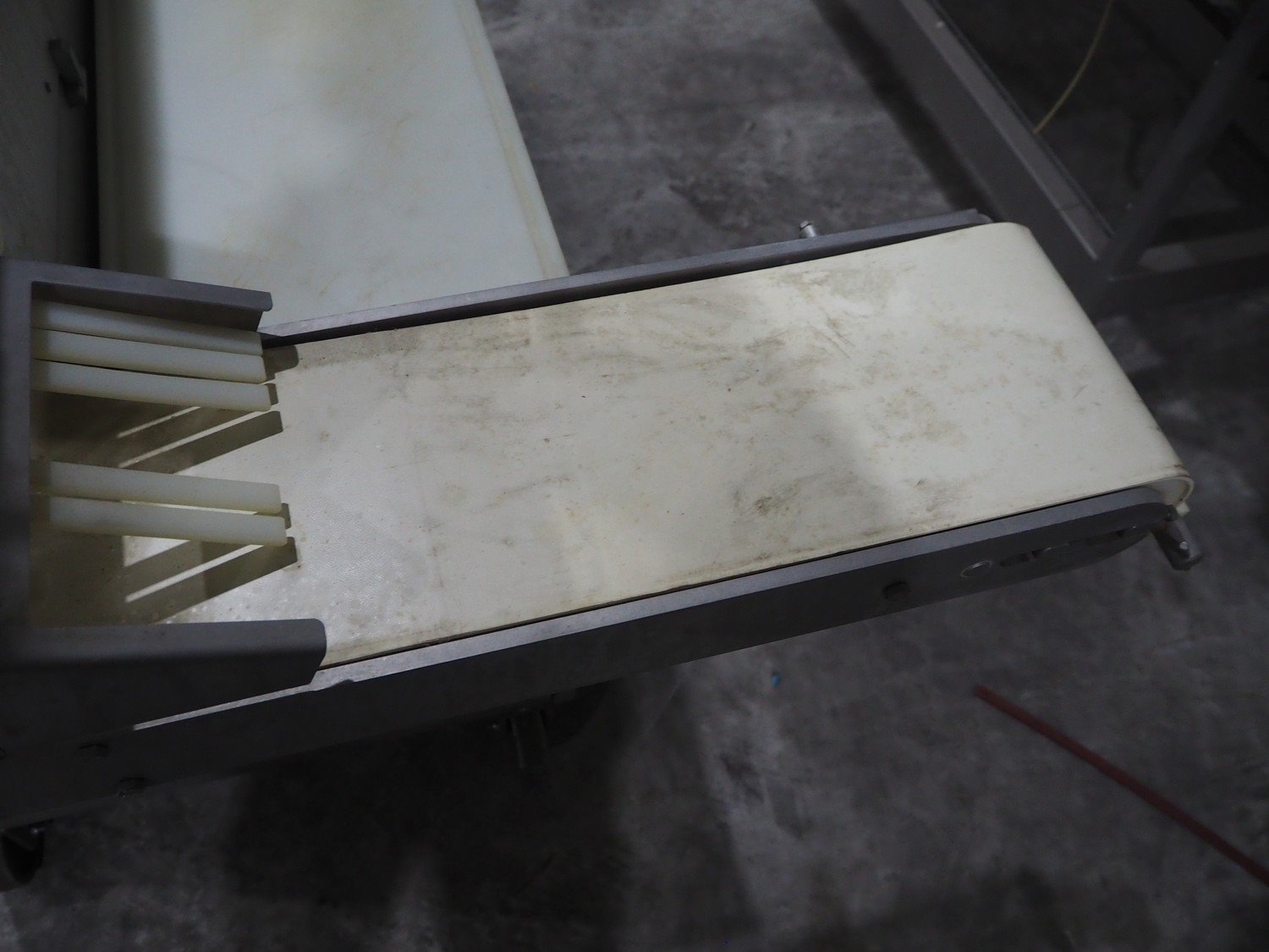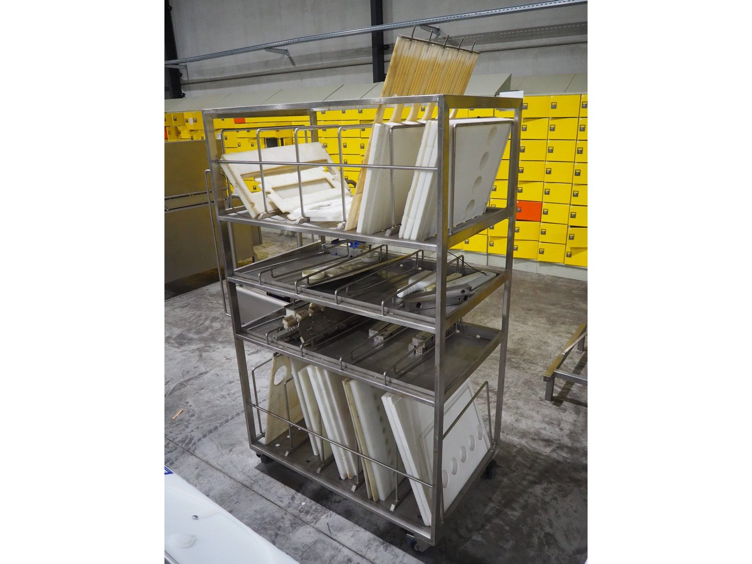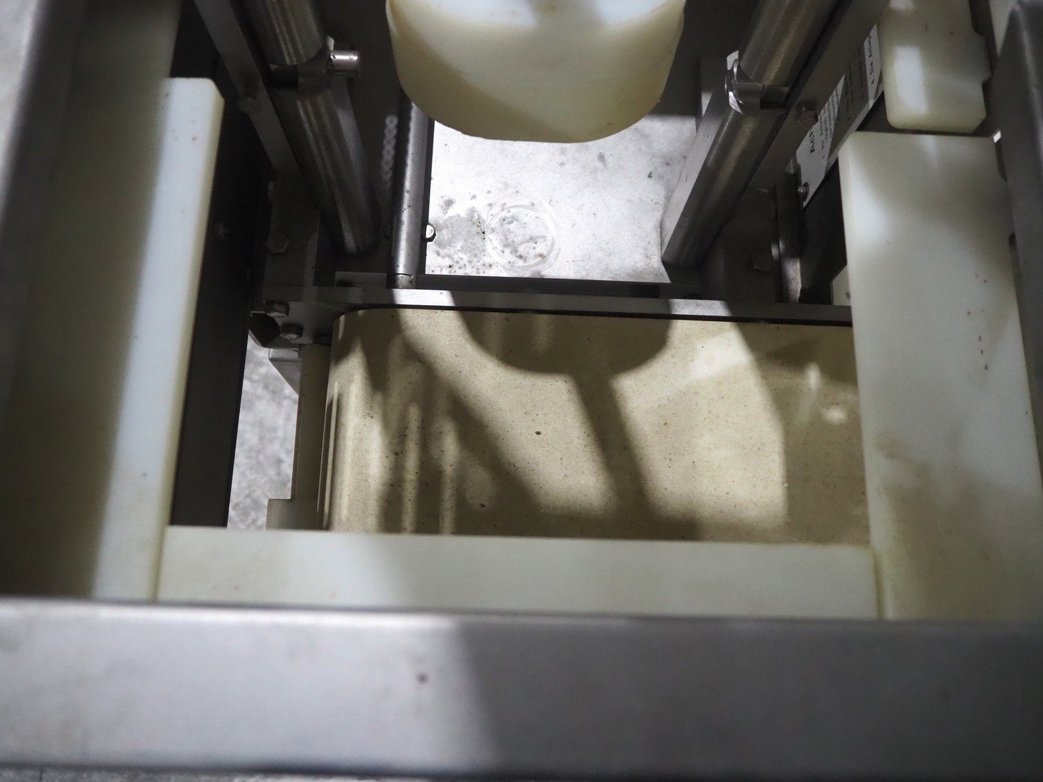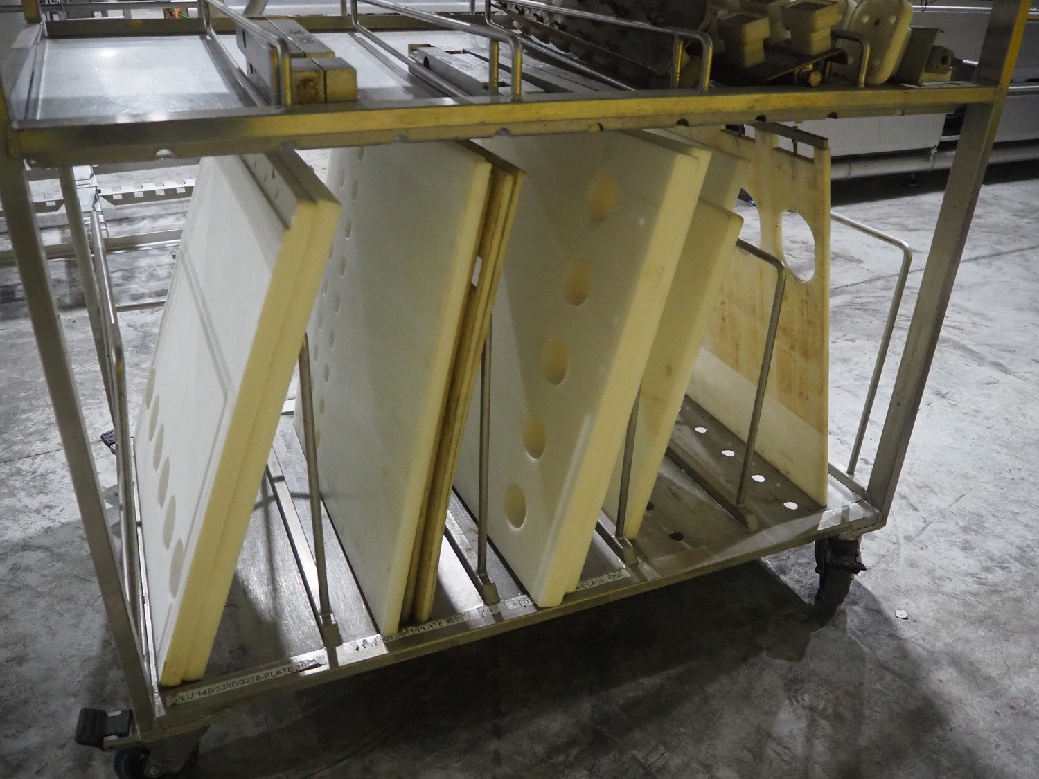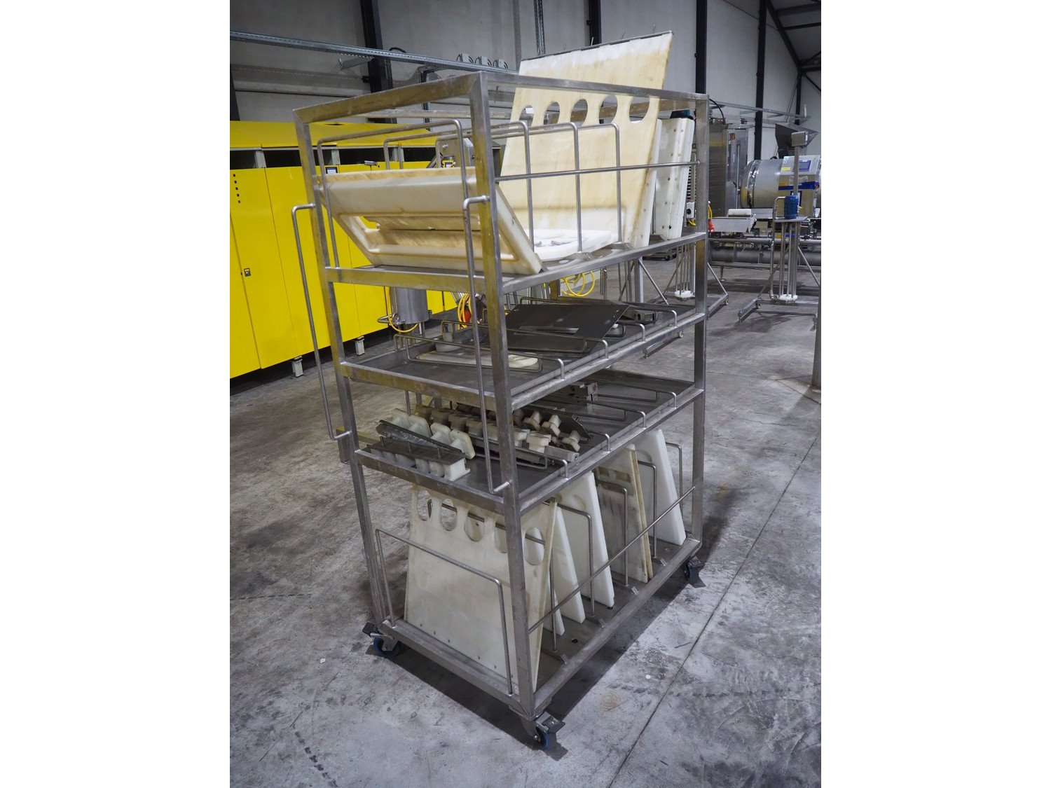 TVM mobile portioning machine, type: TVM - Portio 4000, serial number: 09-99.26445 138, year of construction: 1999, 400 V, 3 Ph, 50 Hz, 2.5 A, weight: 380 kg, plastic belt, belt width: 205 mm, total dimensions: 1600 mm x 1100 mm x 2100 mm. Including s/s trolley with parts, dimensions: 860 mm x 620 mm x 1800 mm.