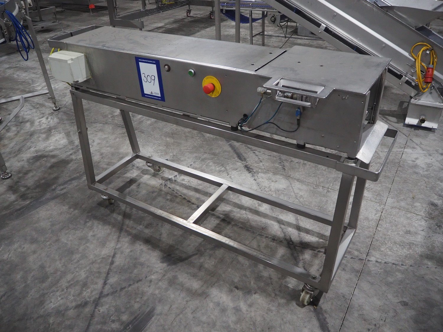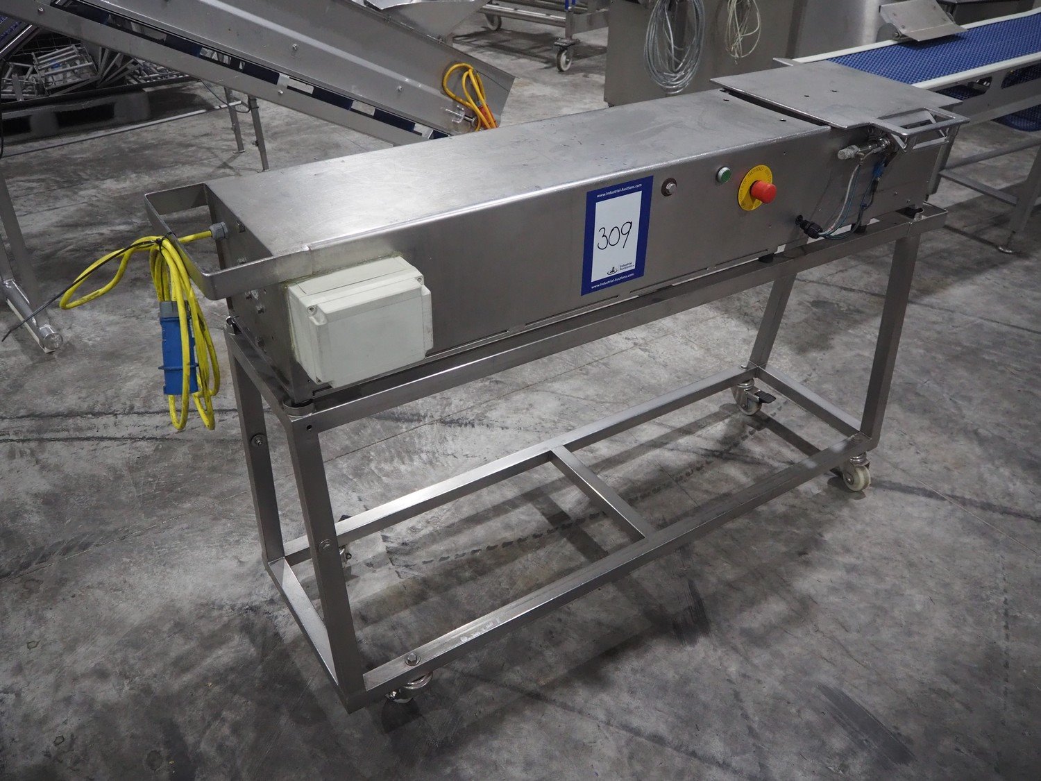 Mobile s/s meat press, dimensions: 1750 mm x 500 mm x 1000 mm. Incomplete.