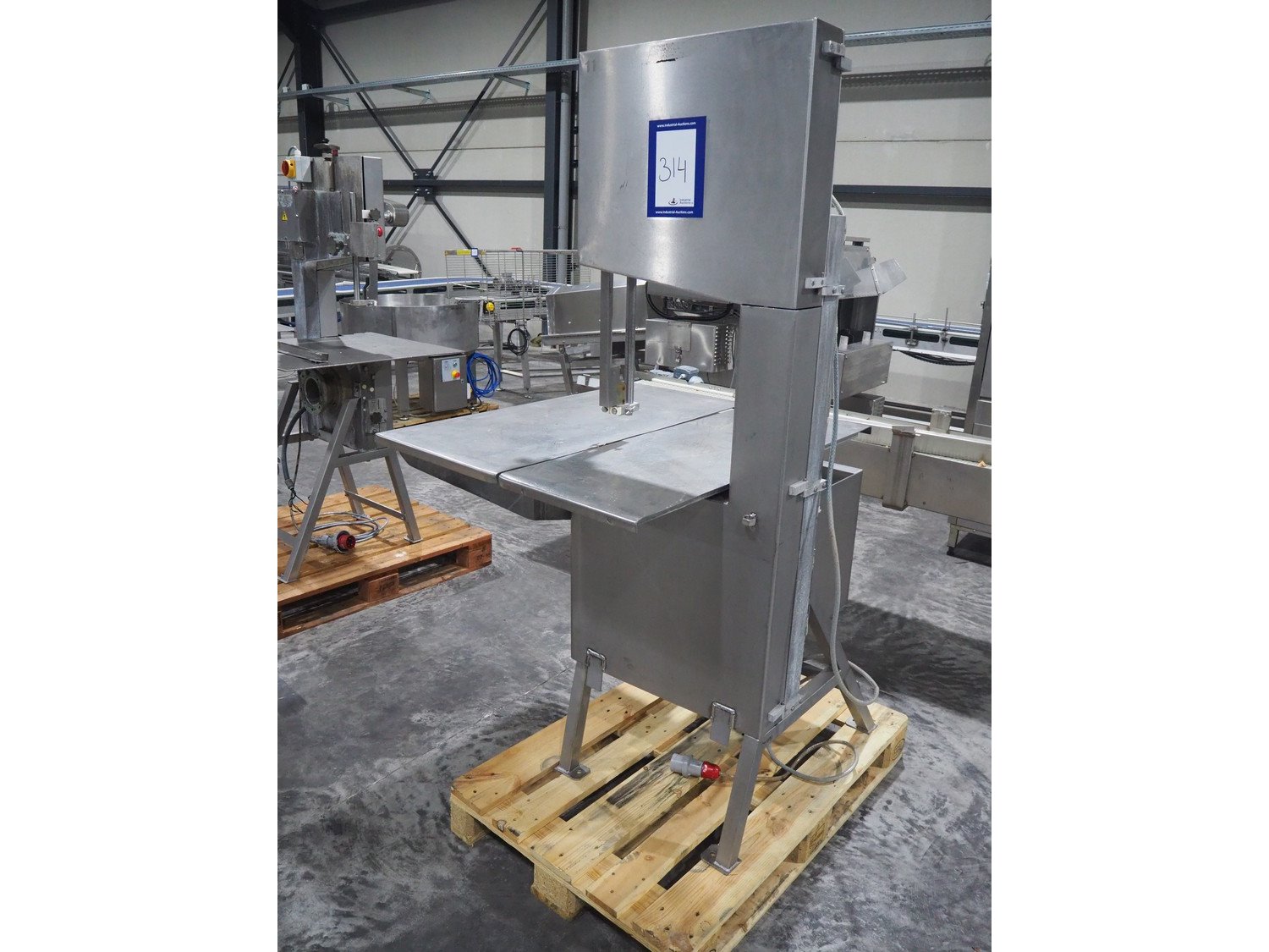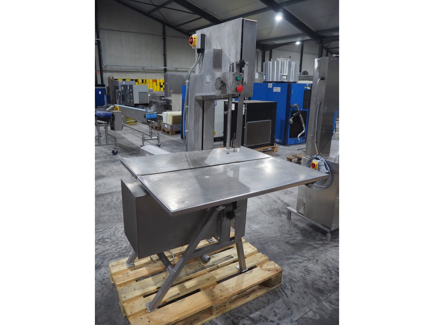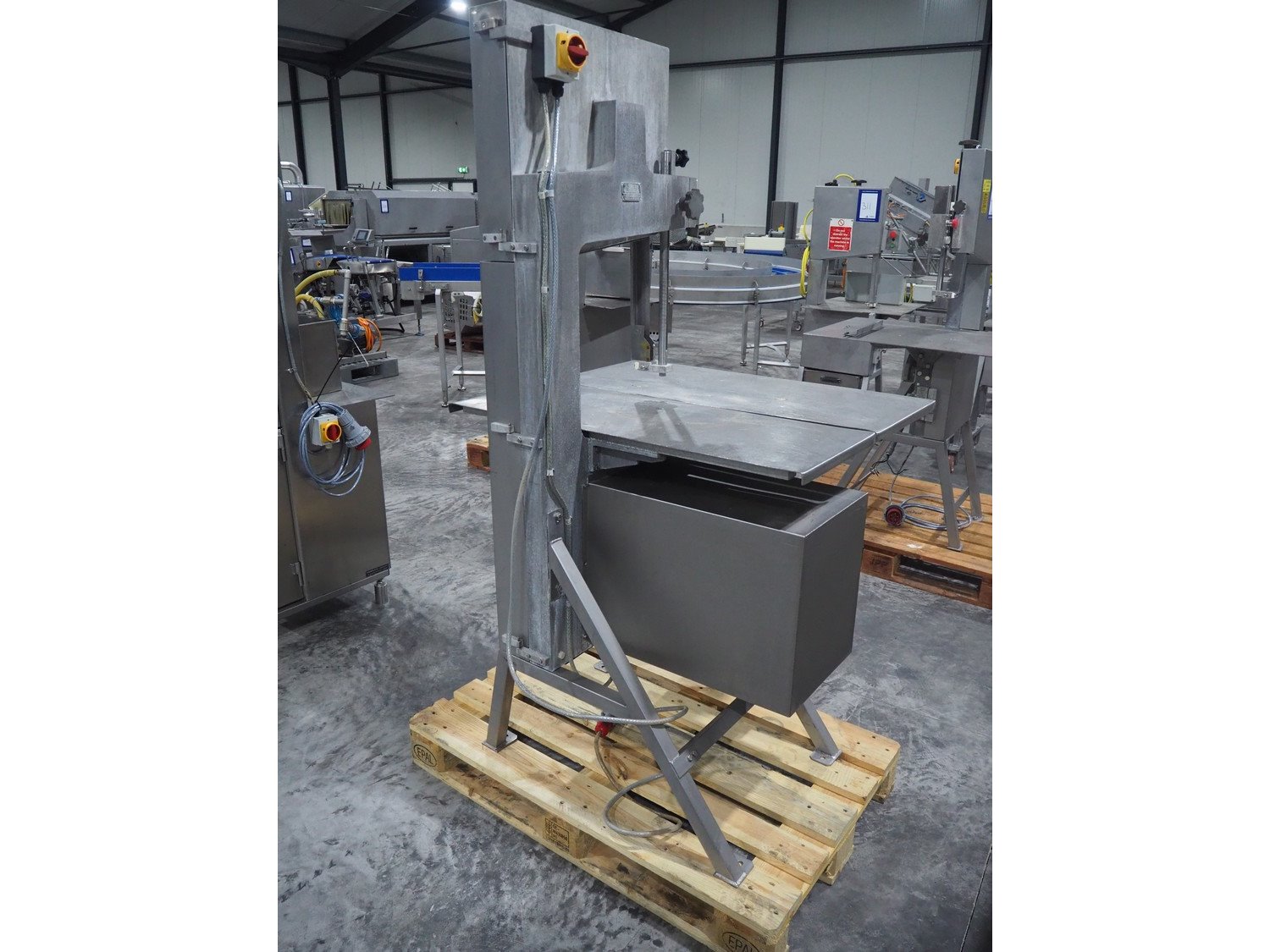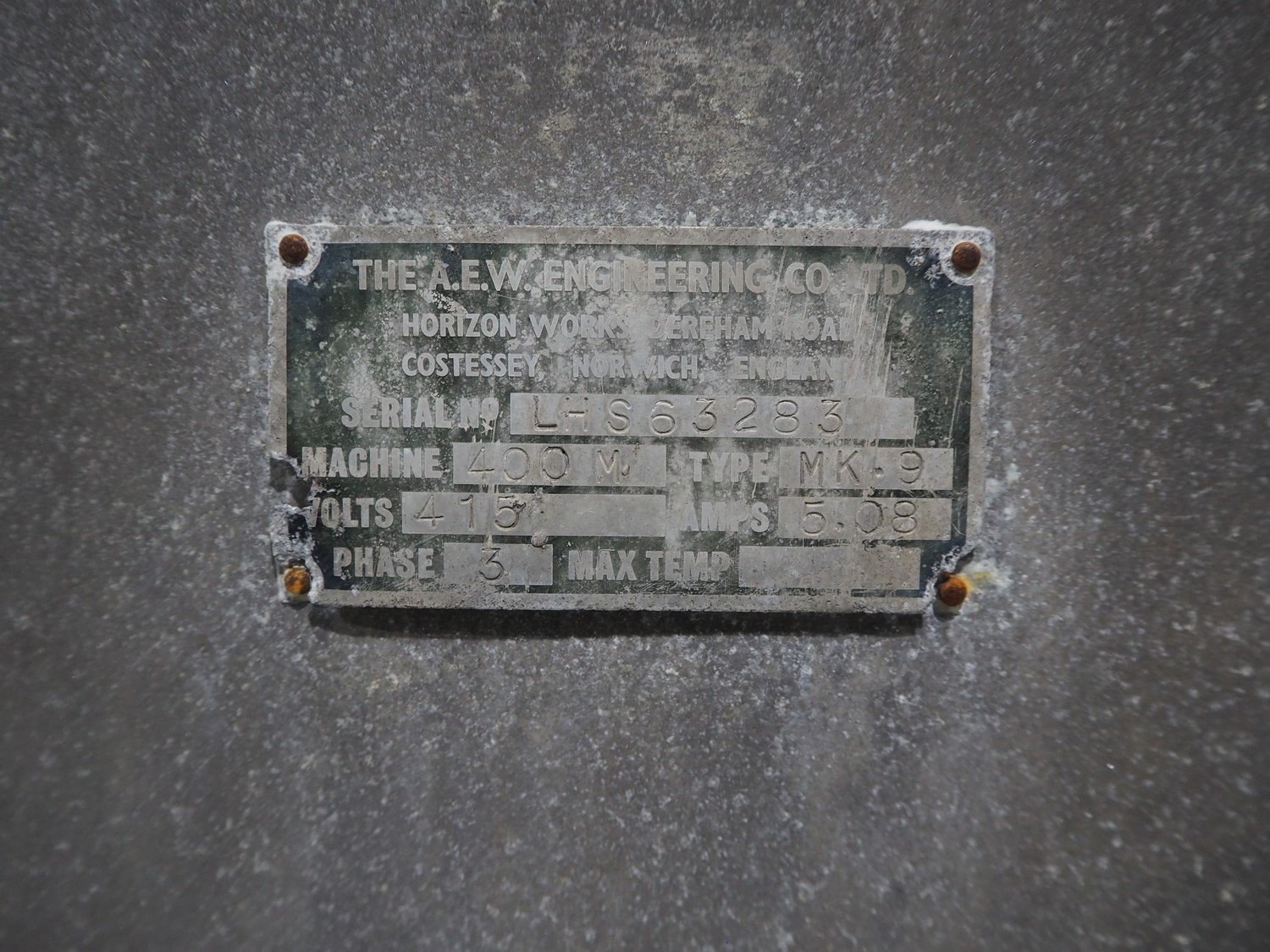 The A.E.W. Engineering band saw, type: MK9, machine: 400M, serial number: LHS63283, 415 V, 3 Ph, 5.08 A, table dimensions: 1050 mm x 880 mm, total dimensions: 1050 mm x 1000 mm x 1880 mm. Incomplete, w ithout saw.