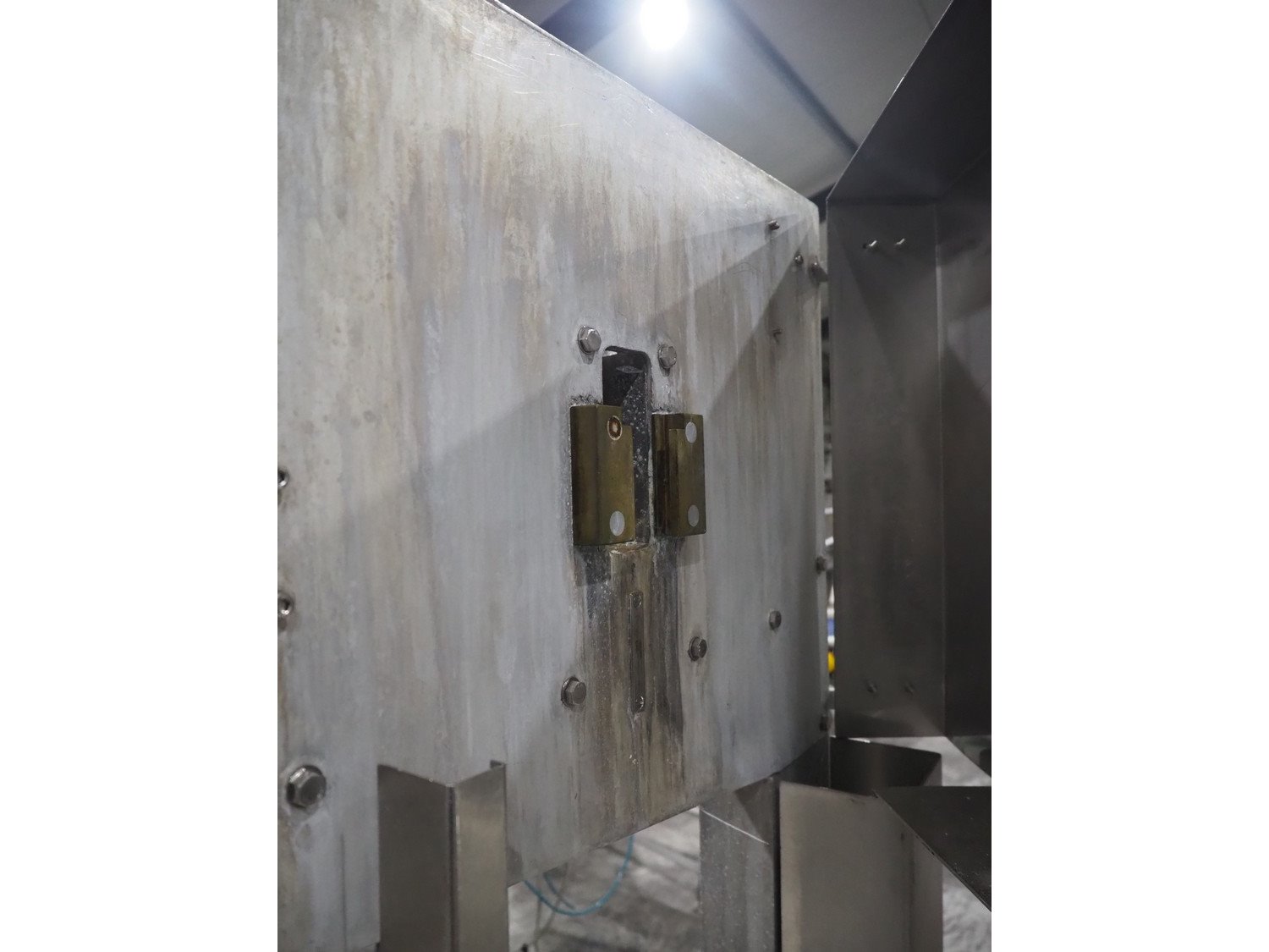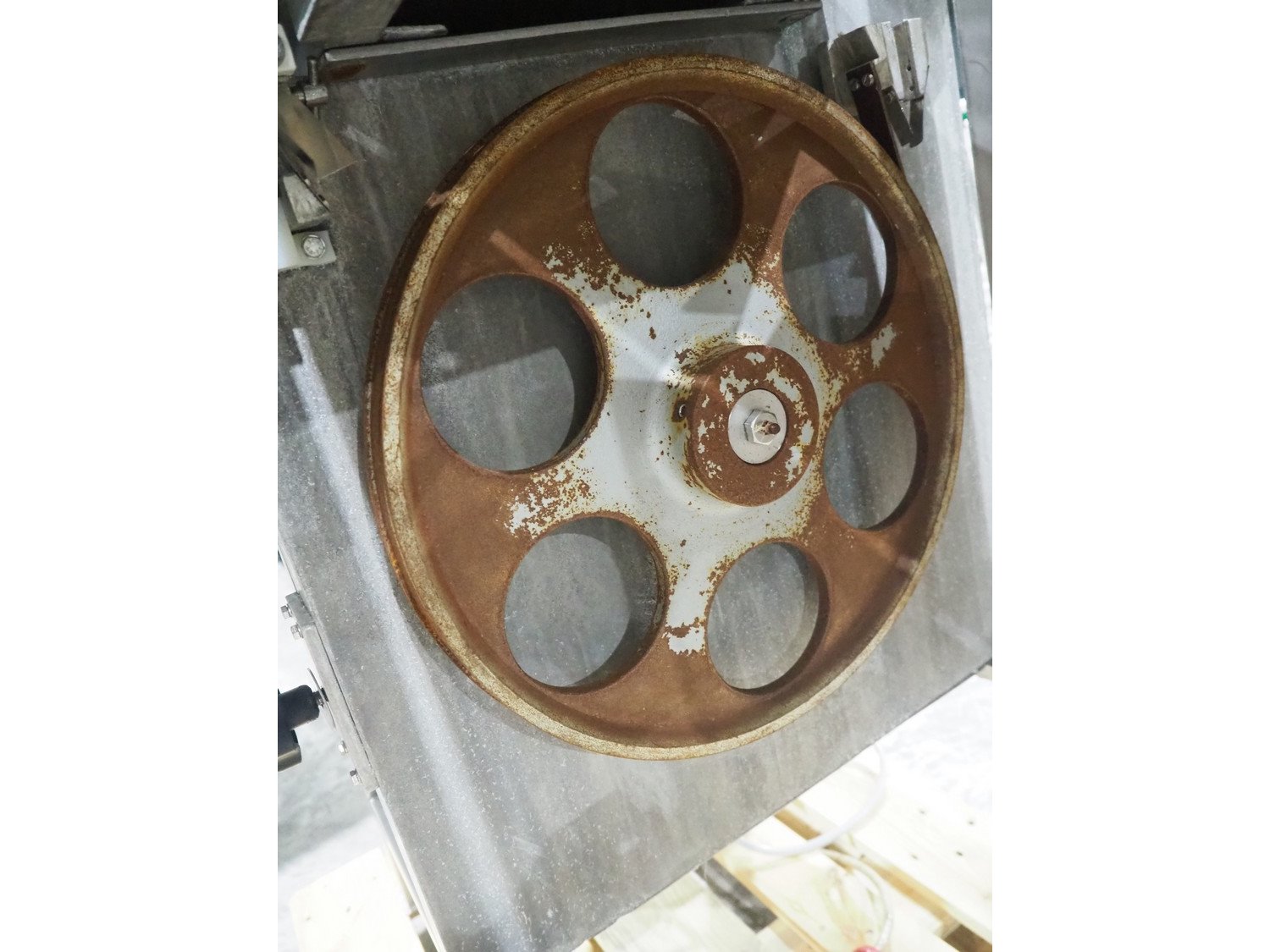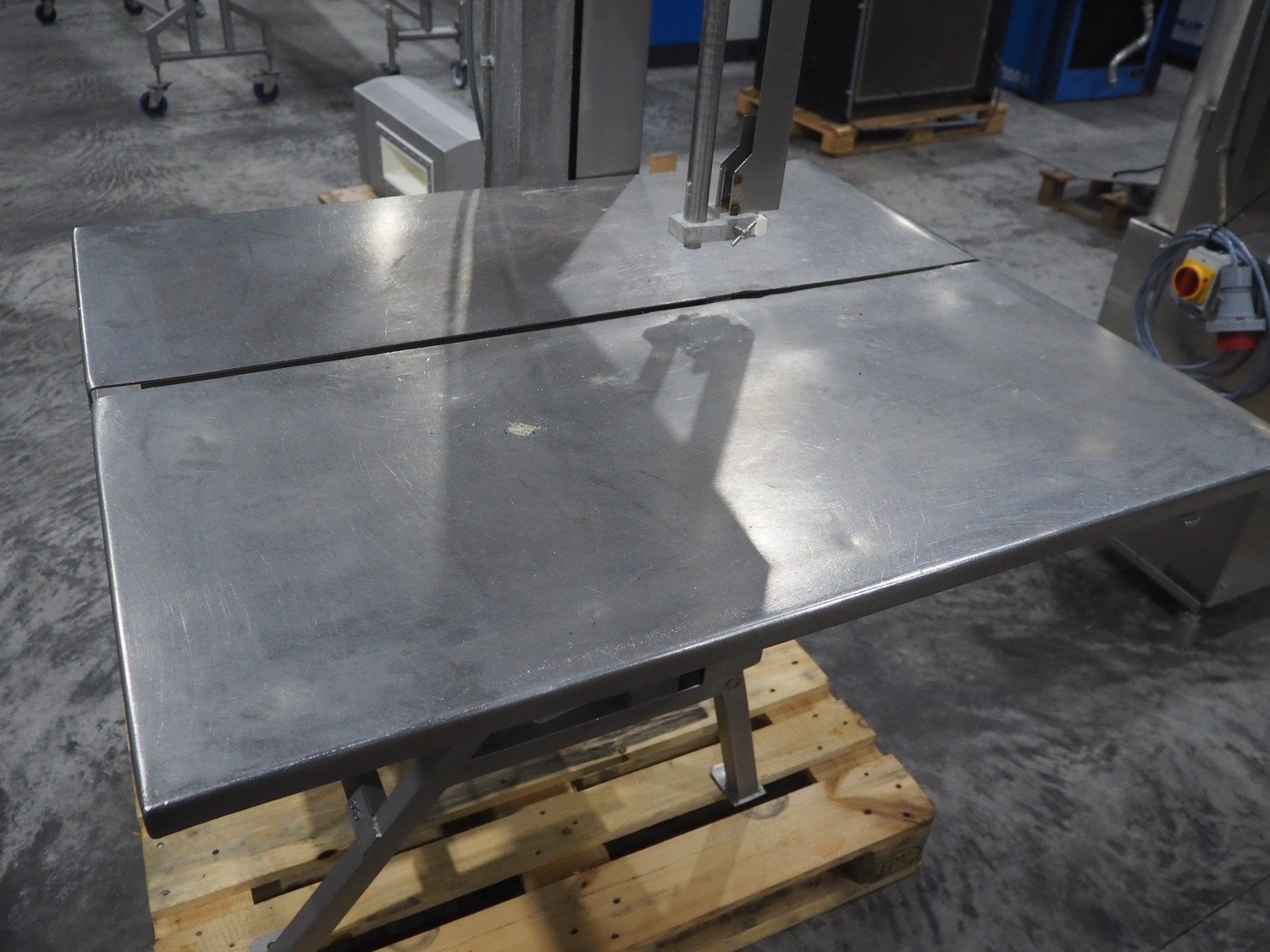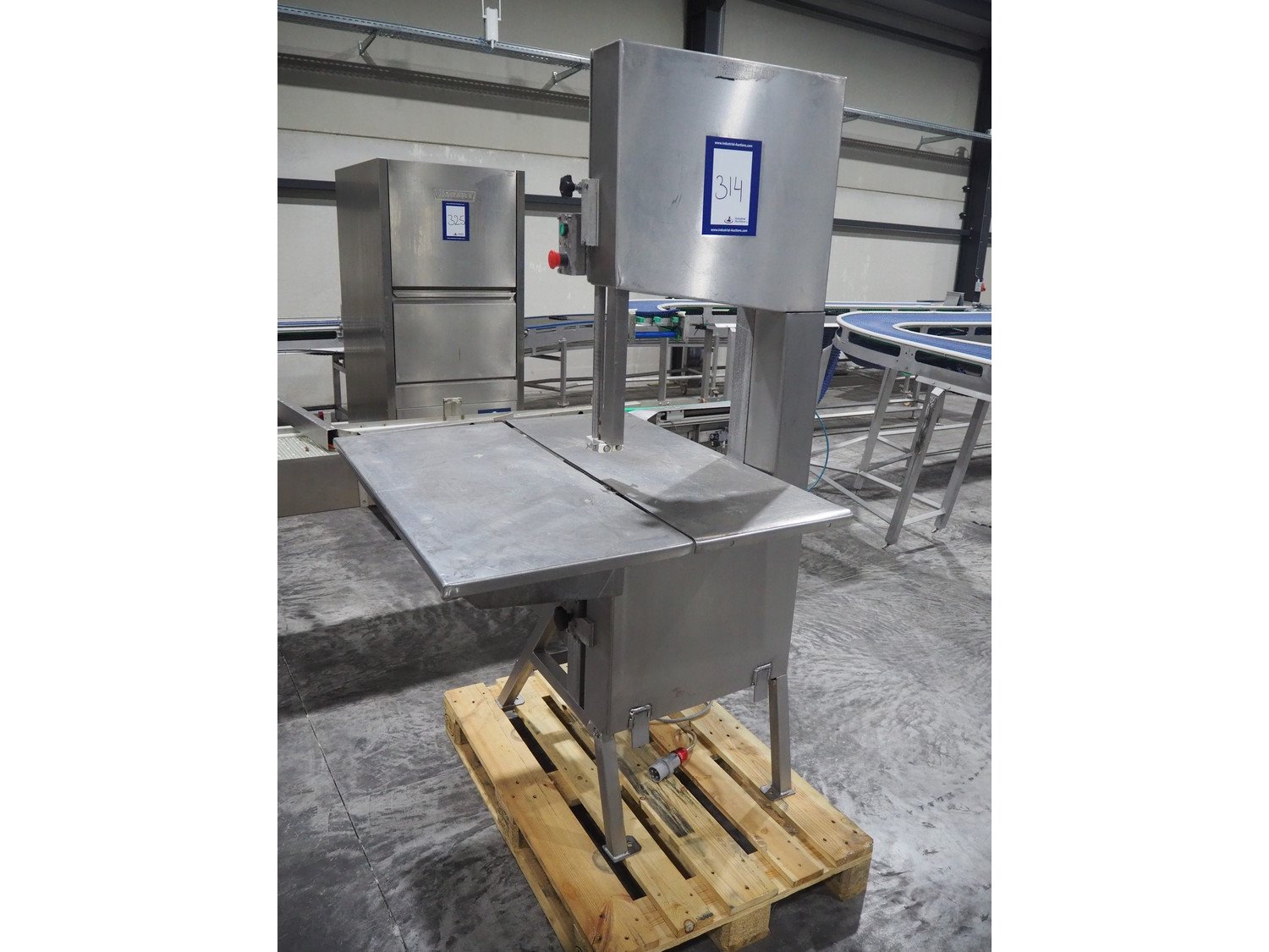 The A.E.W. Engineering band saw, type: MK9, machine: 400M, serial number: LHS63283, 415 V, 3 Ph, 5.08 A, table dimensions: 1050 mm x 880 mm, total dimensions: 1050 mm x 1000 mm x 1880 mm. Incomplete, w ithout saw.