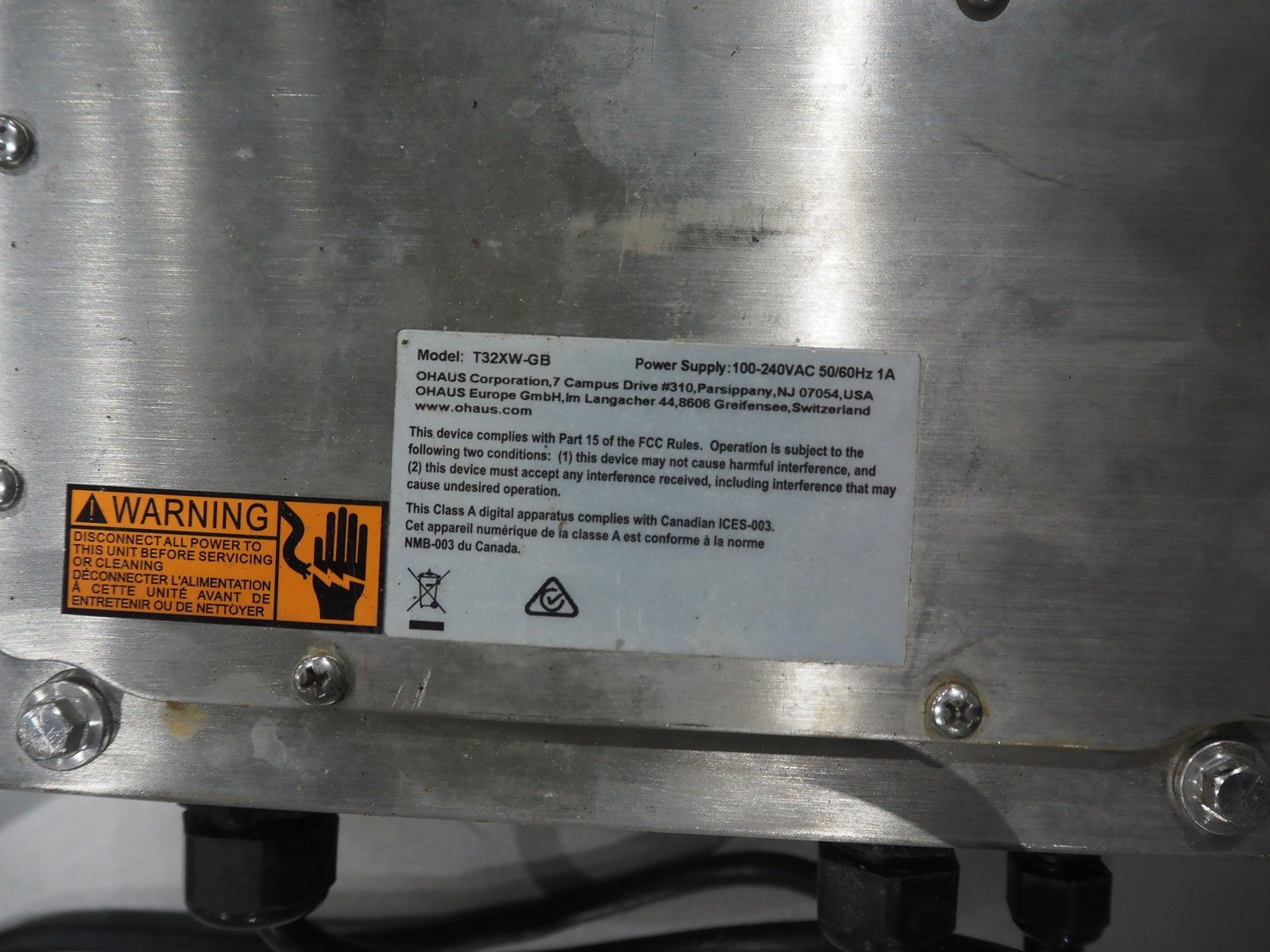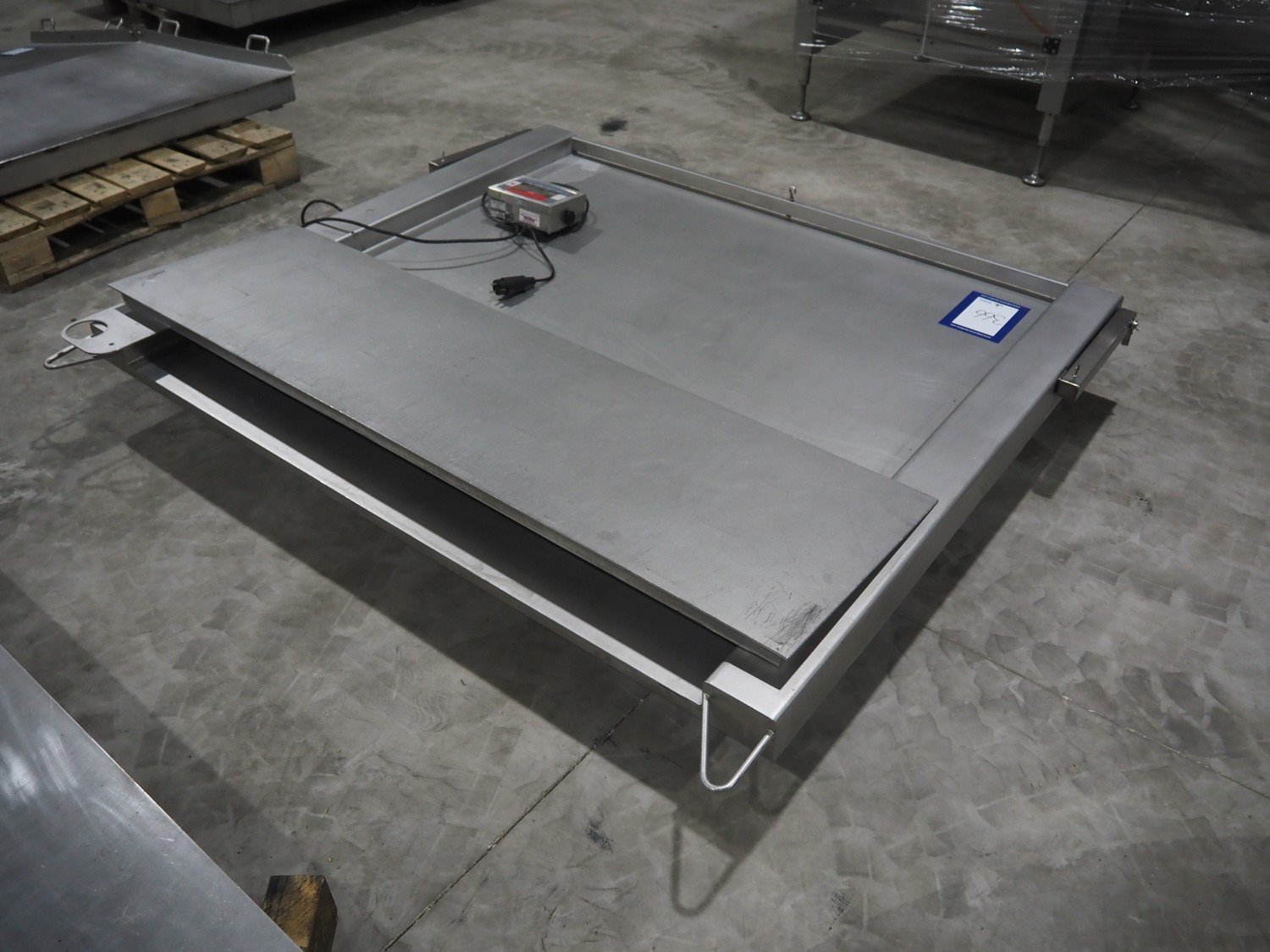 S/s floor weighing scale with OHAUS indicator, model indicator: T32XW, 100/240 V, 50/60 Hz, 1 A, dimensions: 1500 mm x 1480 mm x 140 mm.