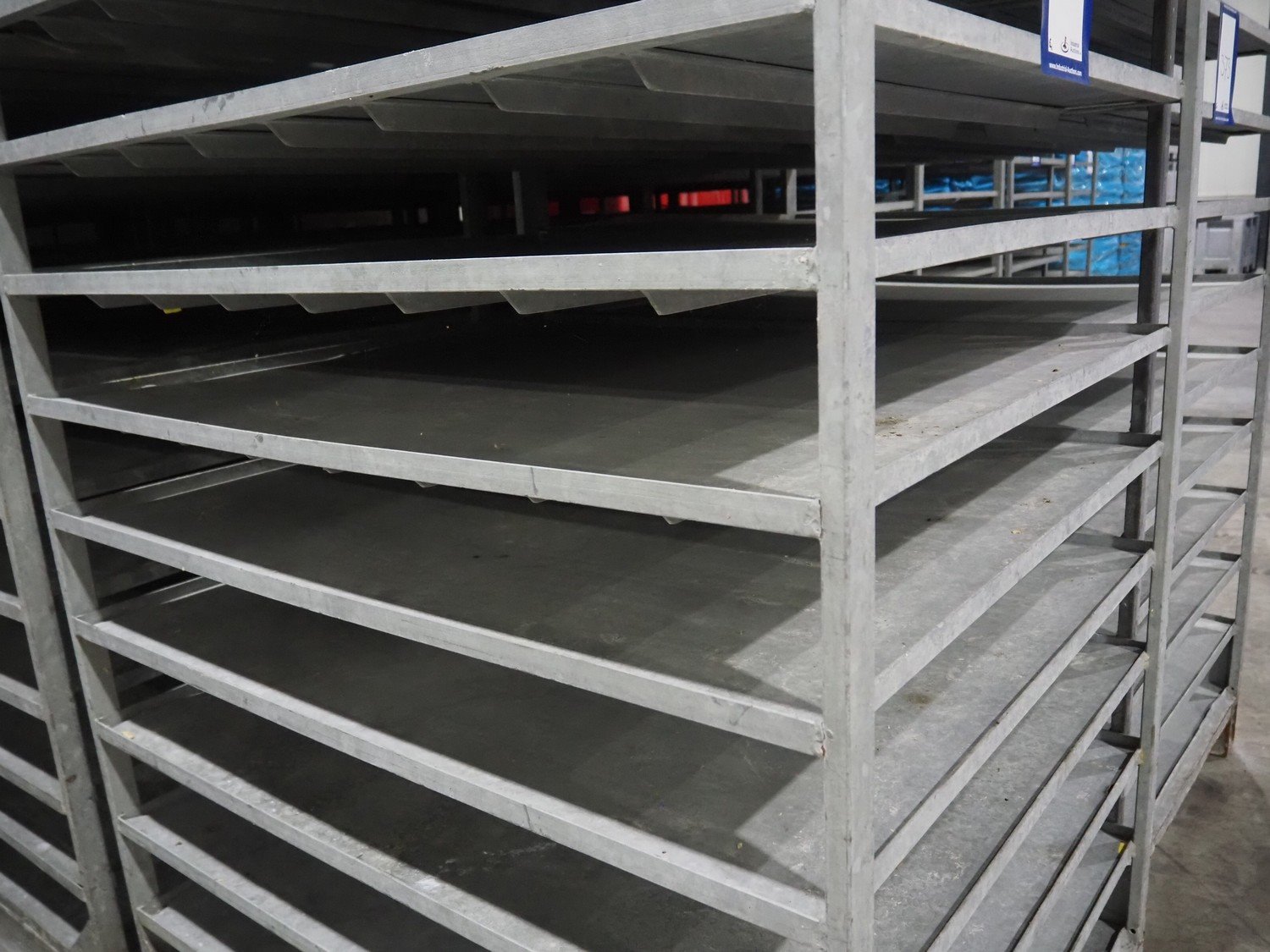 6 steel racks, 11 floors per rack, floor dimensions: 1150 mm x 990 mm x 130 mm, total dimensions: (6x) 1200 mm x 1005 mm x 1890 mm.