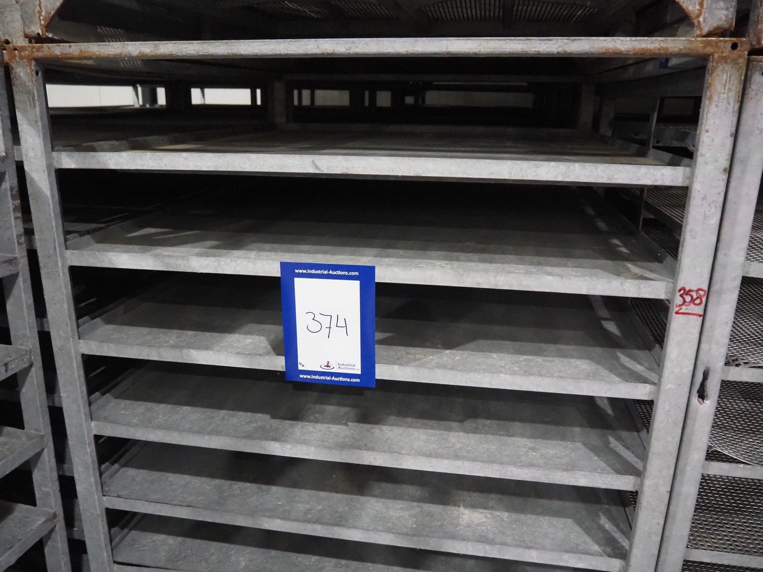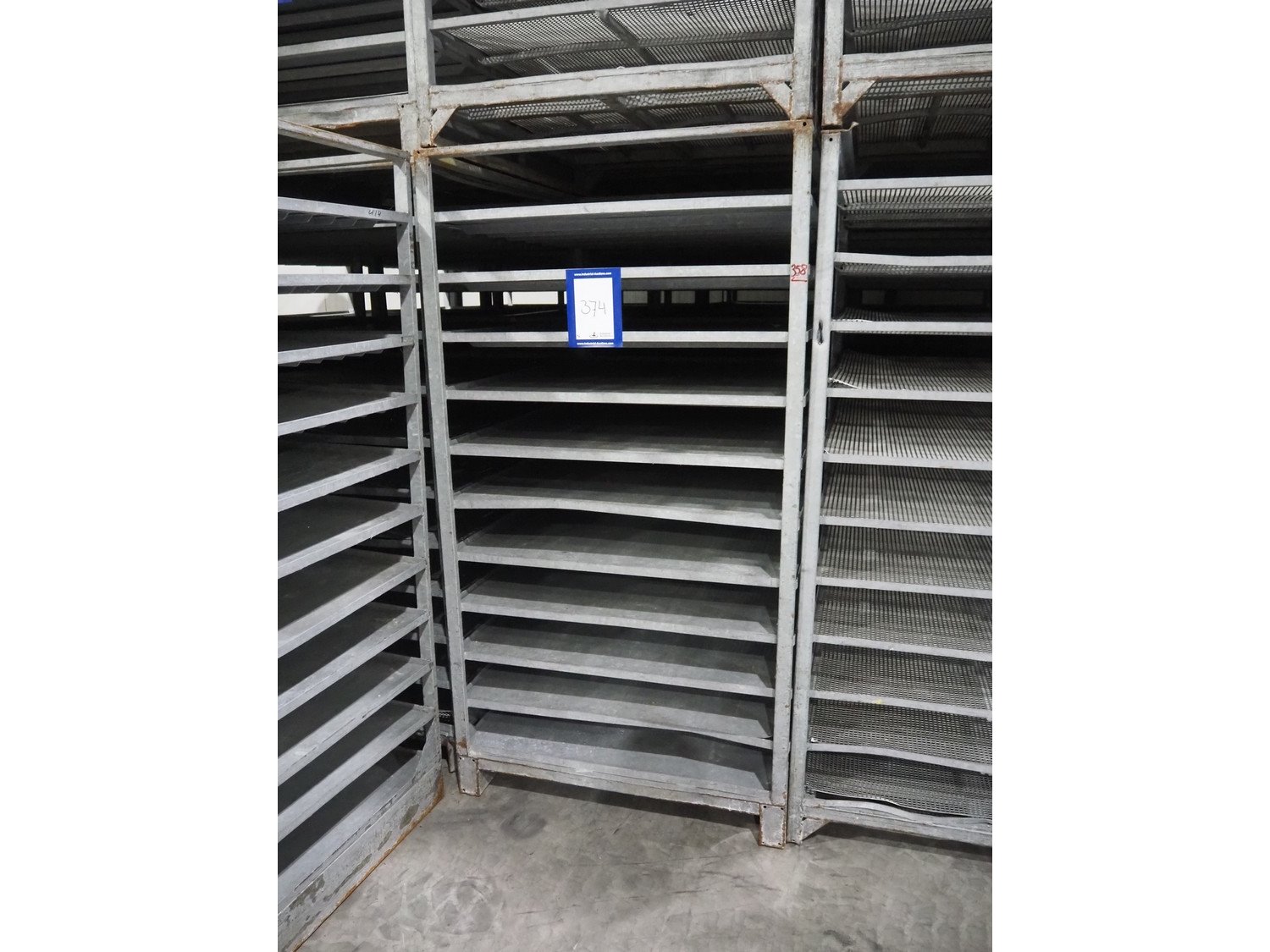 4 steel racks, 11 floors per racks, 3 frames have closed floors, 1 frame has perforated floors, floor dimensions: 1150 mm x 990 mm x 130 mm (closed) / 1155 mm x 930 mm x 135 mm (perforated), total dimensions: (4x) 1200 mm x 1005 mm x 1890 mm.