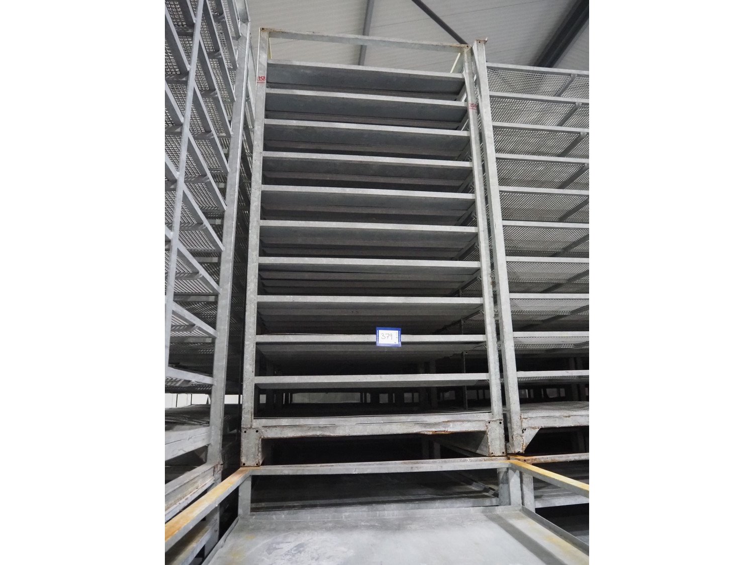 4 steel racks, 11 floors per rack, 3 racks have closed floors, 1 rack has perforated floors, floor dimensions: 1150 mm x 990 mm x 130 mm (closed) / 1155 mm x 930 mm x 135 mm (perforated), total dimensions: (4x) 1200 mm x 1005 mm x 1890 mm.