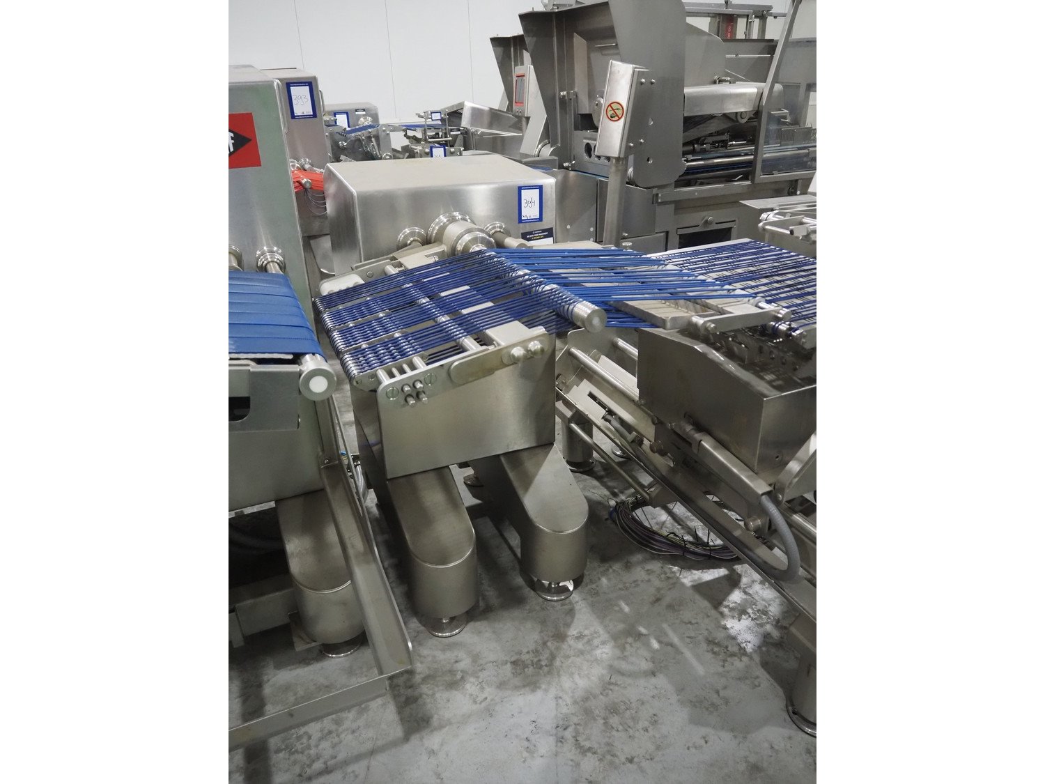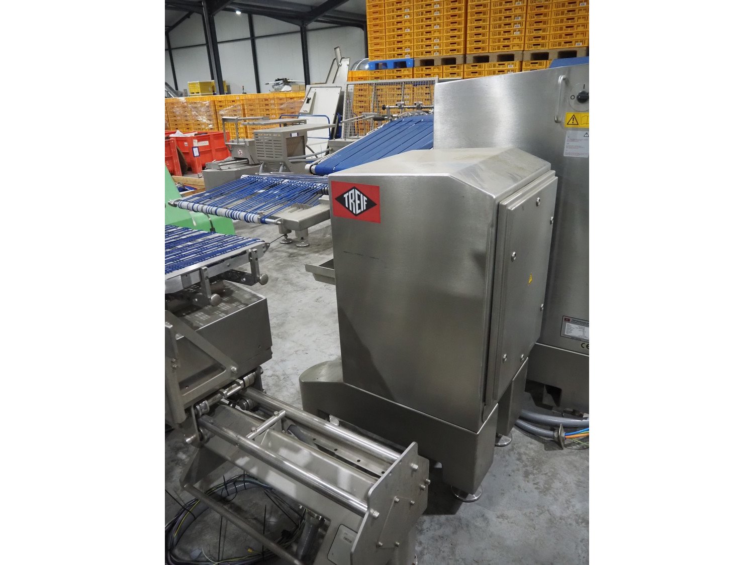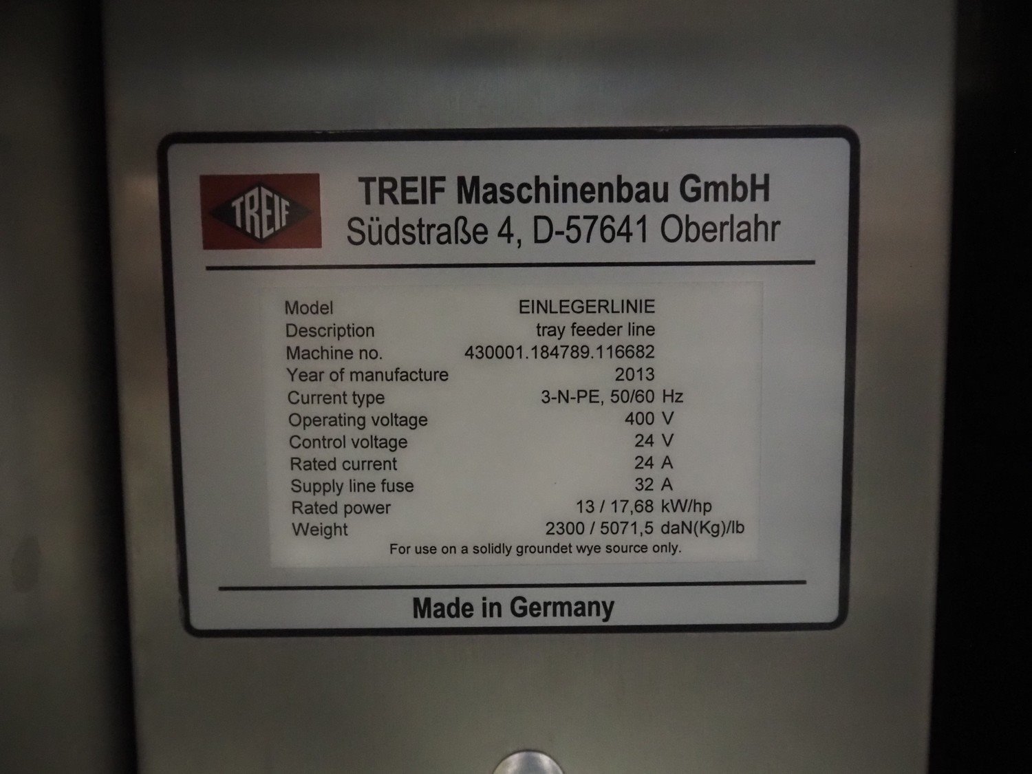 Treif Maschinenbau GmbH slicer line, consisting of: Slicer, model: Divider 880, machine number: 541304.184670.118165, year of construction: 2013, 400 V, 3 Ph, 50/60 Hz, 19 A, 2 lanes, plastic wire belt, belt width: 480 mm, dimensions: 5450 mm x 1950 mm x 2300 mm. Tray feeder line, model: Einlegerlinie, machine number: 430001.184789.116682, year of construction: 2013, 400 V, 3 Ph, 50/60 Hz, 24 A, 13 kW, weight: 2300 kg, plastic belt, belt width: 540 mm, dimensions tray feeder line: 5500 mm x 1760 mm x 1660 mm. Technical condition unkown.
