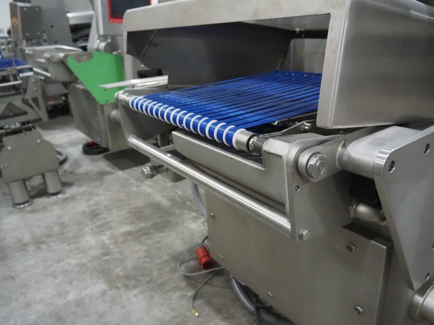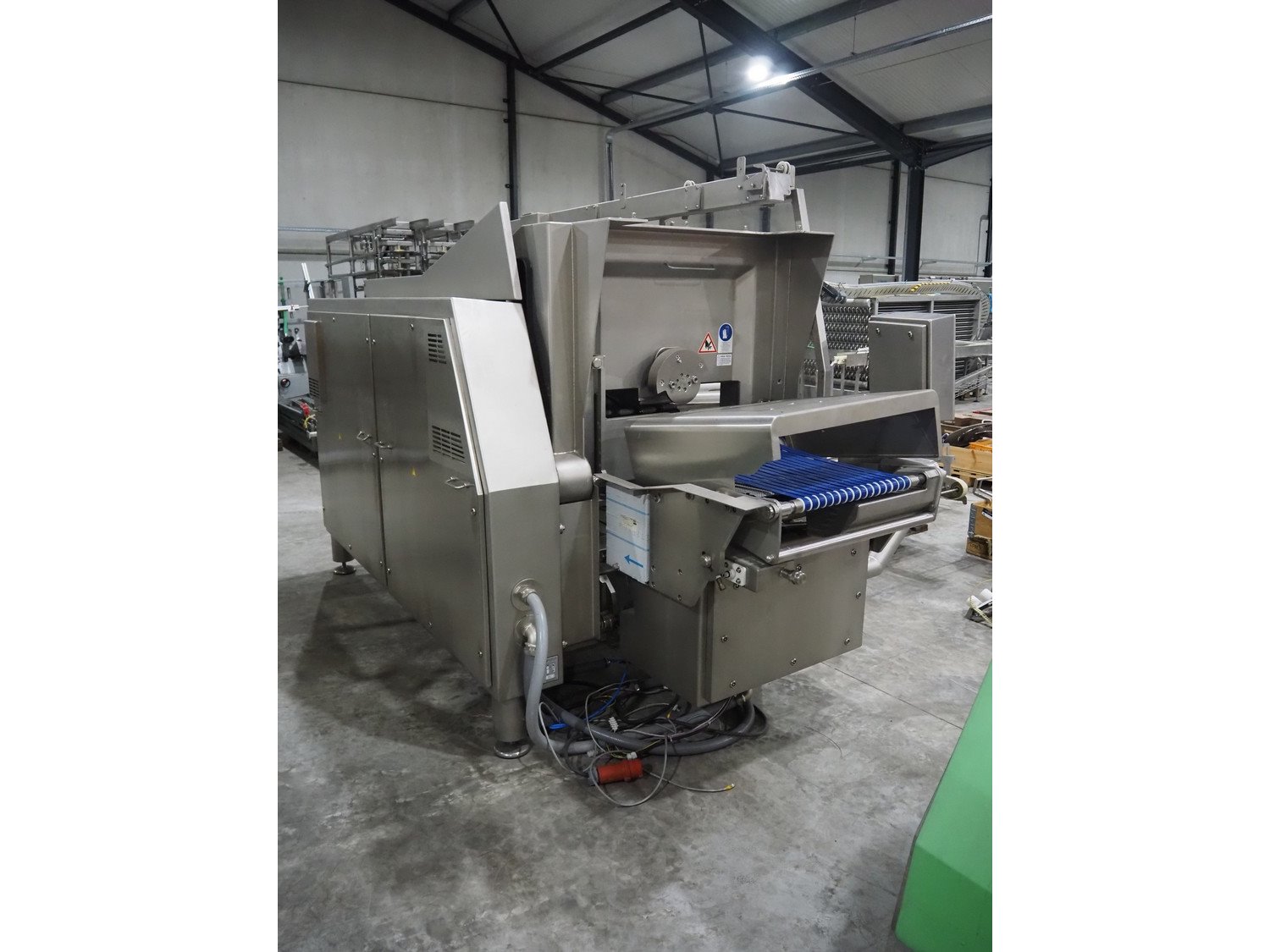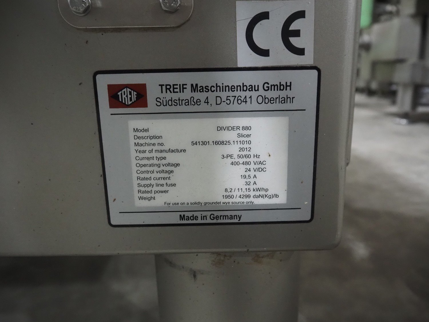 Treif Maschinenbau GmbH slicer, model: Divider 880, machine number: 541301.160825.111010, year of construction: 2012, 400/480 V, 3 Ph, 50/60 Hz, 19.5 A, 8.2 kW, weight: 1950 kg, 4 lanes, plastic infeed belt, belt width: 445 mm, dimensions slicer: 5100 mm x 1870 mm x 2700 mm. Technical condition unknown.