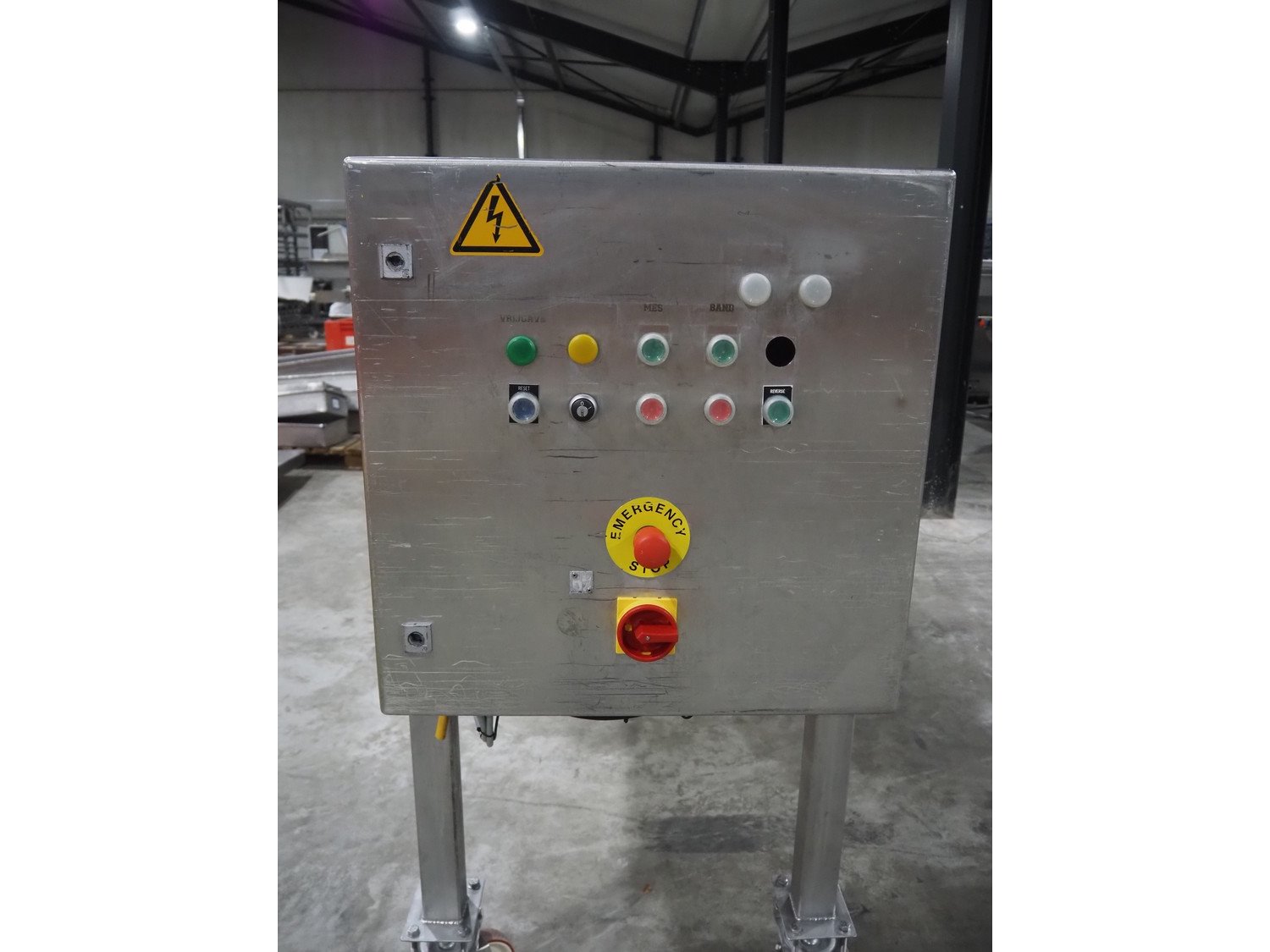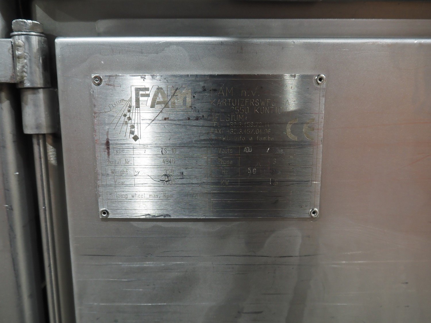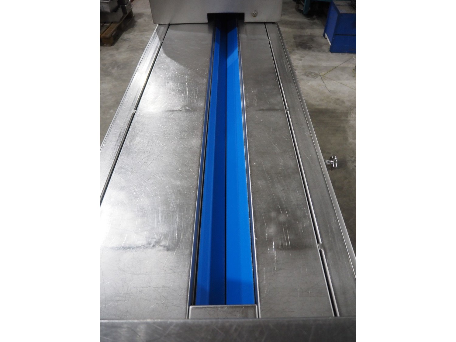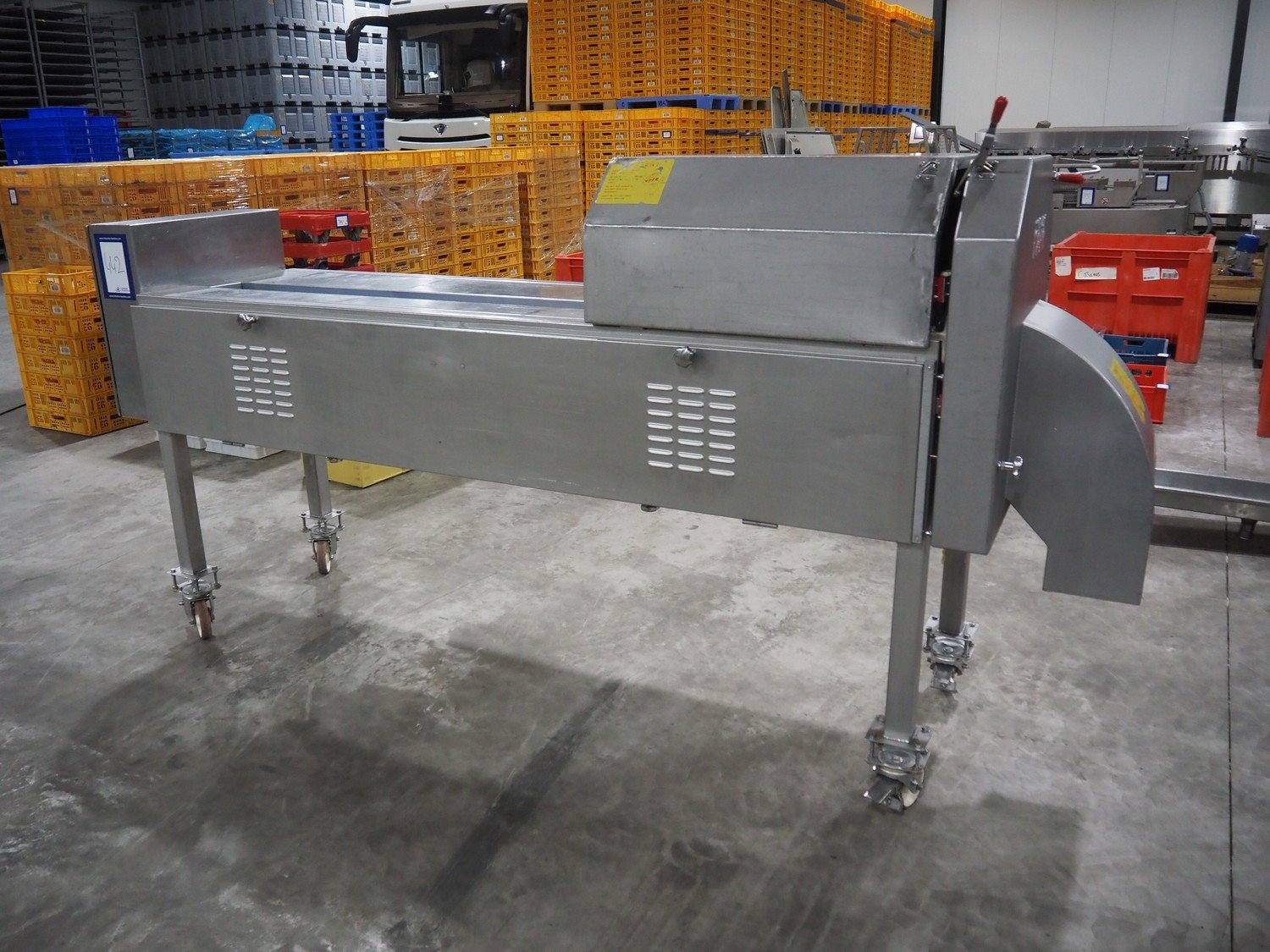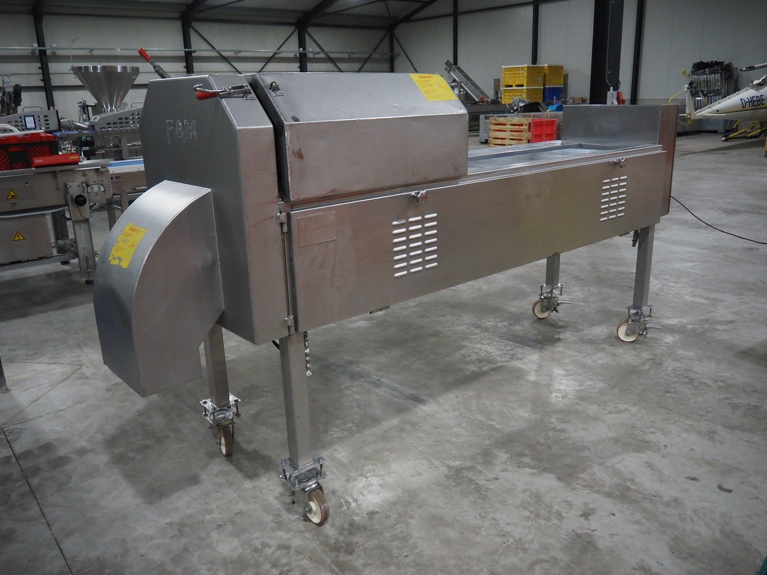 FAM mobile horizontal vegetable slicer, type: TS-1D, serial number: 4946, year of construction: 2000, 400 V, 3 Ph, 50 Hz, 1.5 kW, weight: 350 kg, plastic belt: (2x) 85 mm (1x) 50 mm, knife length: 100 mm, distance between knifes: 80 mm, clearance: 90 mm x 90 mm, total dimensions: 3100 mm x 800 mm x 1450 mm.