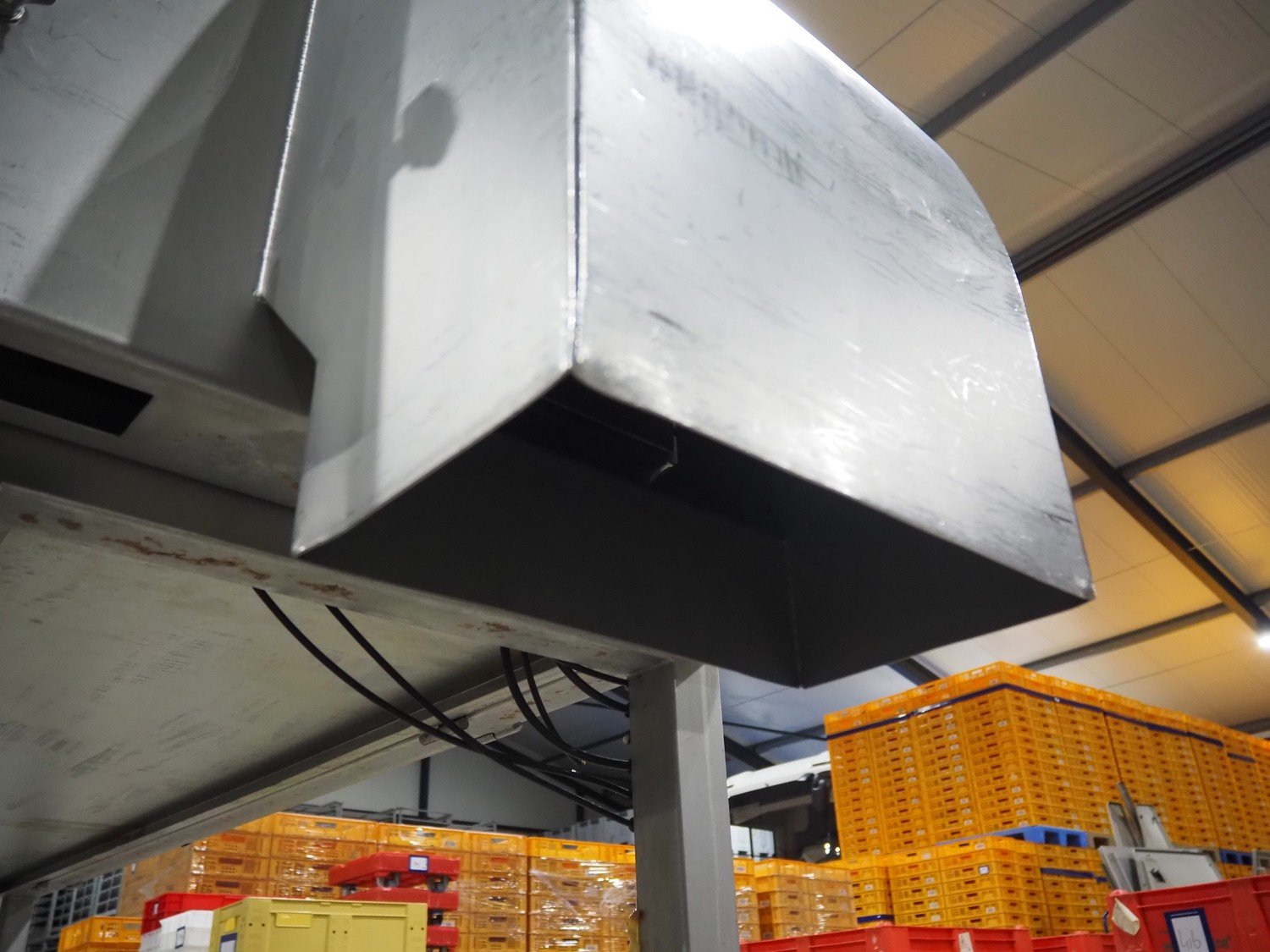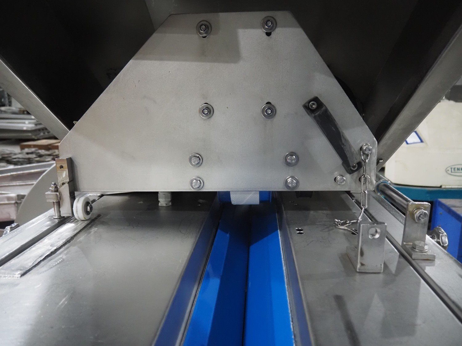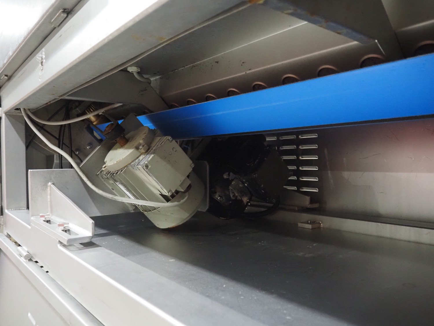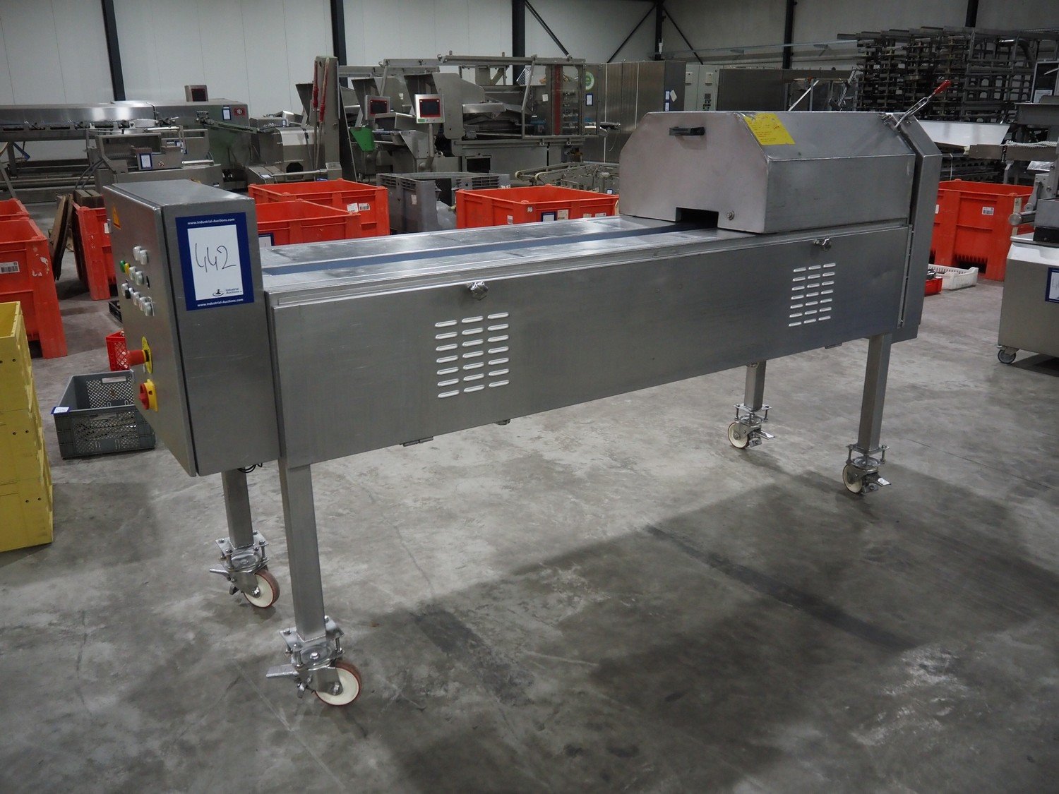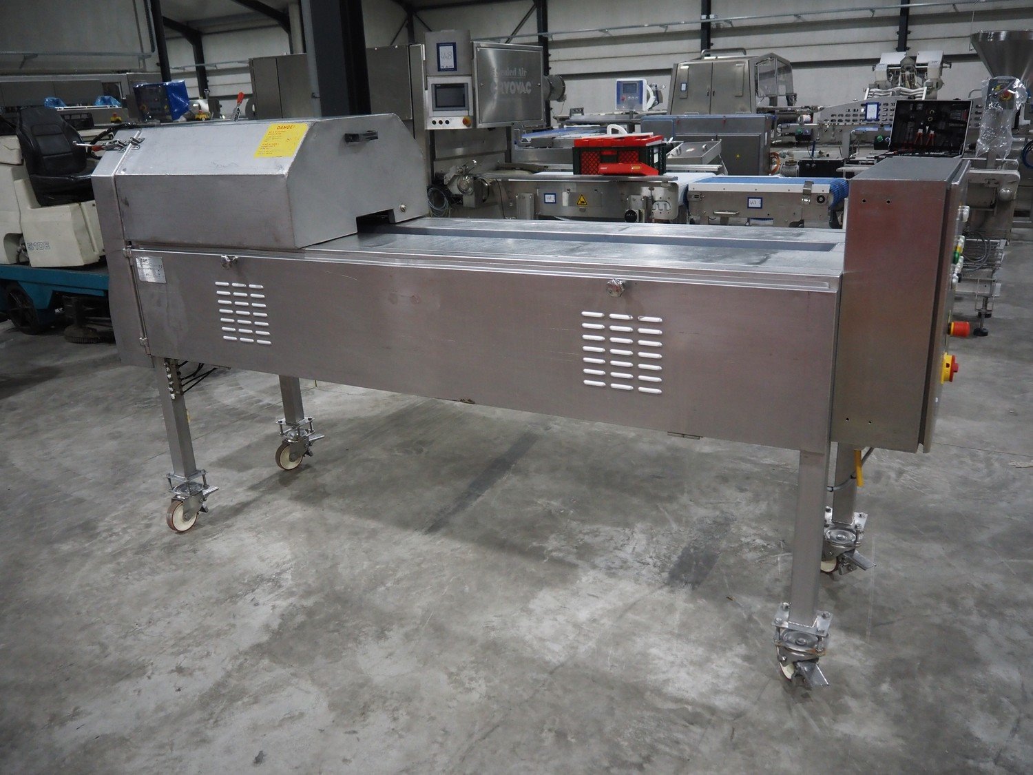 FAM mobile horizontal vegetable slicer, type: TS-1D, serial number: 4946, year of construction: 2000, 400 V, 3 Ph, 50 Hz, 1.5 kW, weight: 350 kg, plastic belt: (2x) 85 mm (1x) 50 mm, knife length: 100 mm, distance between knifes: 80 mm, clearance: 90 mm x 90 mm, total dimensions: 3100 mm x 800 mm x 1450 mm.