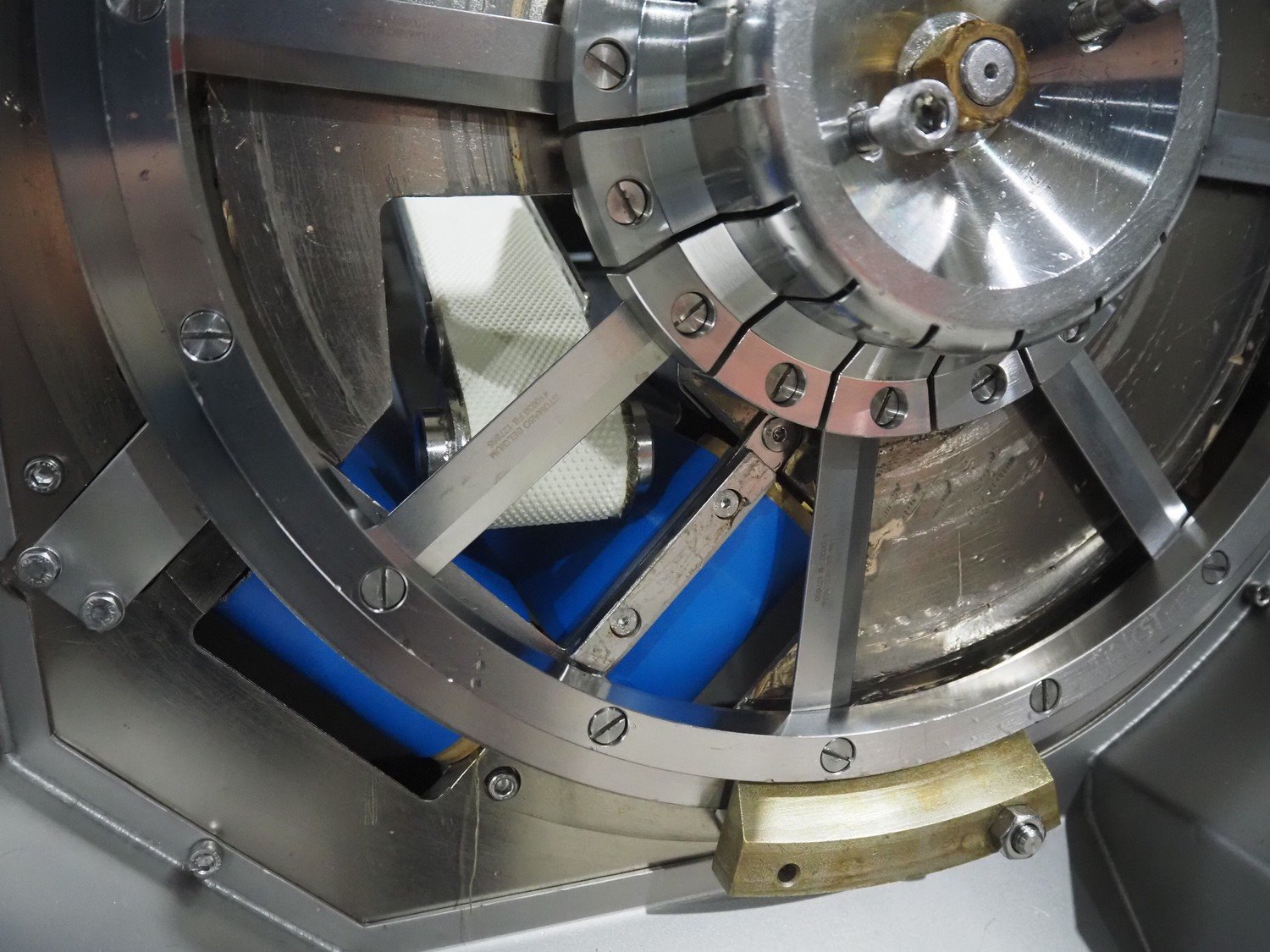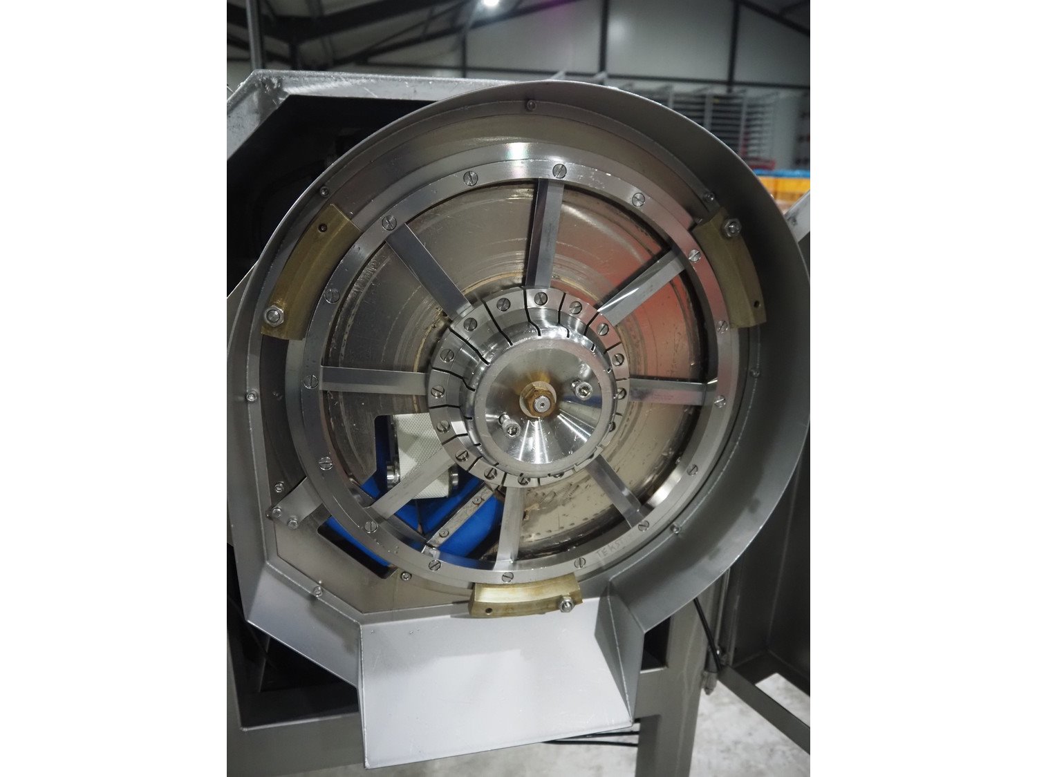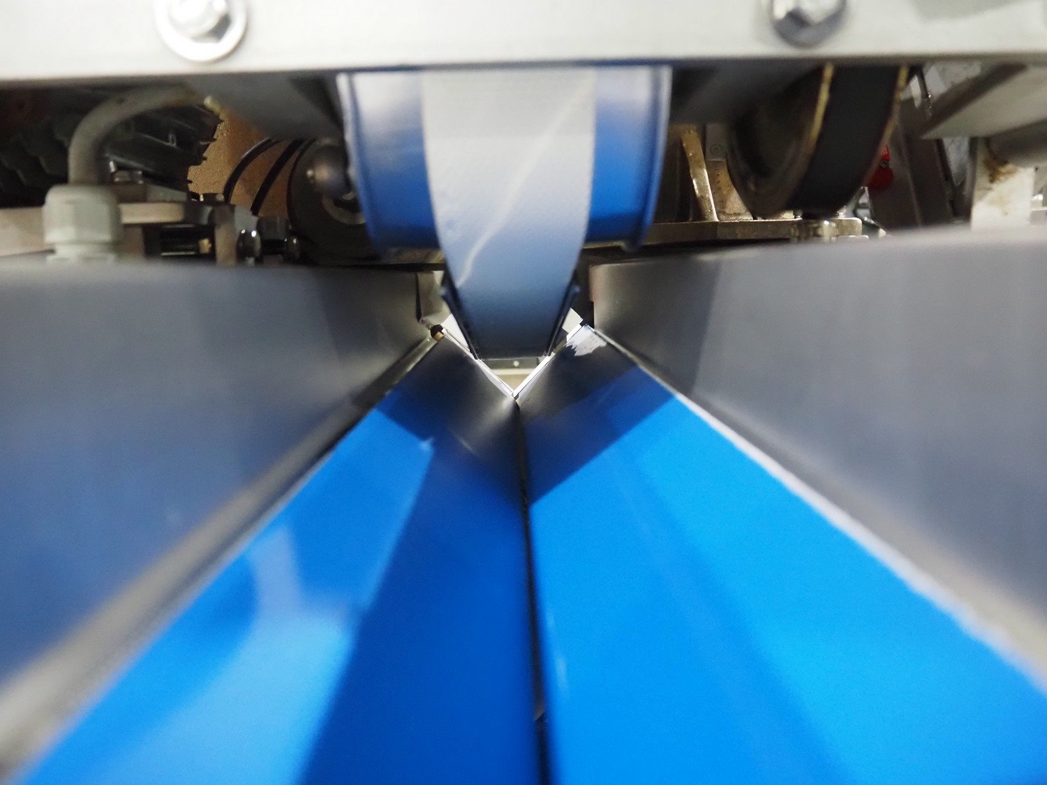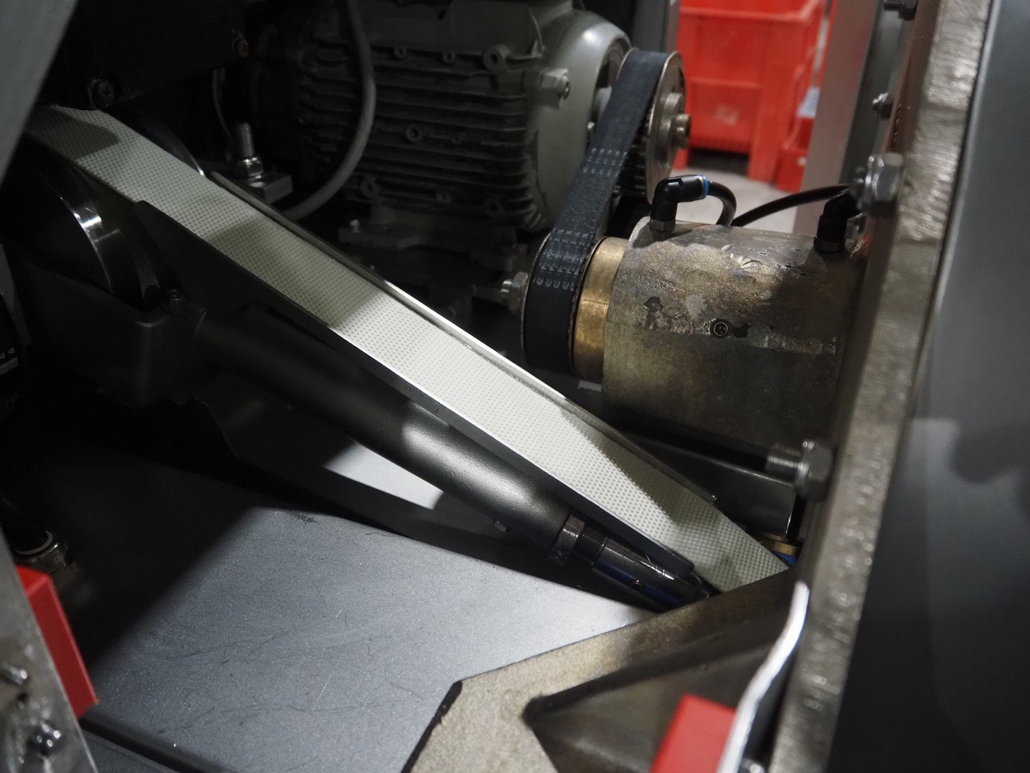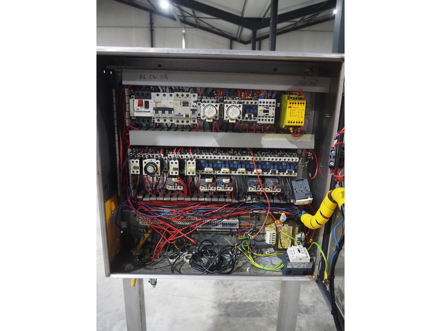 FAM mobile horizontal vegetable slicer, type: TS-1D, serial number: 4946, year of construction: 2000, 400 V, 3 Ph, 50 Hz, 1.5 kW, weight: 350 kg, plastic belt: (2x) 85 mm (1x) 50 mm, knife length: 100 mm, distance between knifes: 80 mm, clearance: 90 mm x 90 mm, total dimensions: 3100 mm x 800 mm x 1450 mm.