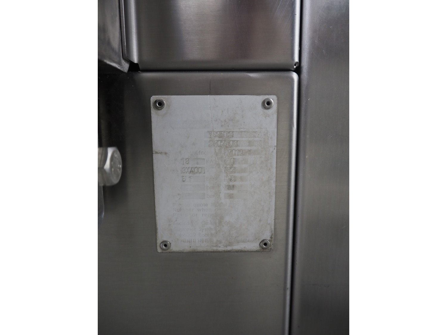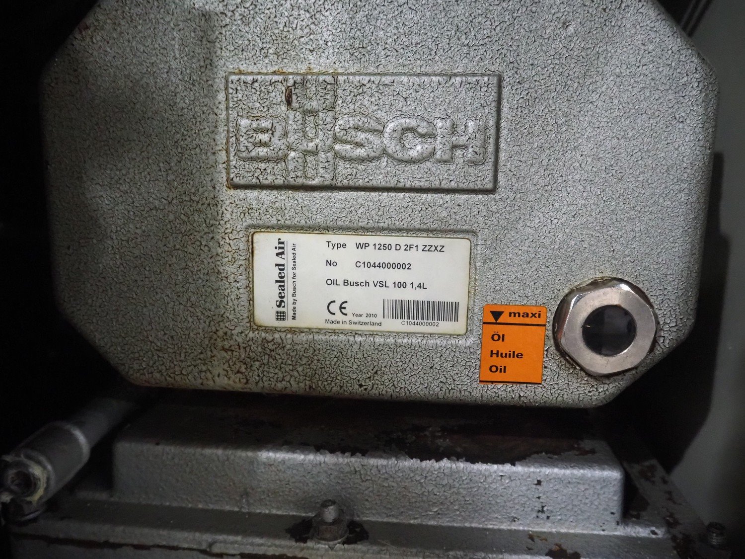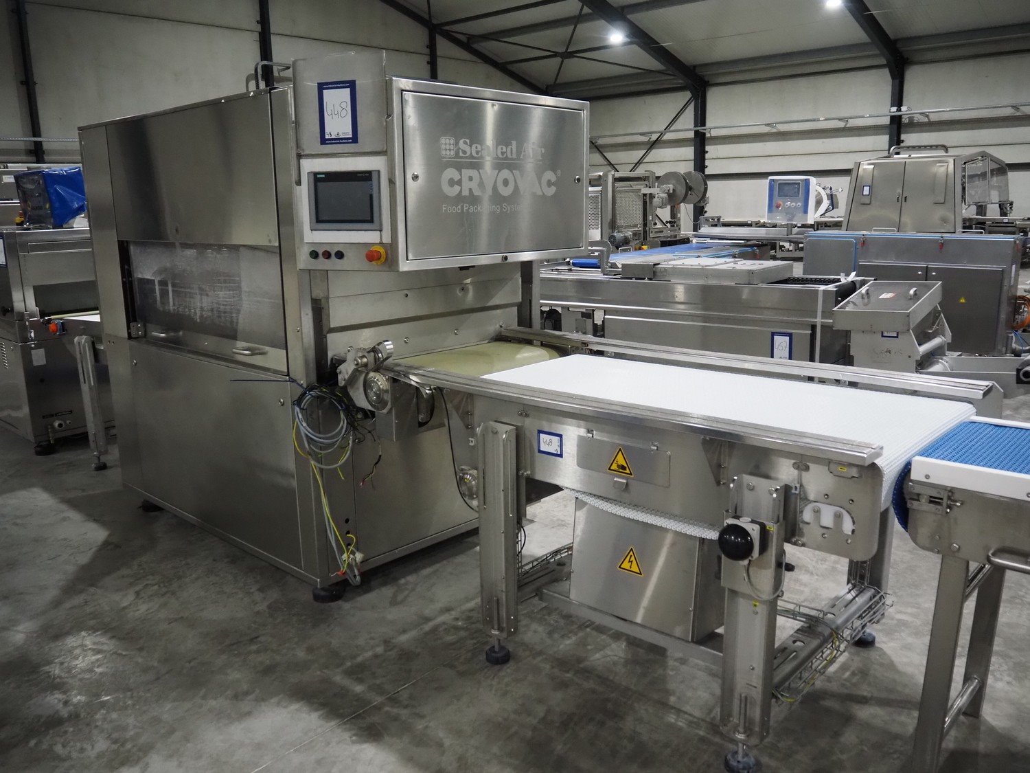 Cryovac belt vacuum machine, type: VS95TS, serial number: SN02408, year of construction: 2011, 400 V, 3 Ph, 50 Hz, 32 A, 18 kW, plastic belt, belt width: 730 mm Busch vacuum pump, type: WP: 1250 D 2F1, serial number: C1044000002, year of construction: 2010, capacity: 250 m³ per hour, total dimensions: 5000 mm x 1300 mm x 1900 mm. Including: infeed and outfeed belt: plastic mesh belt, belt width: (2x) 730 mm. Suction device, dimensions: Ø 540 mm x 1200.