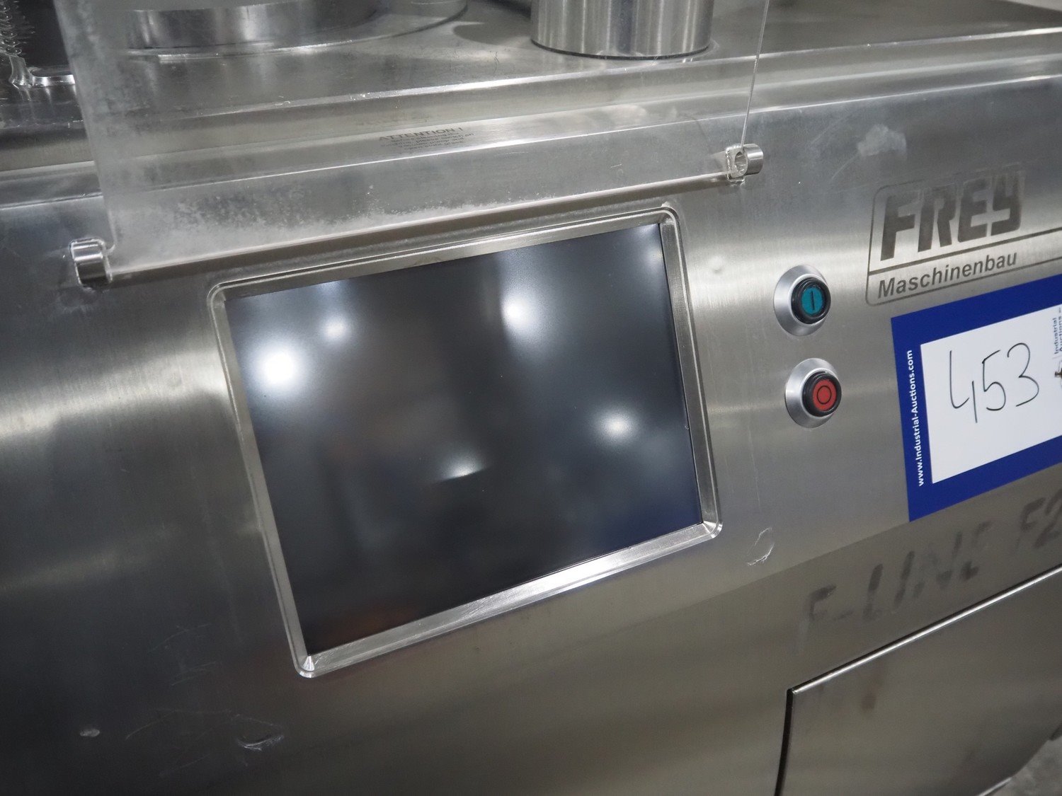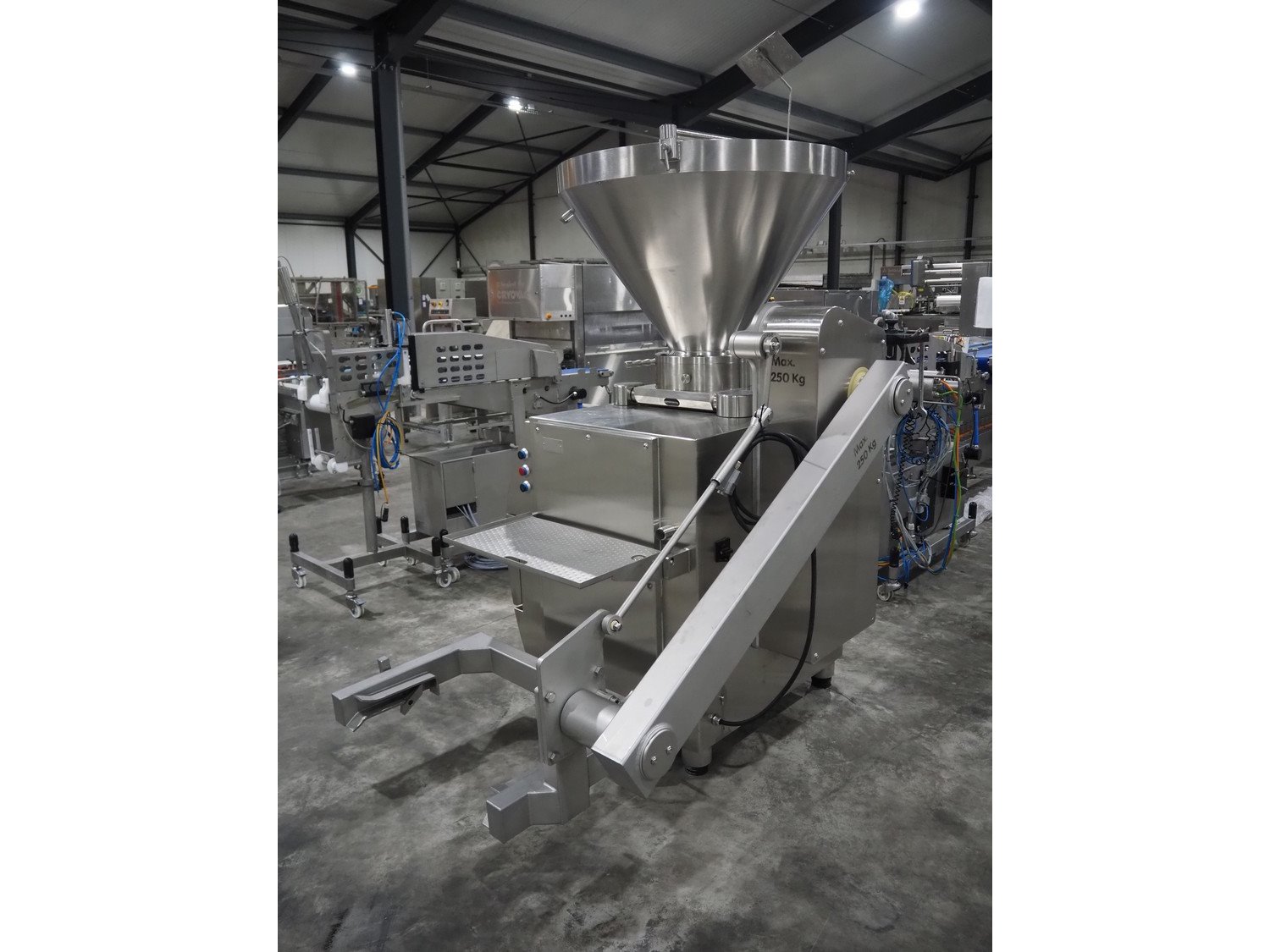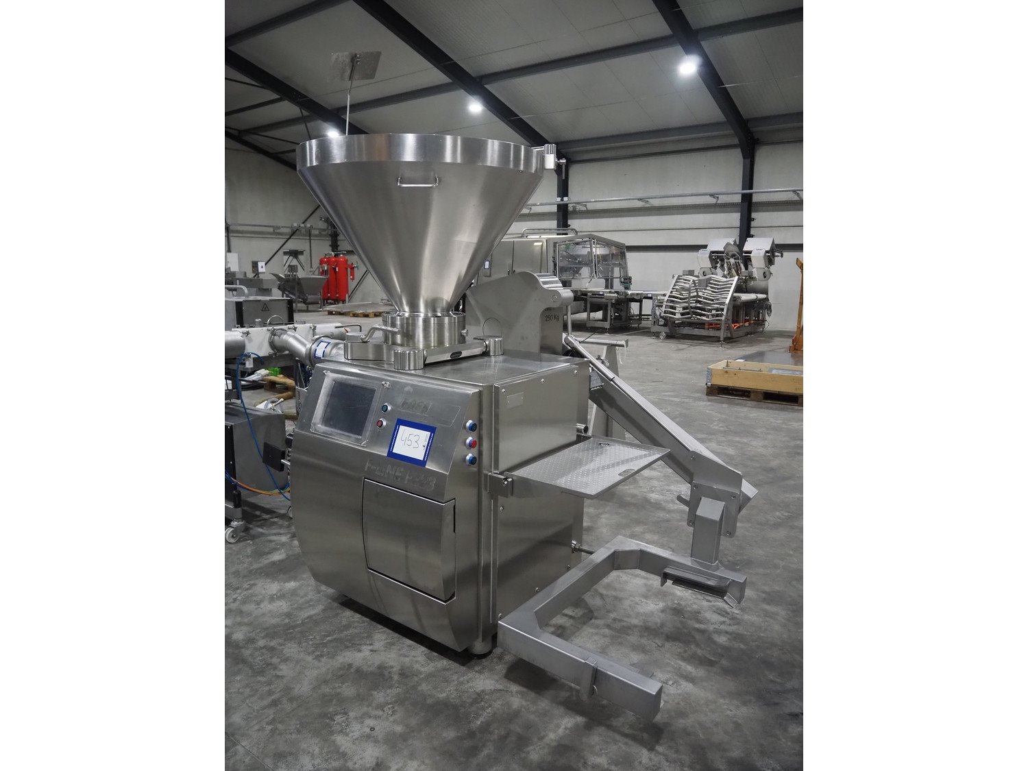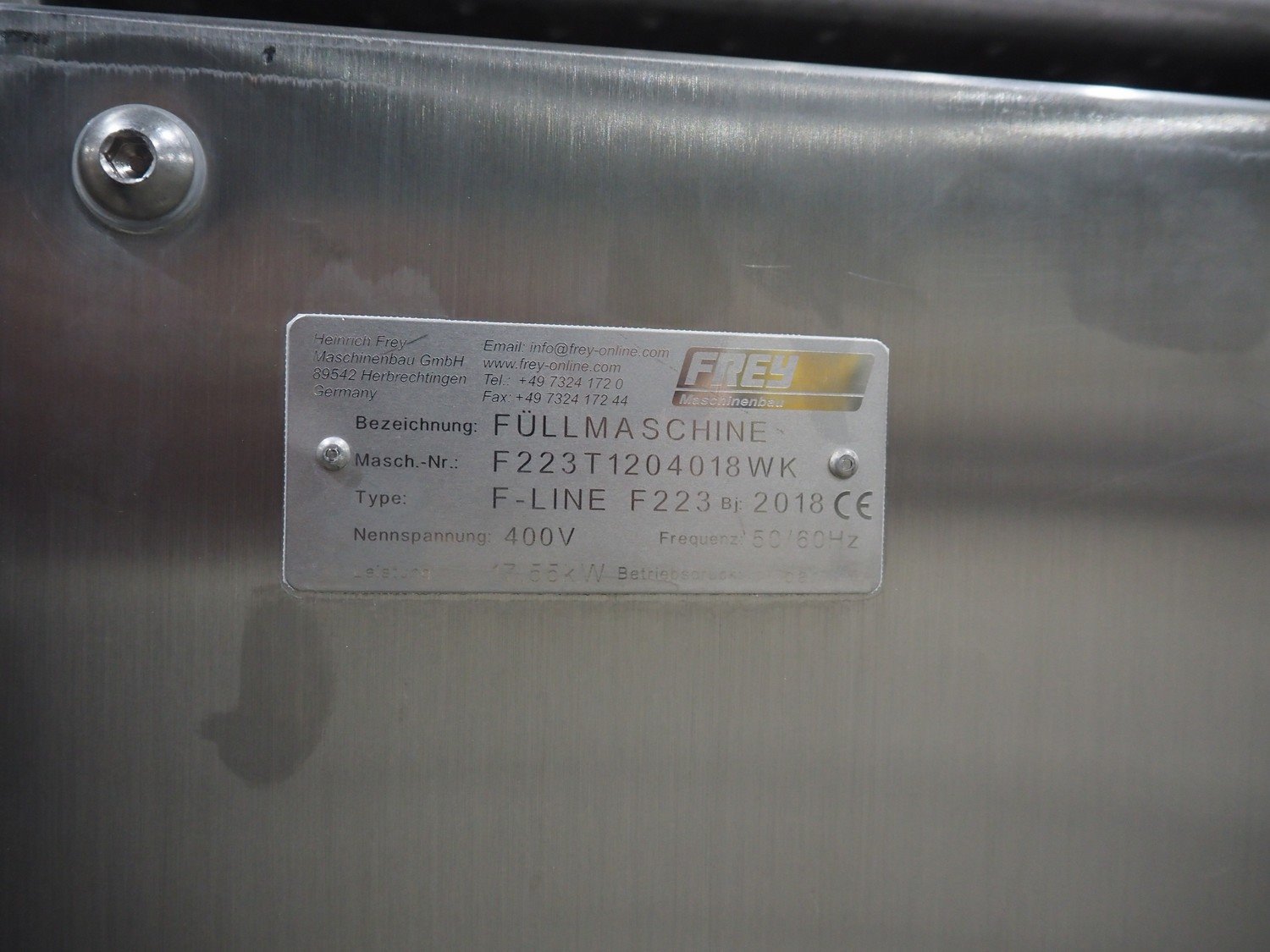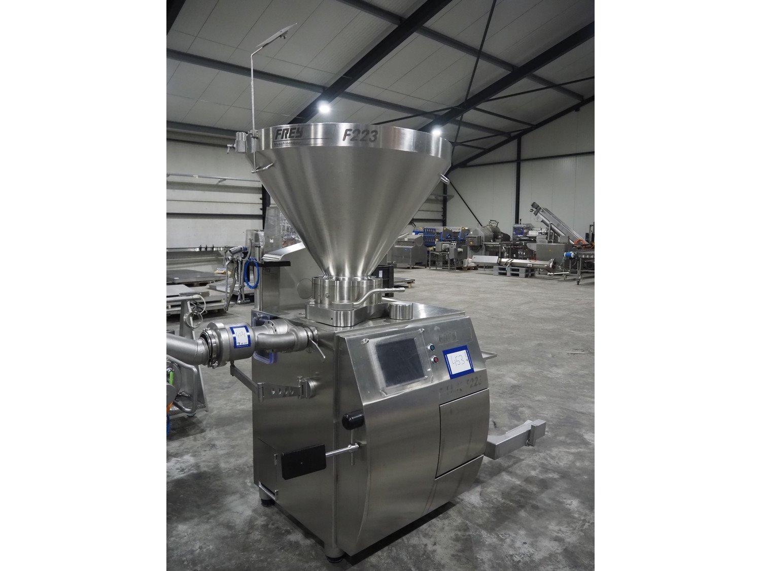 Frey Maschinenbau GmbH vacuum filler with lifter for 200 liter meat bins, type: F-Line F223, machine number: F223T1204018 WK, year of construction: 2018, 400 V, 50/60 Hz, 5.5 kW, dimensions: 2050 mm x 1350 mm x 2500 mm.