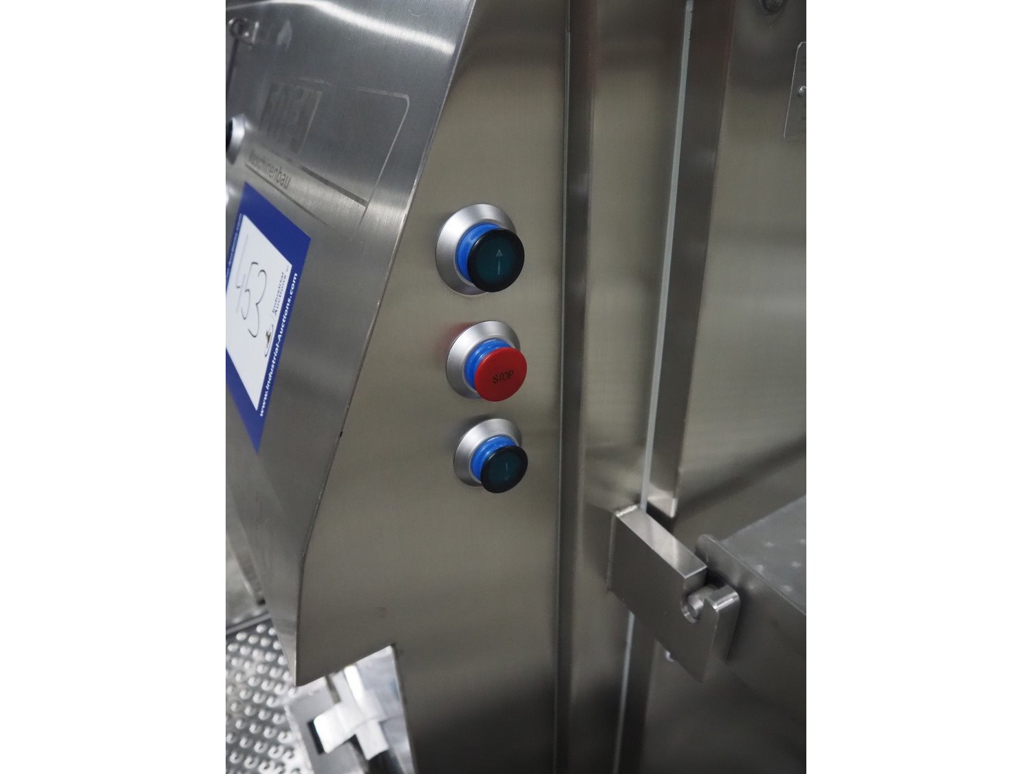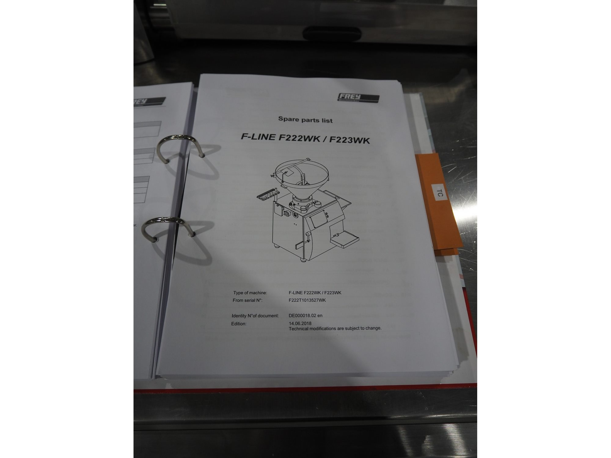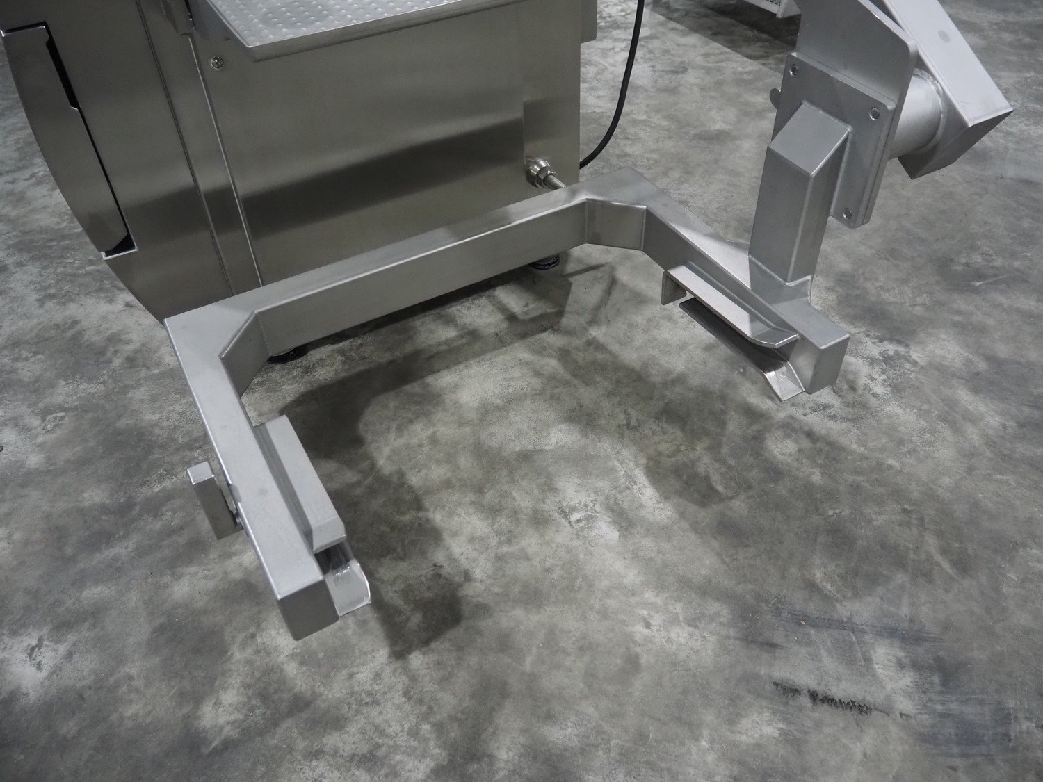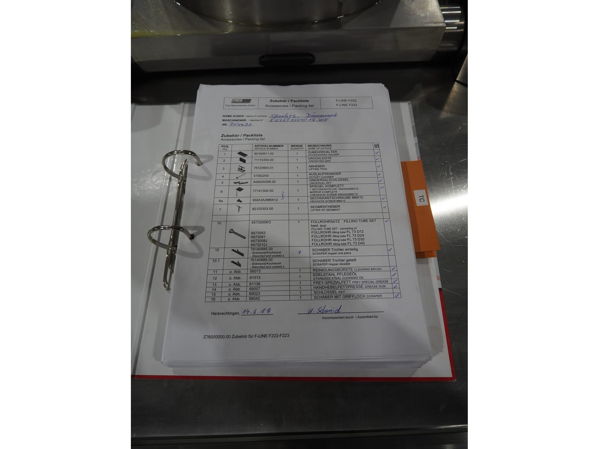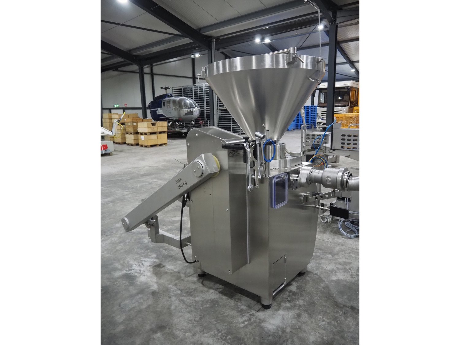 Frey Maschinenbau GmbH vacuum filler with lifter for 200 liter meat bins, type: F-Line F223, machine number: F223T1204018 WK, year of construction: 2018, 400 V, 50/60 Hz, 5.5 kW, dimensions: 2050 mm x 1350 mm x 2500 mm.