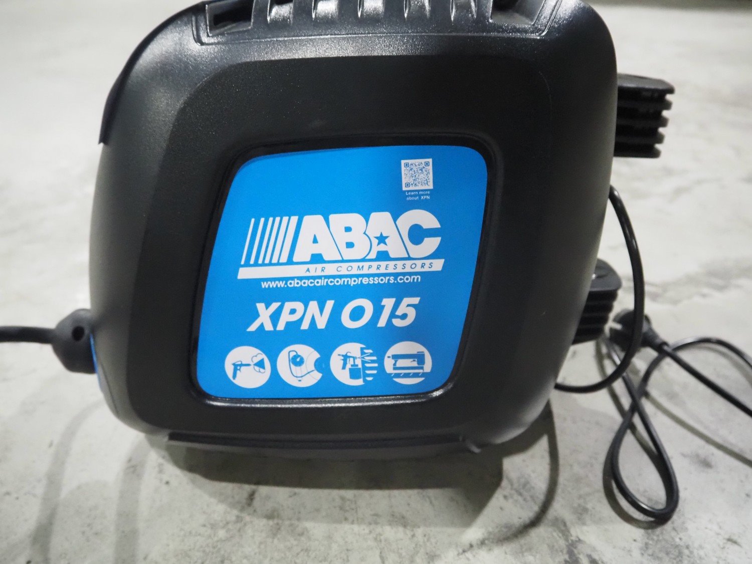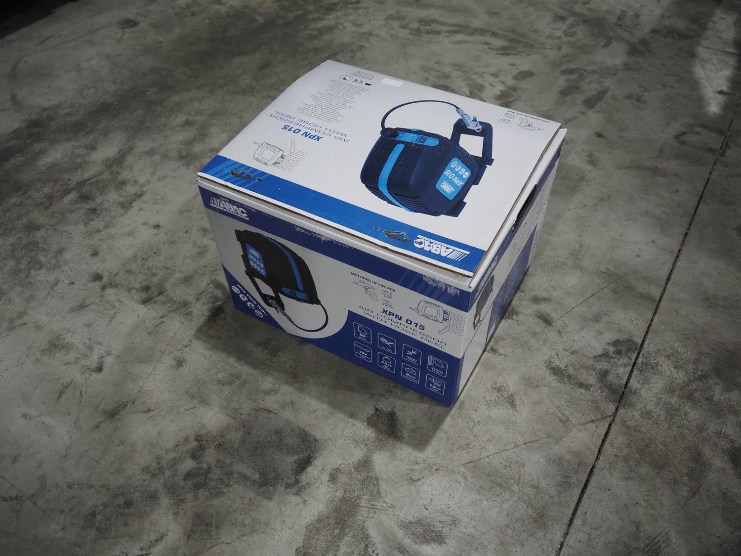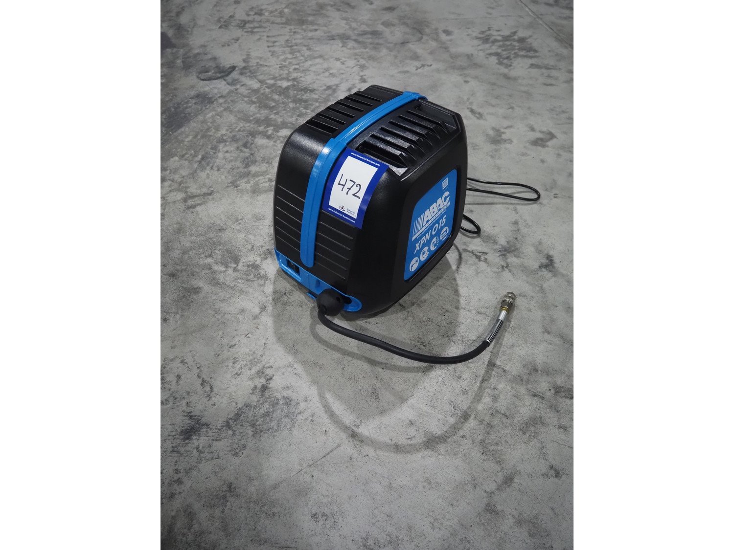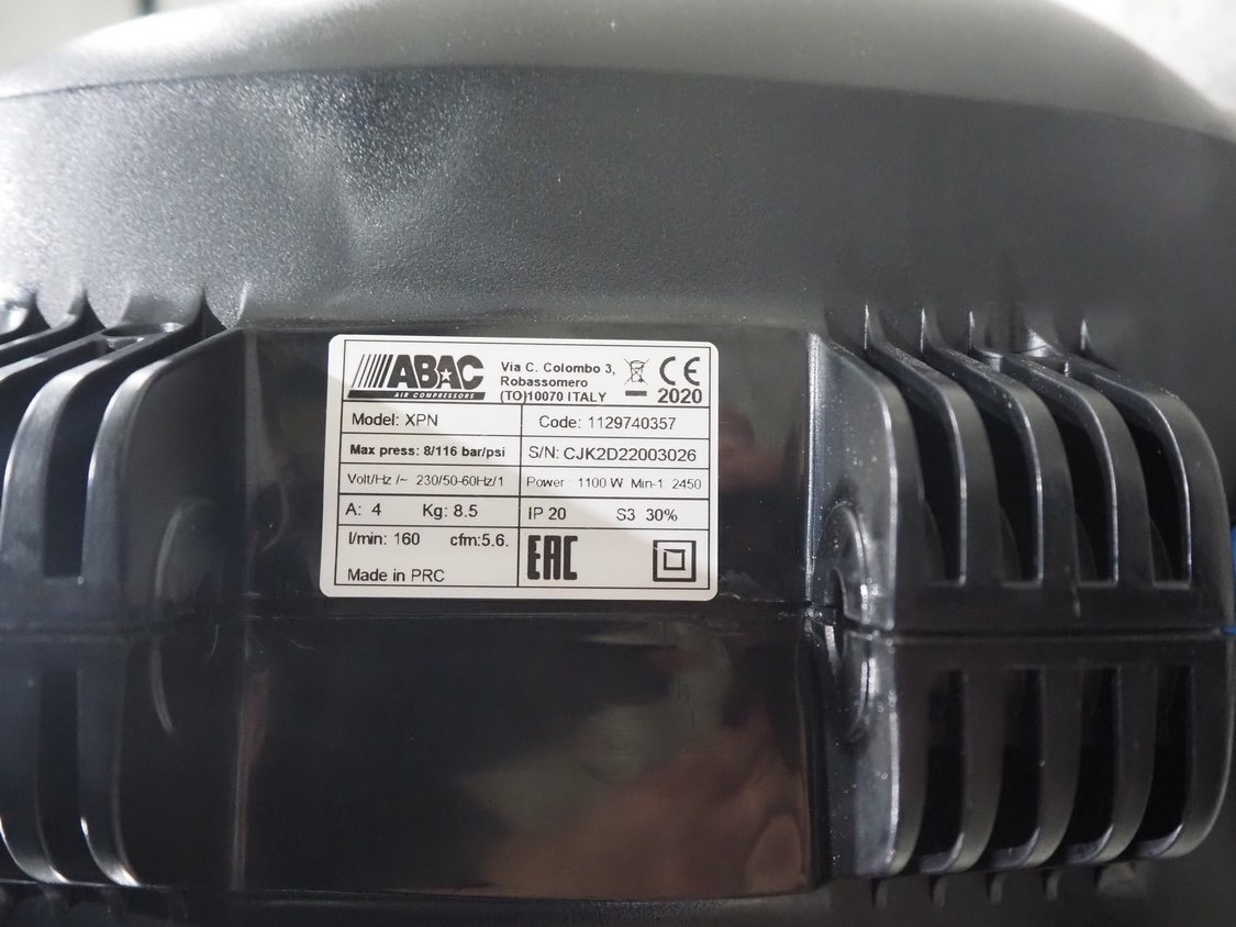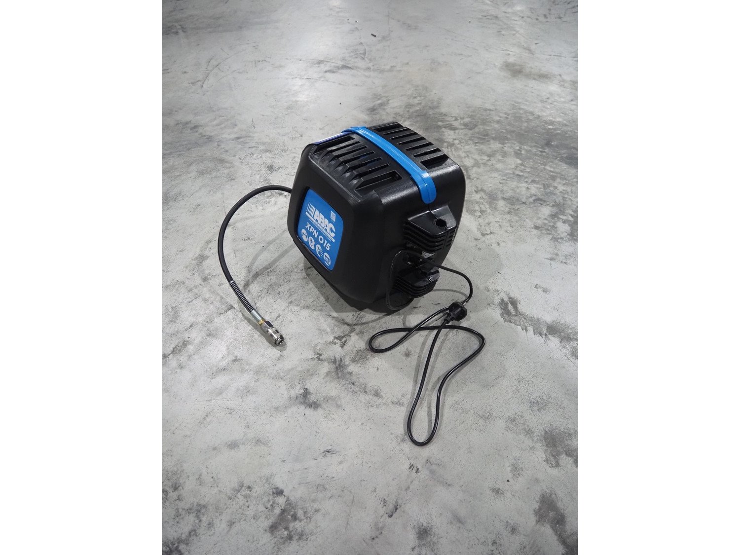 ABAC air compressors with hose reel, model: XPN, 230 V, 1 Ph, 50/60 Hz, 1100 W, weight: 8.5 kg, total dimensions: 400 mm x 250 mm x 300 mm.