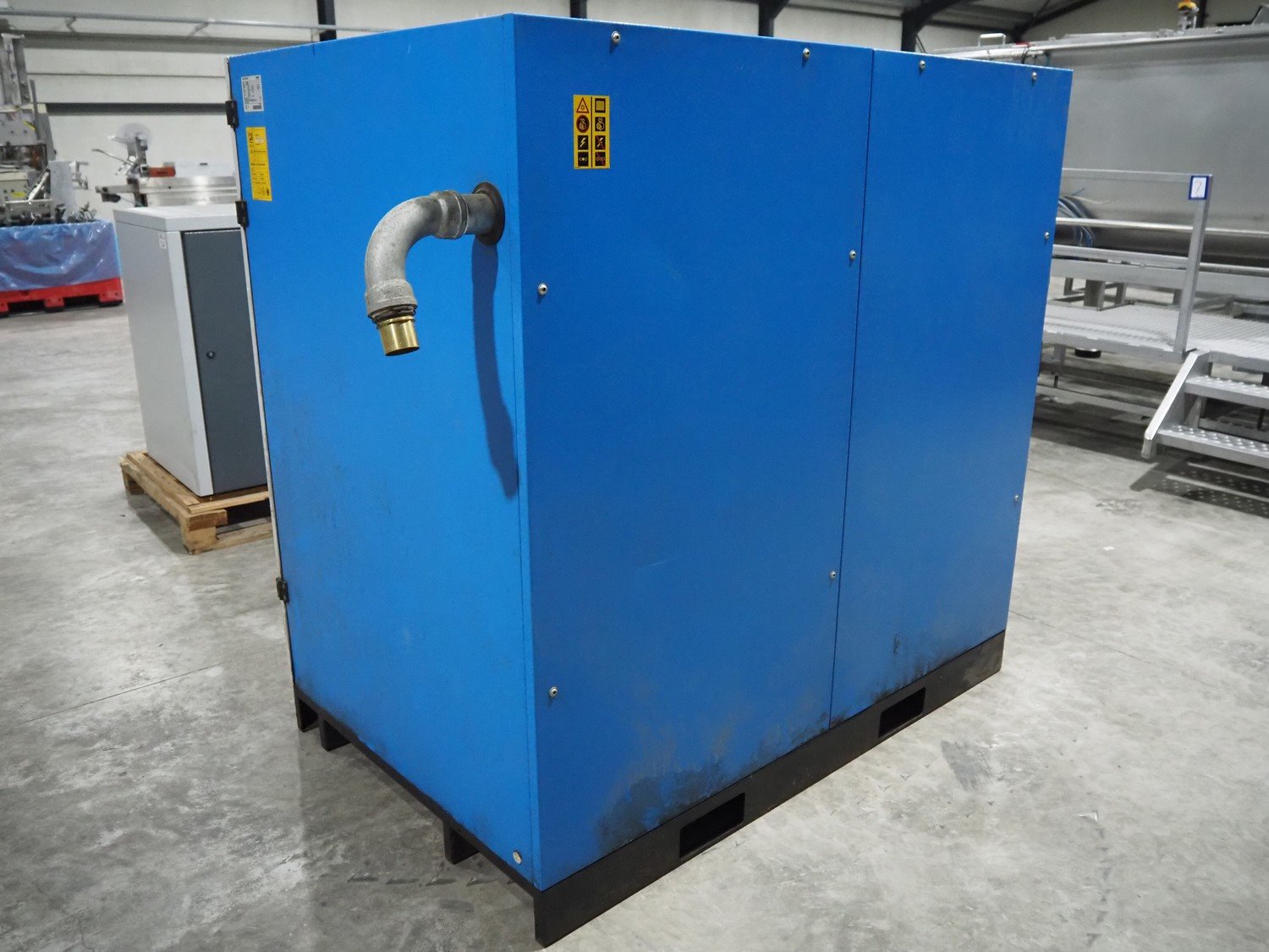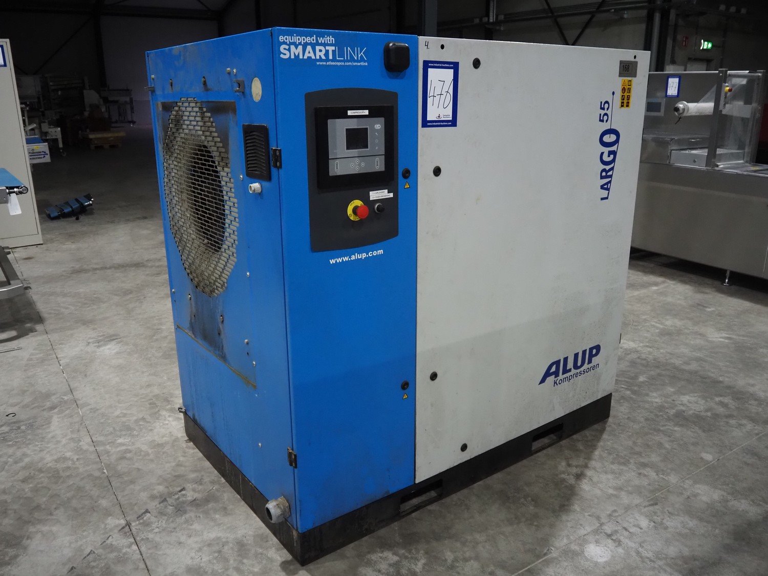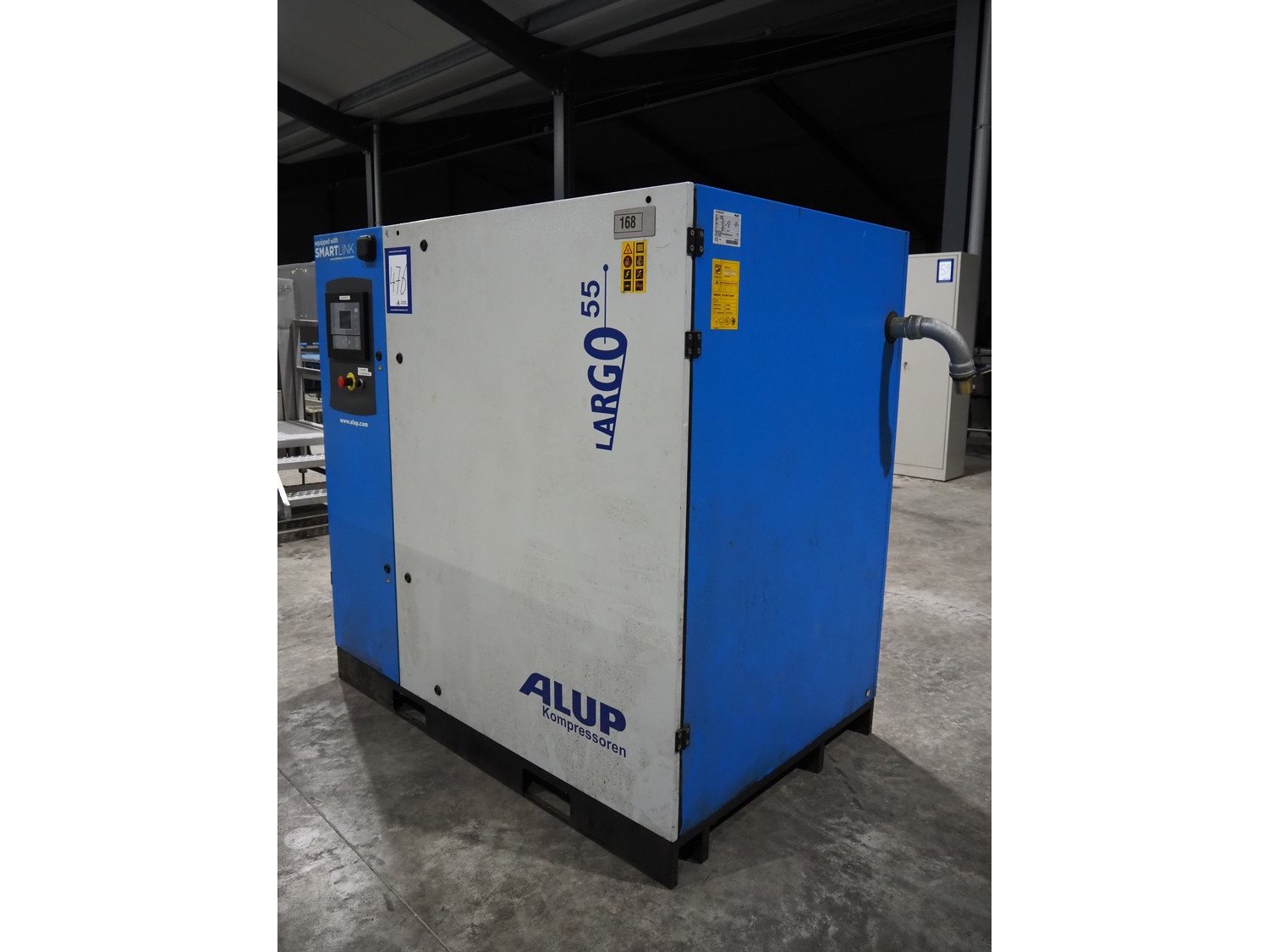 Alup screw compressor, type: LARG055, serial number: API170959, year of construction: 2013, 400 V, 3 Ph, 50 Hz, 55 kW, weight: 1130 kg, working hours: 20000 hours, dimensions: 1900 mm x 1100 mm x 1650 mm.