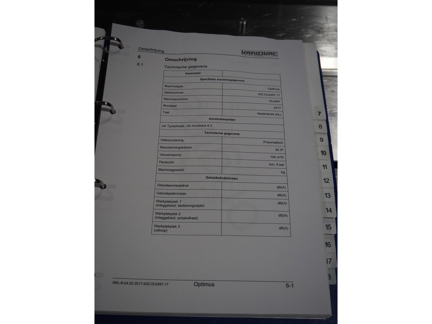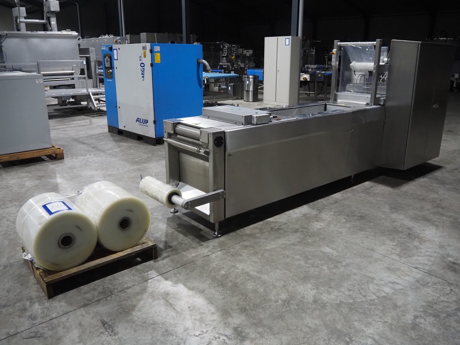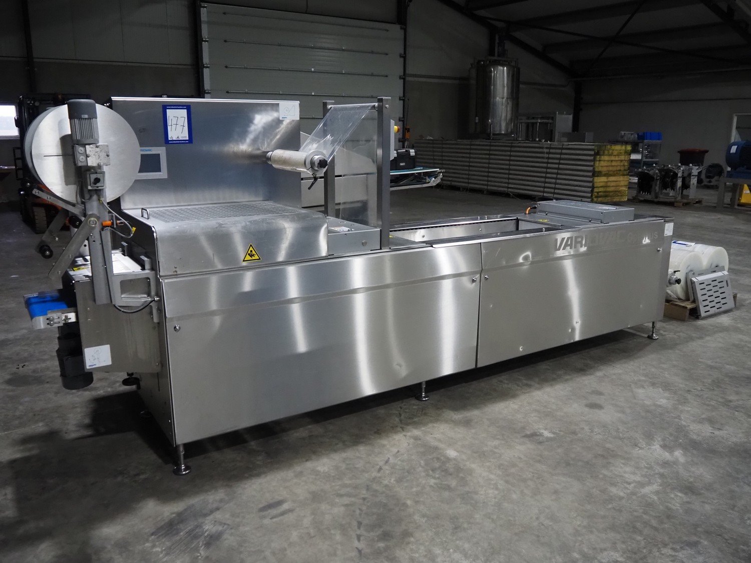 Variovac thermoformer, type: OPTIMUS, serial number: 420.OL0497.17, year of construction: 2017, 230/400 V, 50 Hz, 21 A, 13 kW, soft film, film width: 420 mm, dye: (2x) 172 mm x 255 mm, total dimensions: 4500 mm x 1100 mm x 1700 mm. Including pallet with foil, dimensions pallet: 850 mm x 600 mm x 550 mm.
