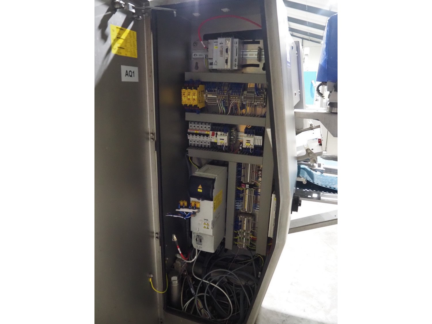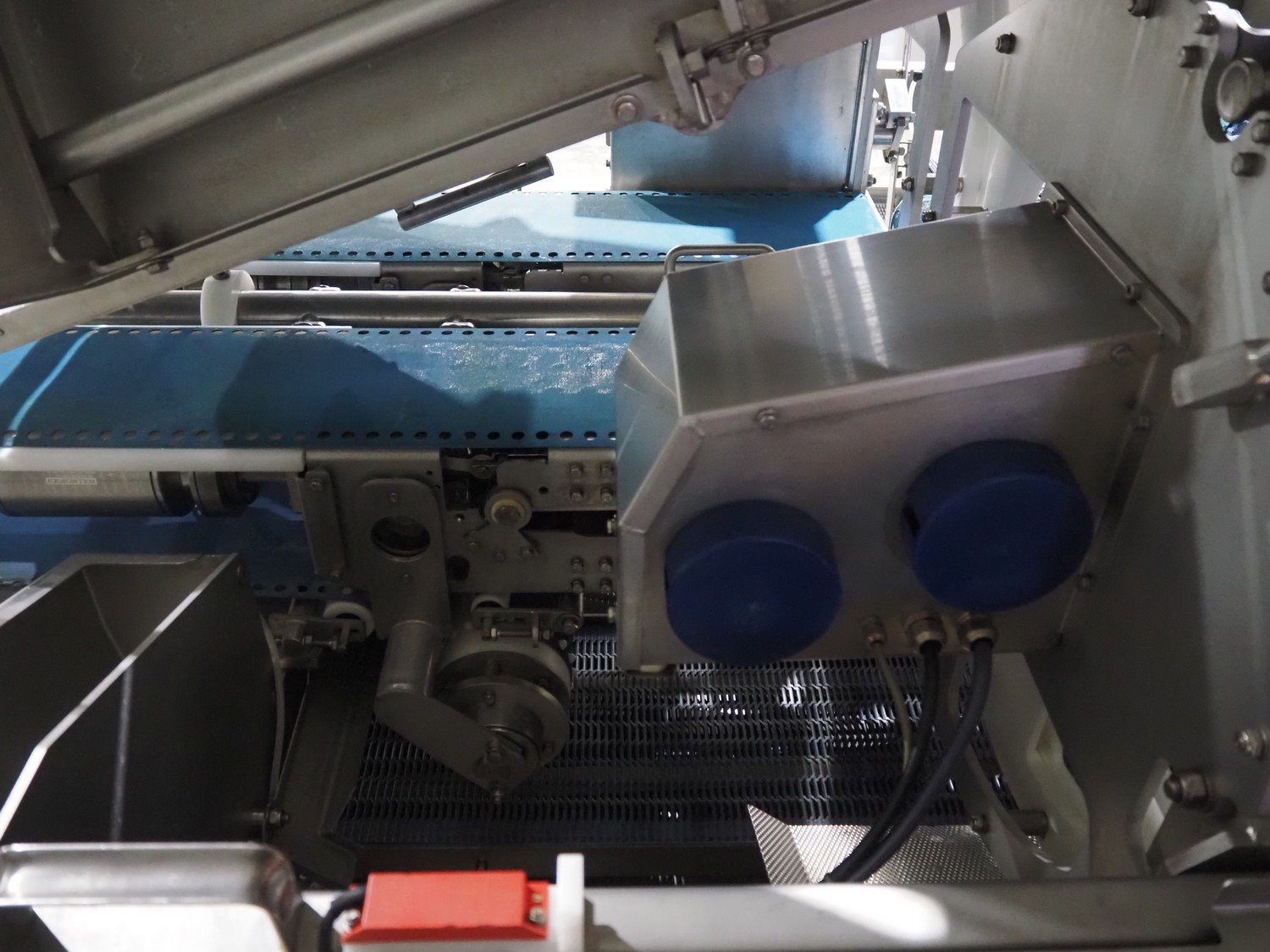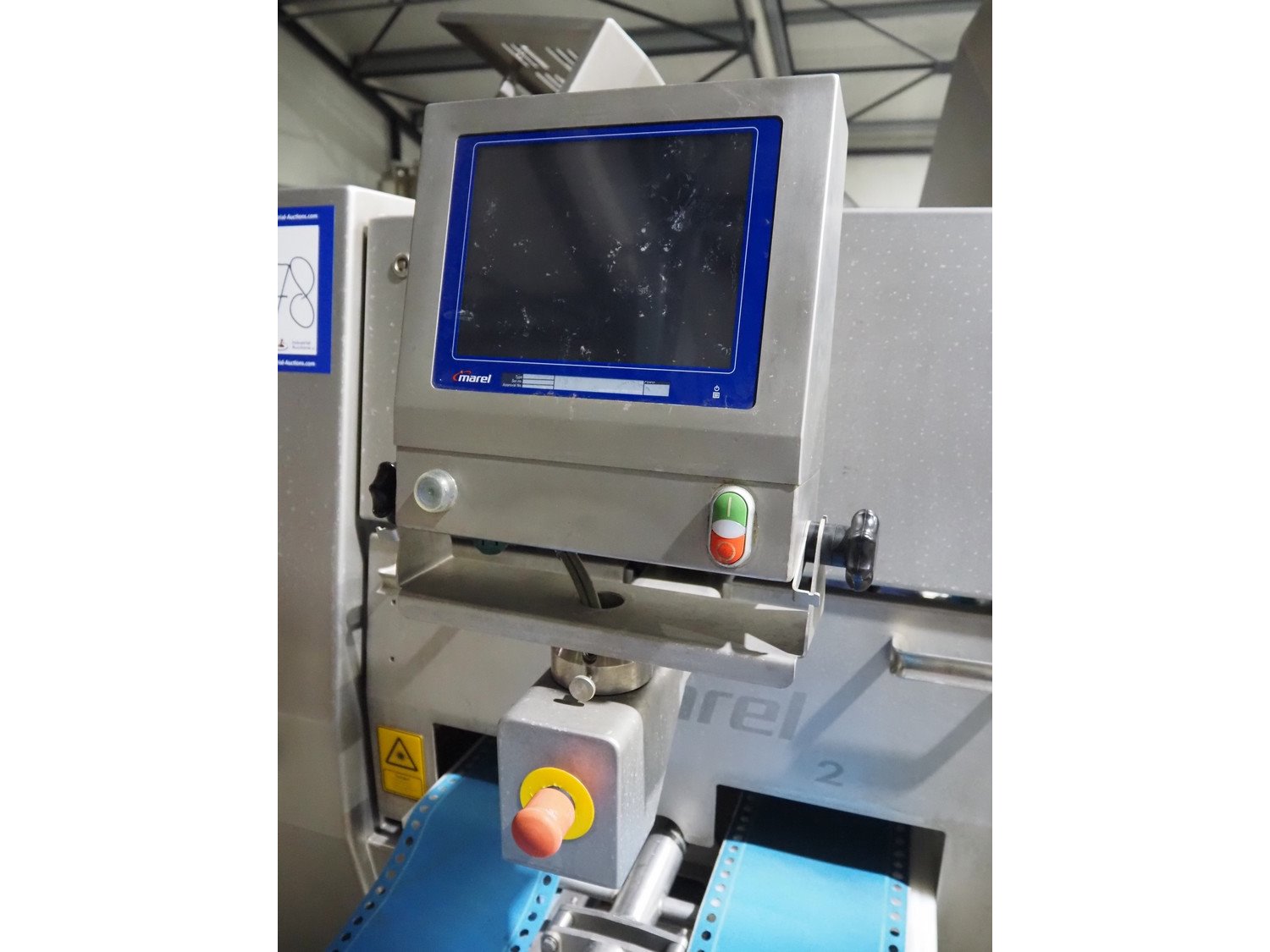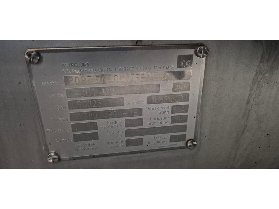 Marel Portion cutter, type: LR0325, model: I-Cut122, serial number: 10431550, year of construction: 2019, 380/480 V, 3 Ph, 50/60 Hz, 1 A, plastic belt, belt width: (2x) 200 mm, total dimenions: 4350 mm x 1520 mm x 1600 mm. Incomplete, technical condition unknown.