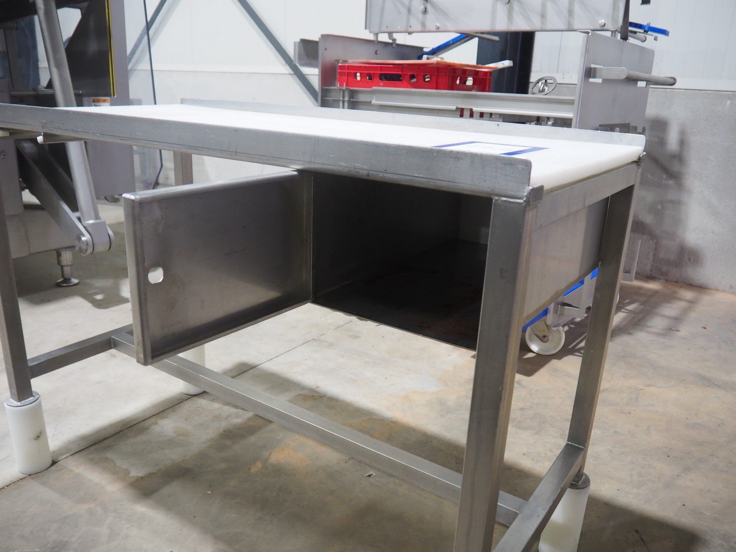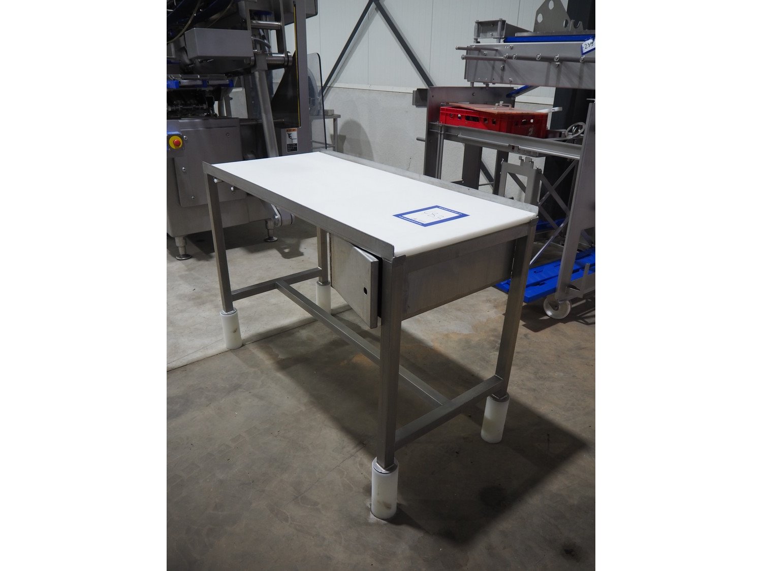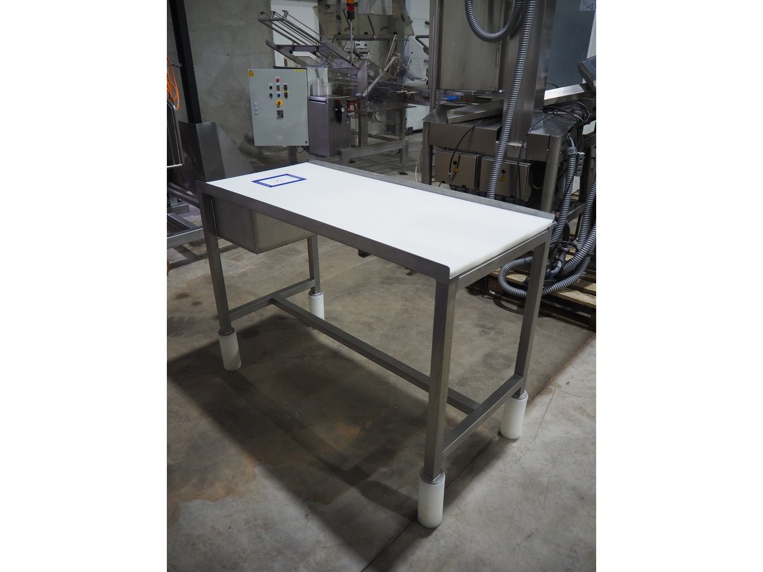 S/s table with plastic top, dimensions: 600 mm x 1300 mm x 950 mm.