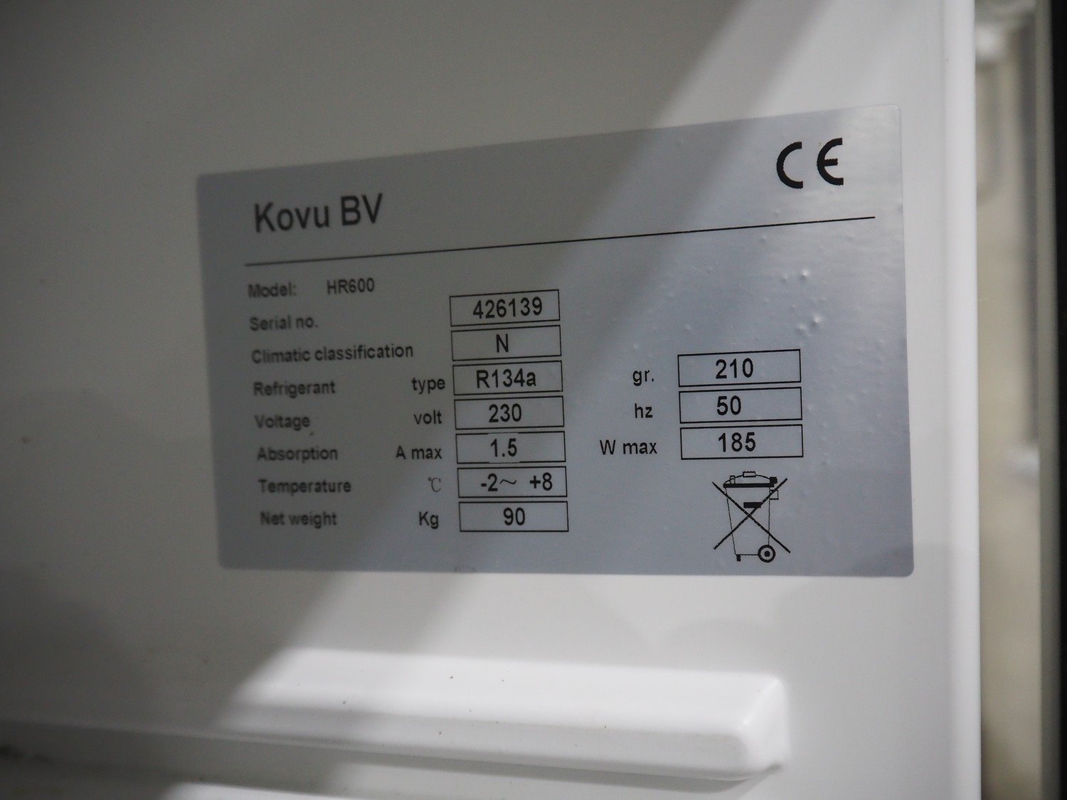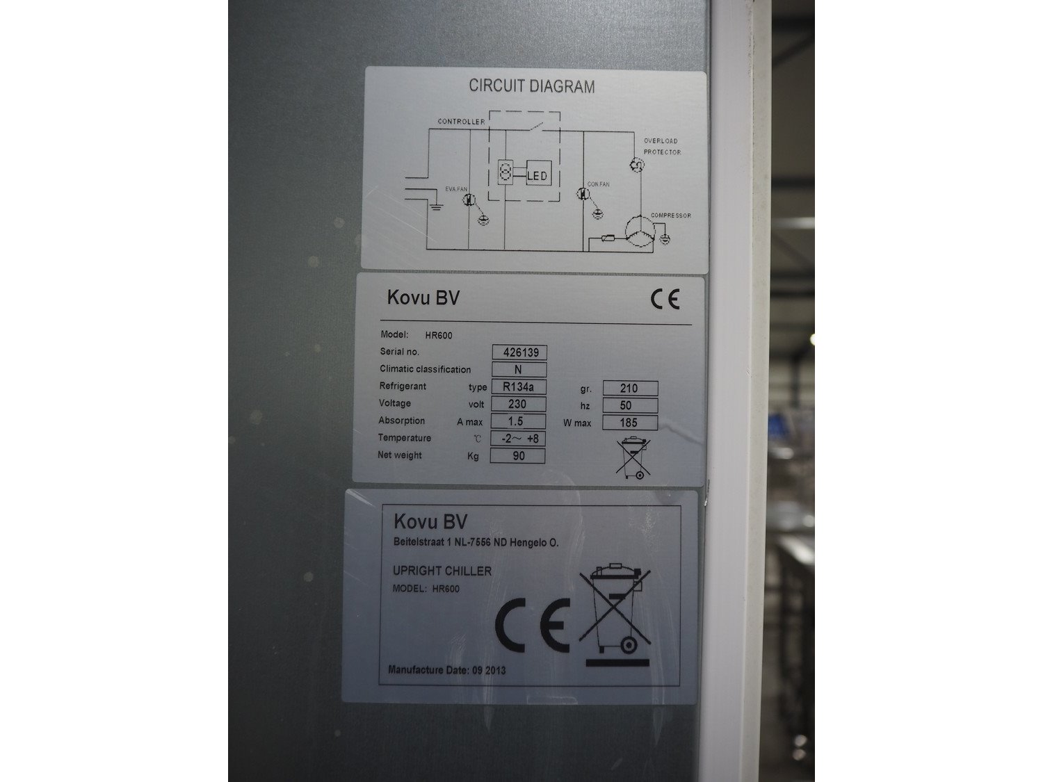Kovu BV freezer, model: HR600, serial number: 426139, 230 V, 50 Hz, 185 W, refrigerant: R134a, weight: 90 kg, dimensions: 700 mm x 800 mm x 1880 mm.