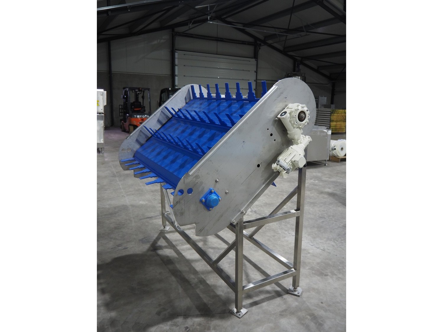 Elevating belt, plastic belt with dividers, belt width: 1600 mm, distance between dividers: 300 mm, divider height: 150 mm, elevating height: 1580 mm, total dimensions: 1100 mm x 1800 mm x 1700 mm.