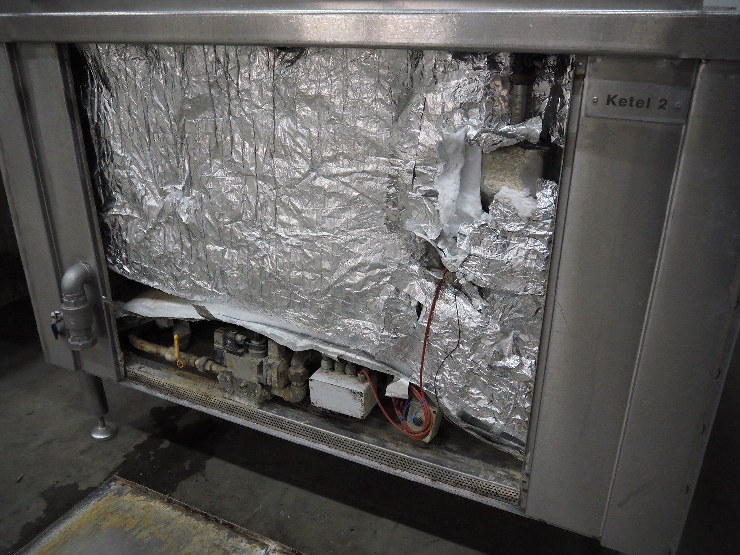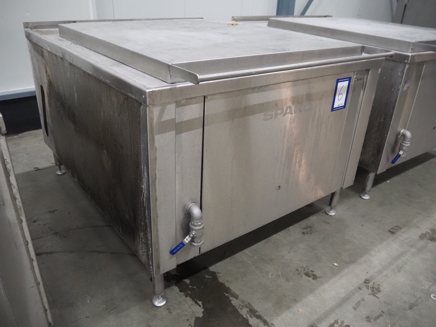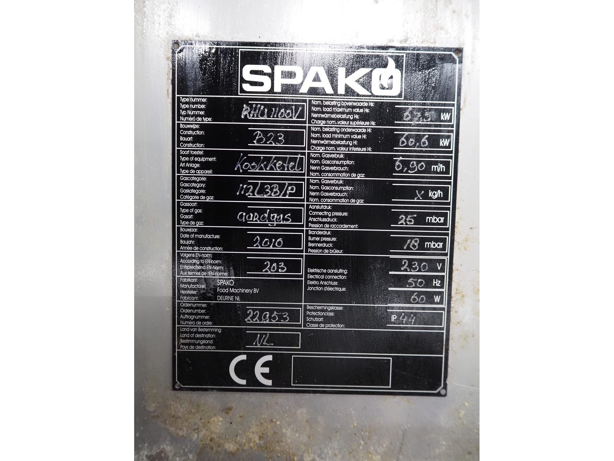 Spako cooking vessel, type number: RHU 1100 V, year of construction: 2010, natural gas, 230 V, 50 Hz, 60 W, volume: 1100 liter, dimensions inside: 1400 mm x 1300 mm x 600 mm, total dimensions: 2300 mm x 1670 mm x 1280 mm.