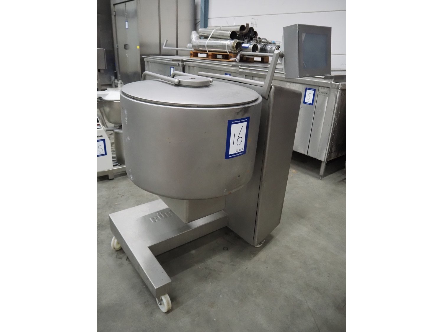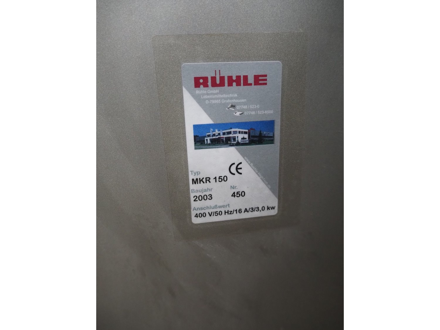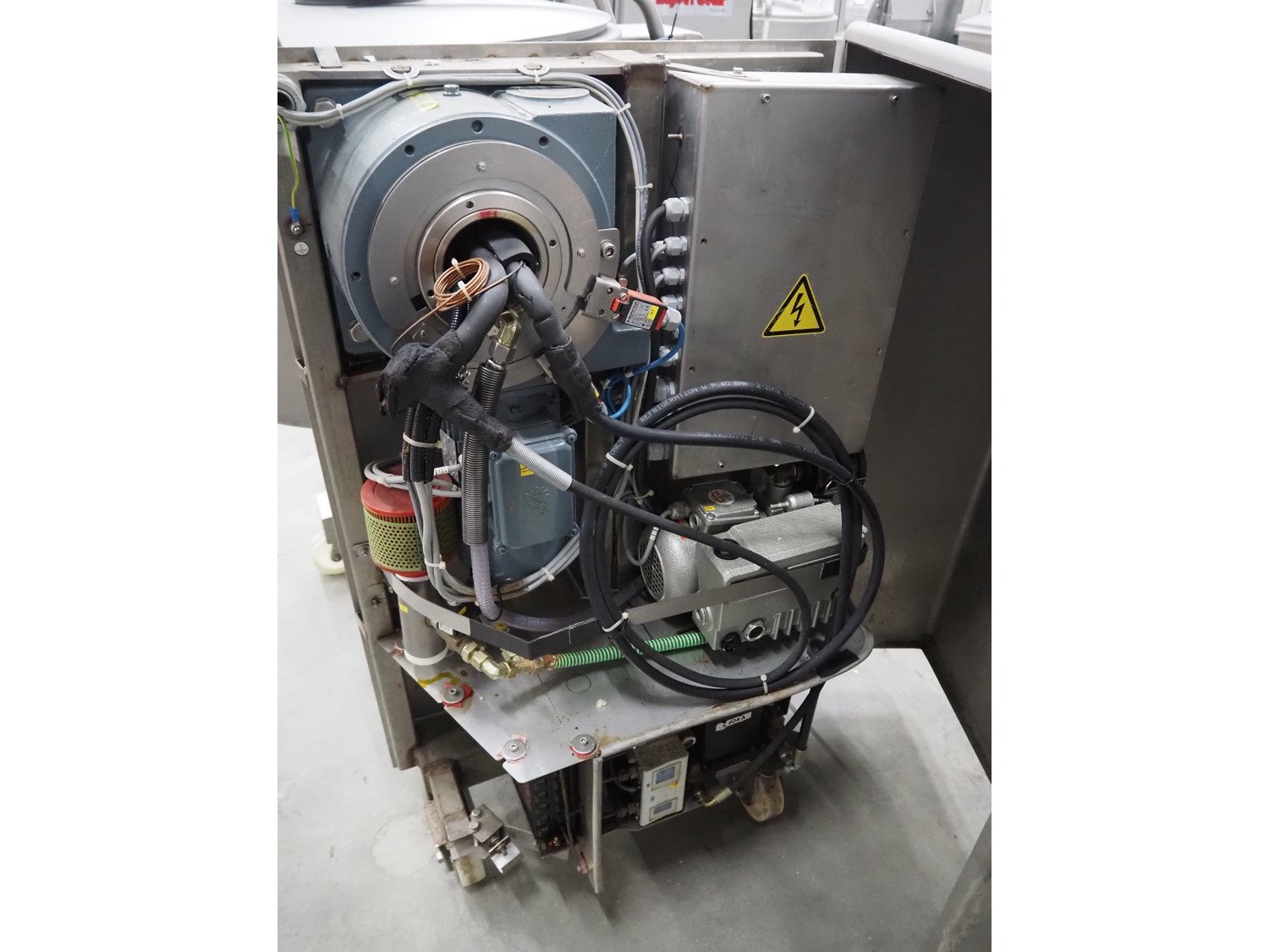 Rühle mobile cooled vacuum tumbler, type: MKR 150, number: 450, year of construction: 2003, 400 V, 50 Hz, 16 A, 3 kW, volume: 150 liter, Busch vacuum pump, type: KC 0010 D IZO, number: 03027214, capacity: 10 m³ per hour, total dimensions: 1250 mm x 980 mm x 1480 mm.