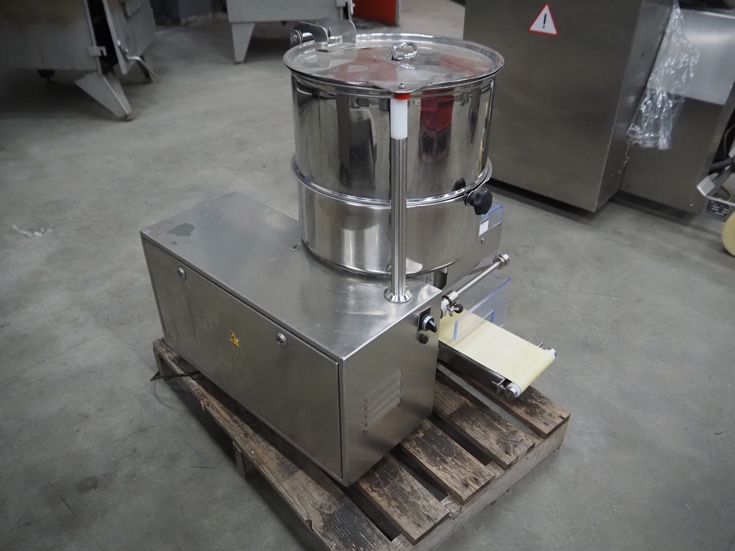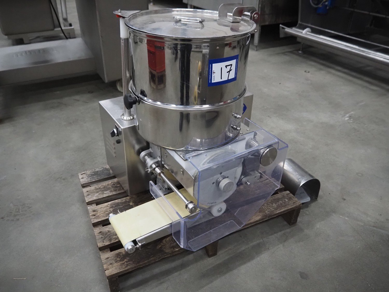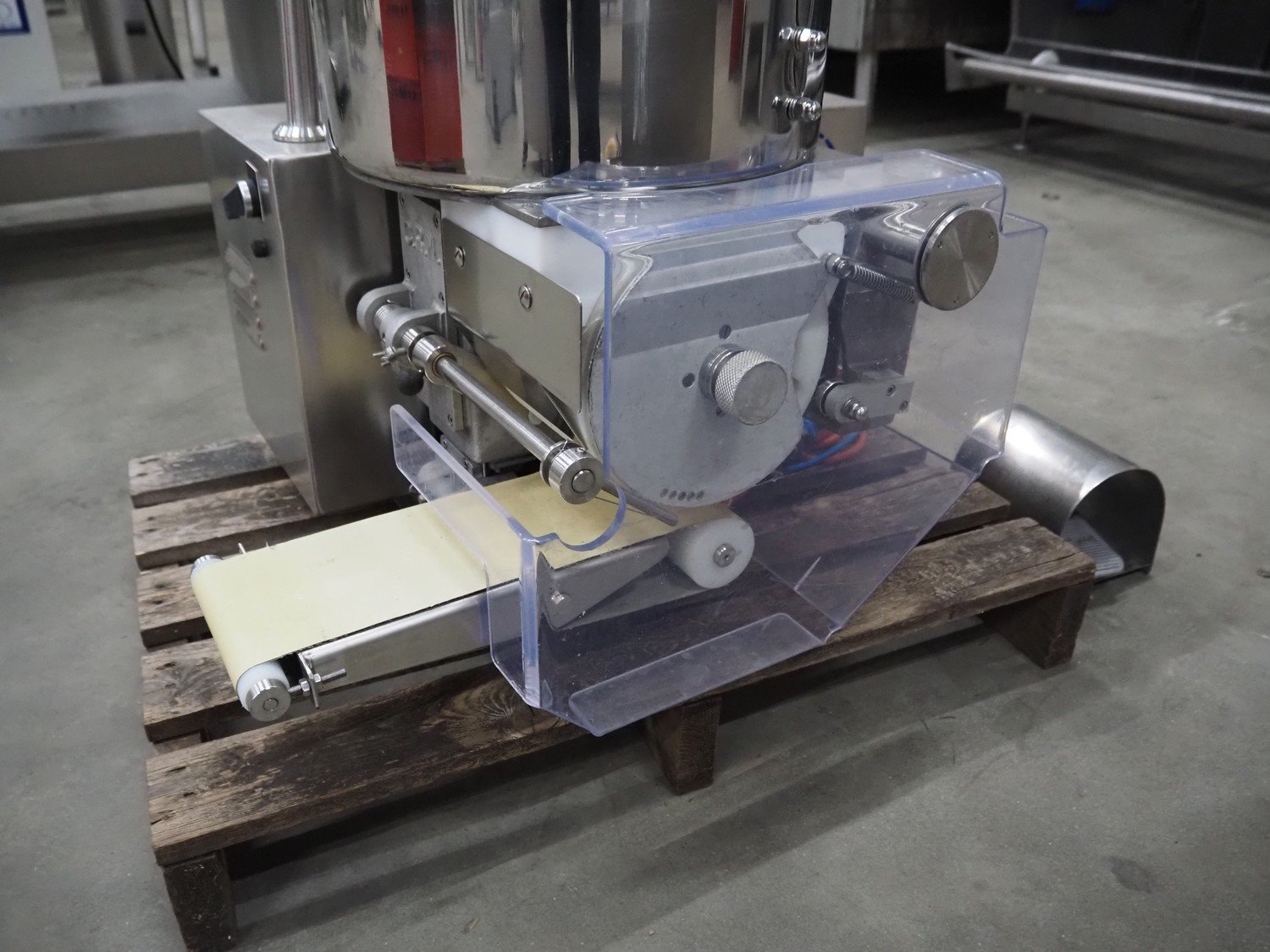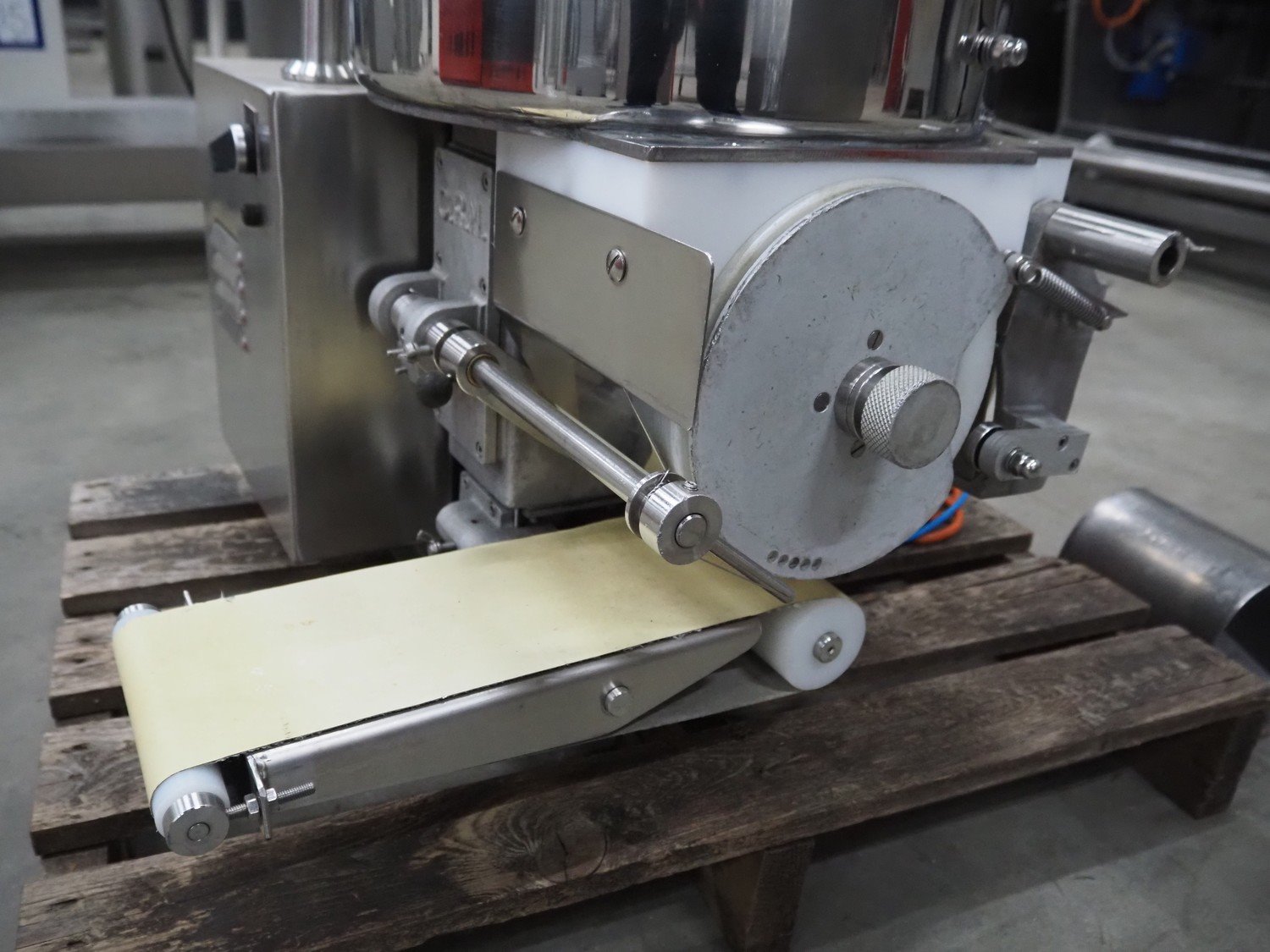 De Jong Engineering 't Harde B.V. hamburger forming machine, machine type: planu, serial number: 469, year of construction: 2000, 230 V, plastic belt, belt width: 130 mm, diameter dye: 80 mm, total dimensions: 750 mm x 600 mm x 750 mm.