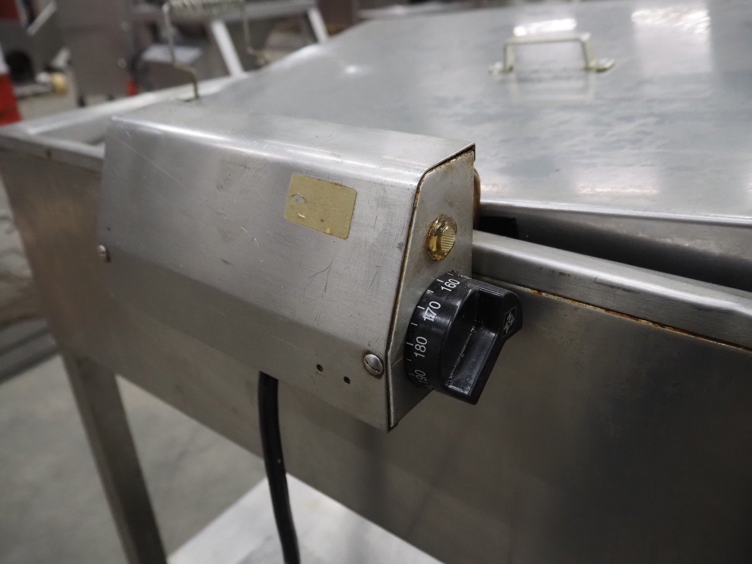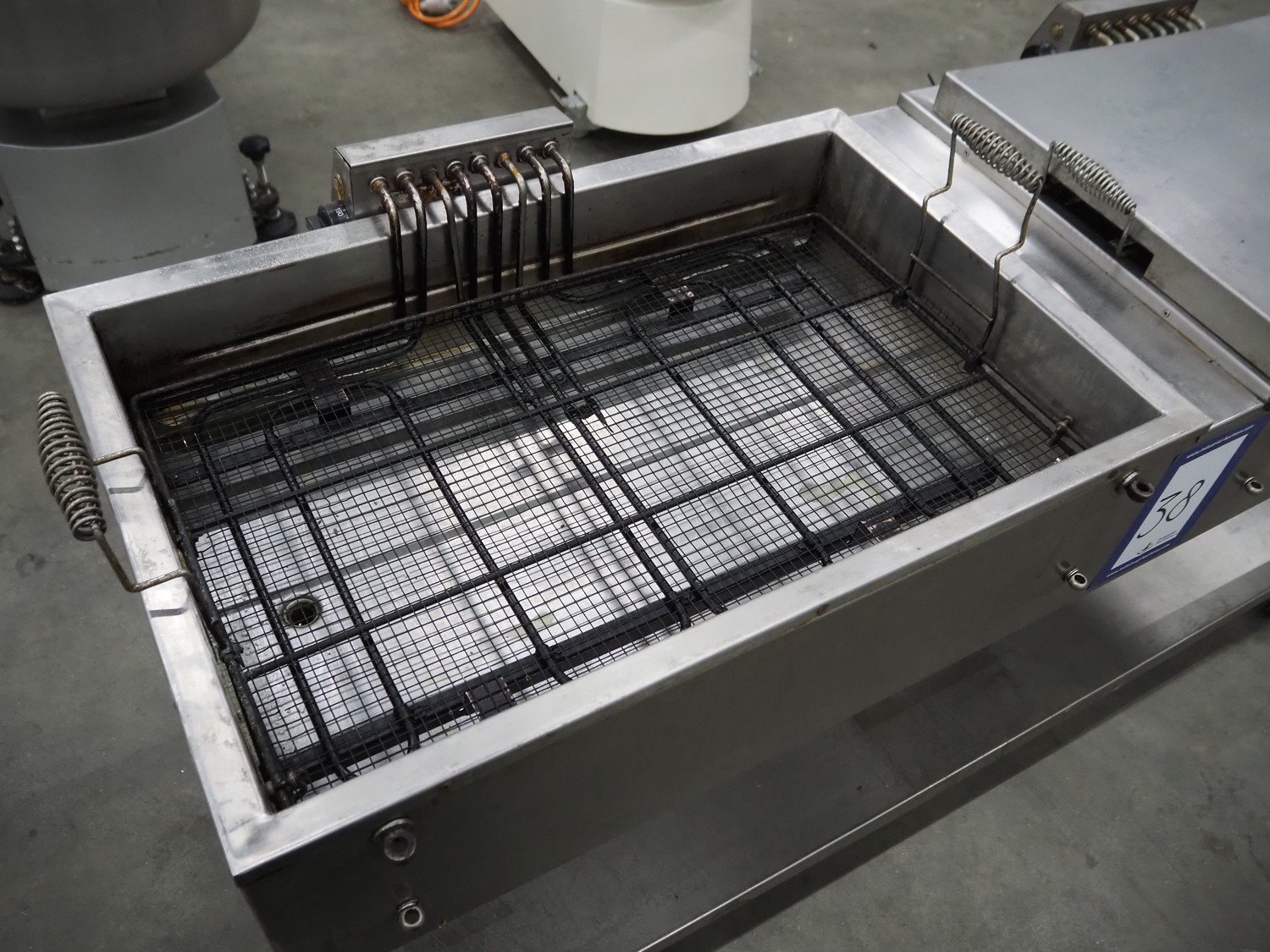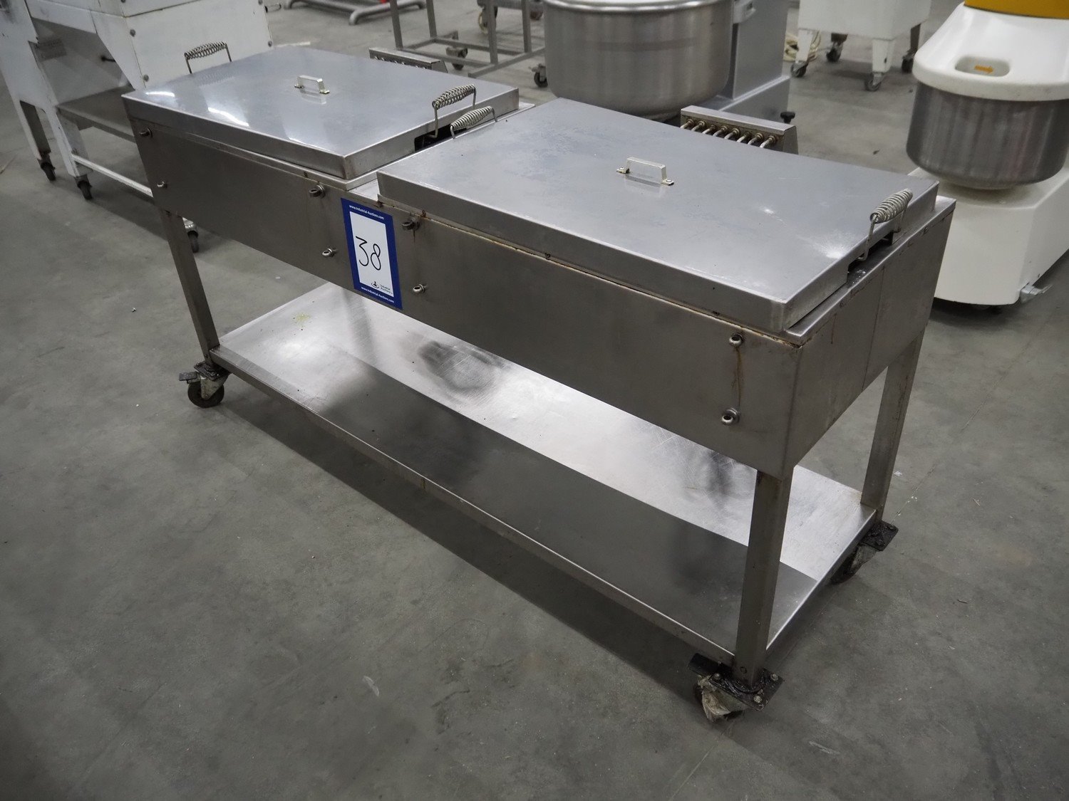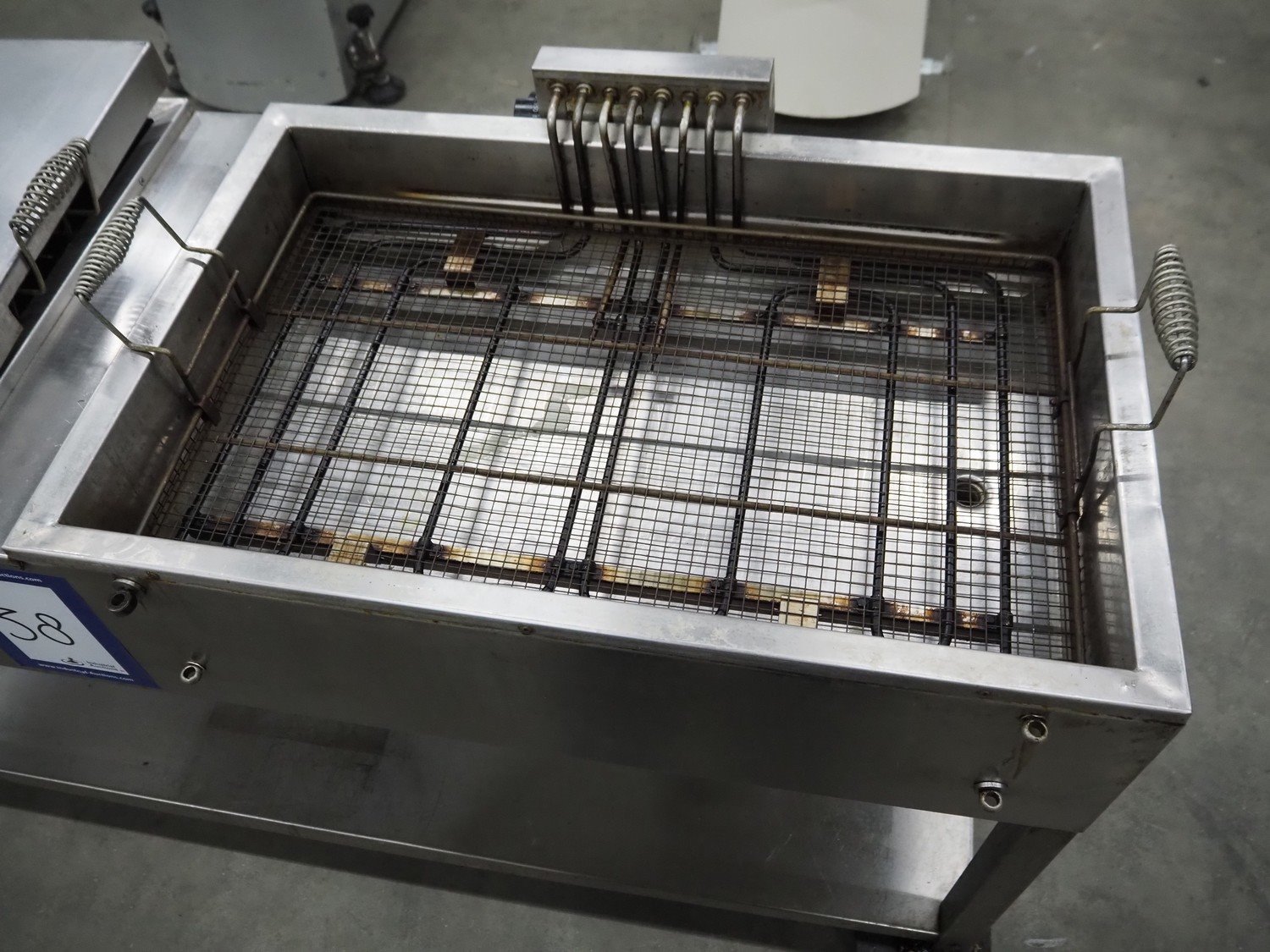 MKN s/s mobile double doughnut fryer, inside dimensions: (2x) 760 mm x 460 mm, total dimensions: 1760 mm x 630 mm x 1000 mm. Including extra baskets.
