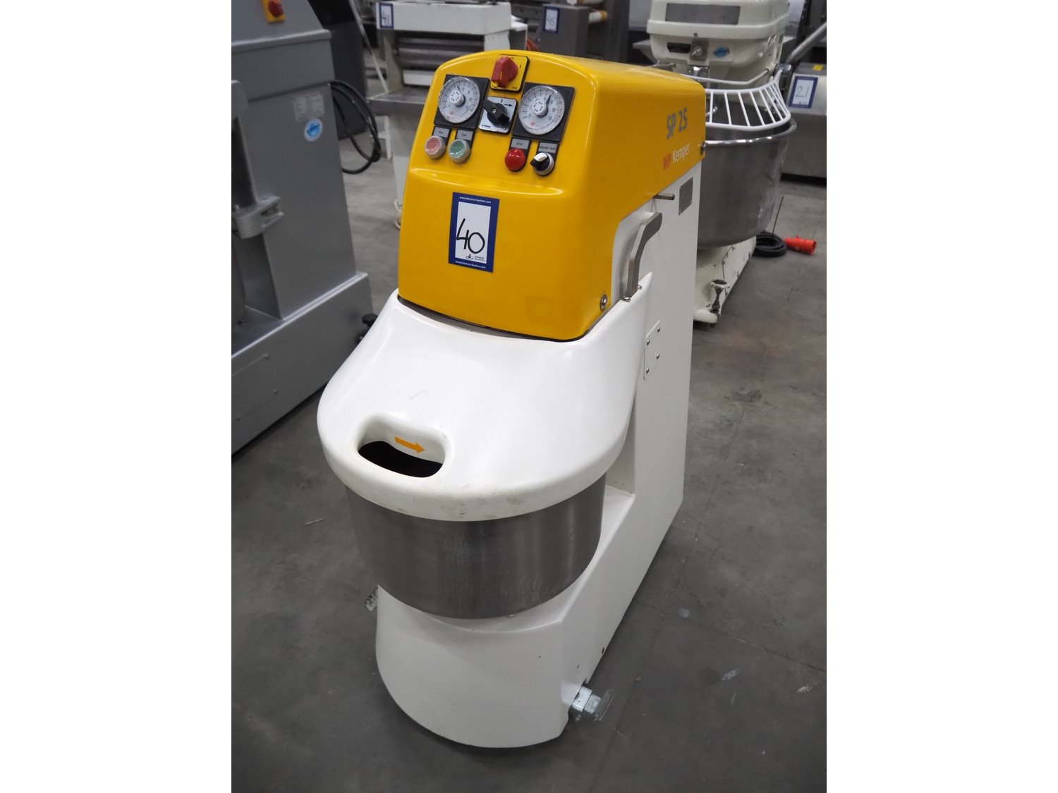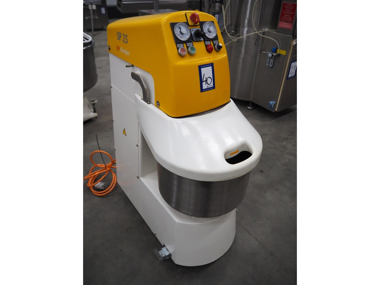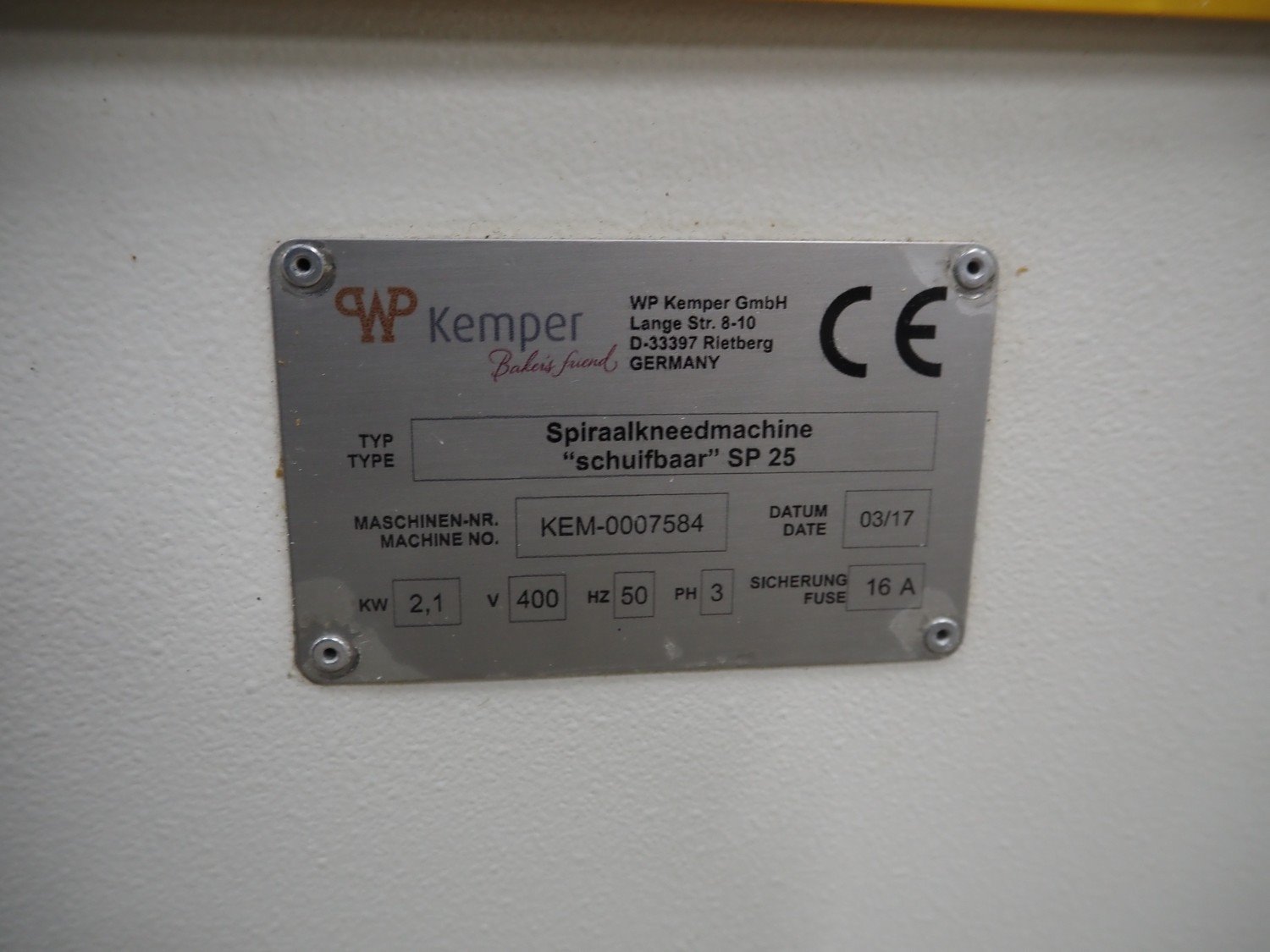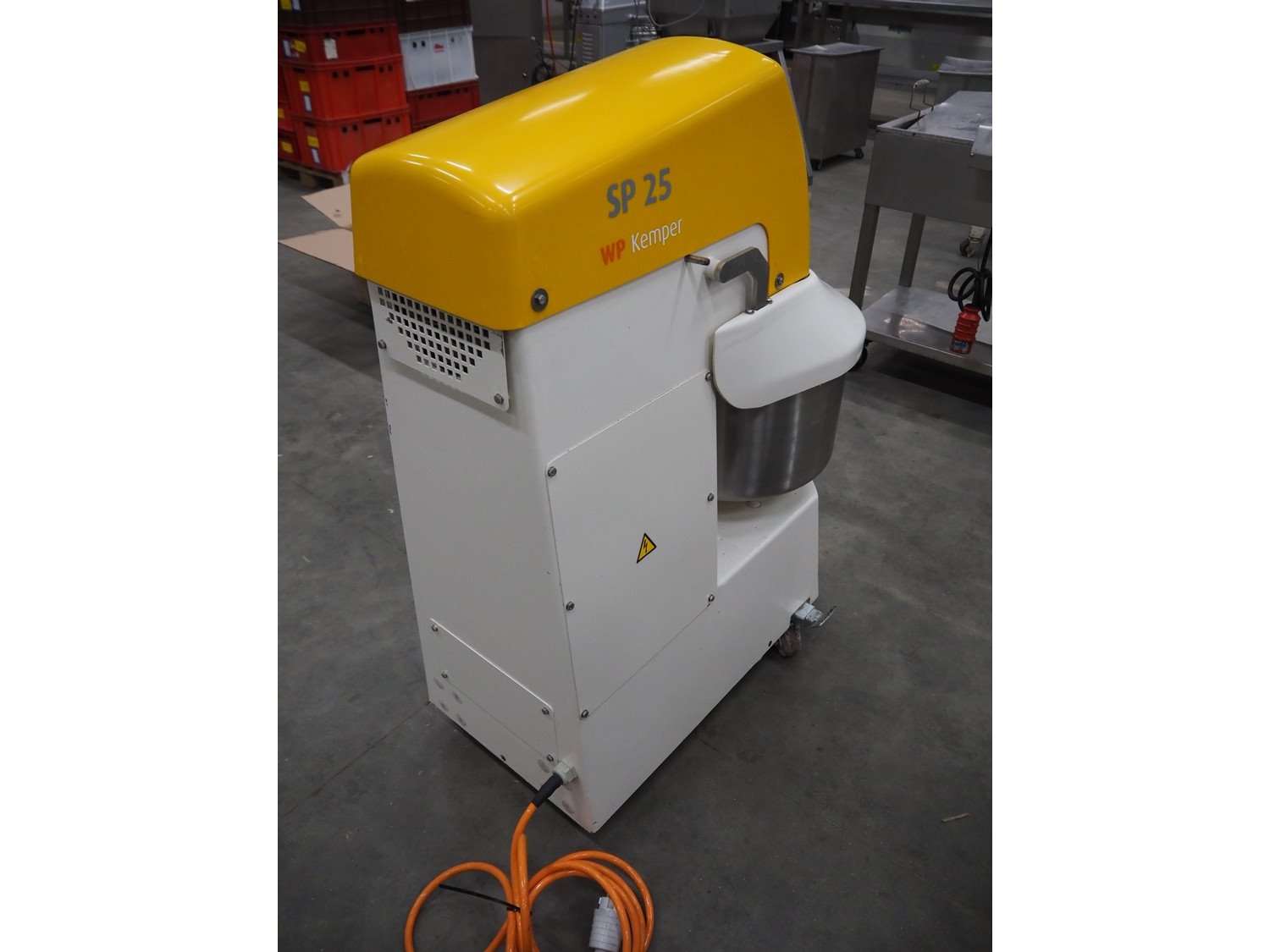 WP Kemper GmbH mobile mixer, type: Spiraalkneedmachine "schuifbaar" SP 25, machine number: KEM-0007584, year of construction: 03/17, 400 V, 3 Ph, 50 Hz, 16 A, 2.1 kW, capacity: 25 kg dough, s/s bowl, bowl dimensions: Ø 430 mm x 280 mm, total dimensions: 940 mm x 470 mm x 1200 mm.