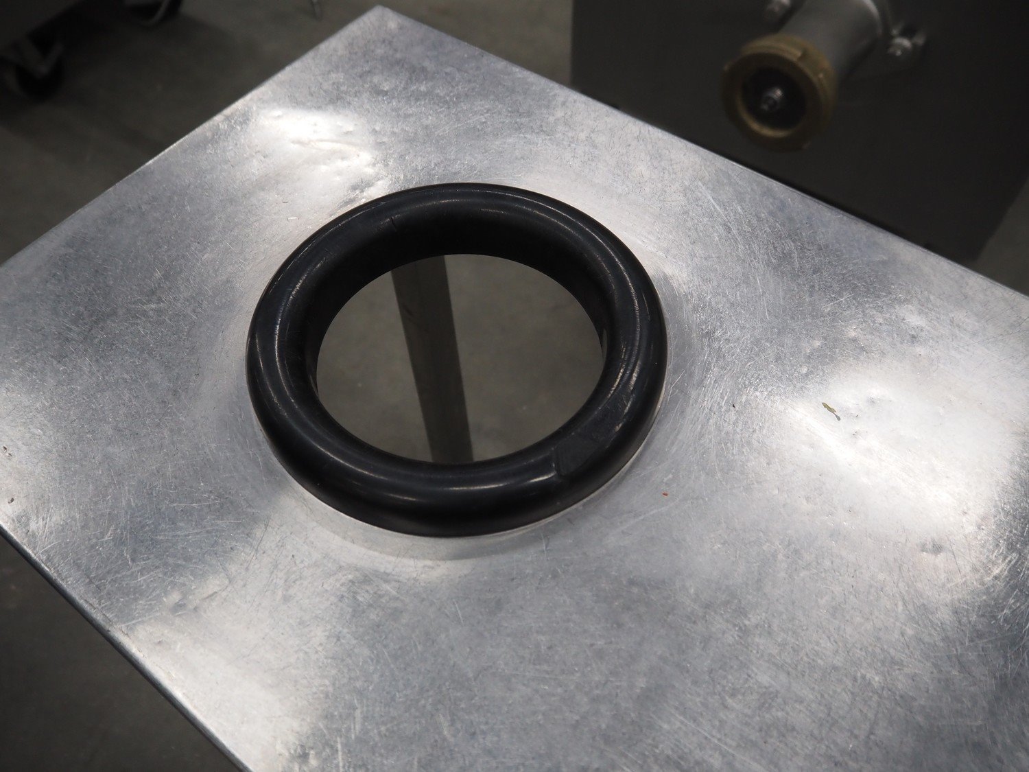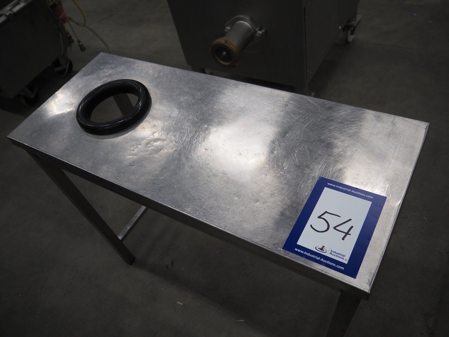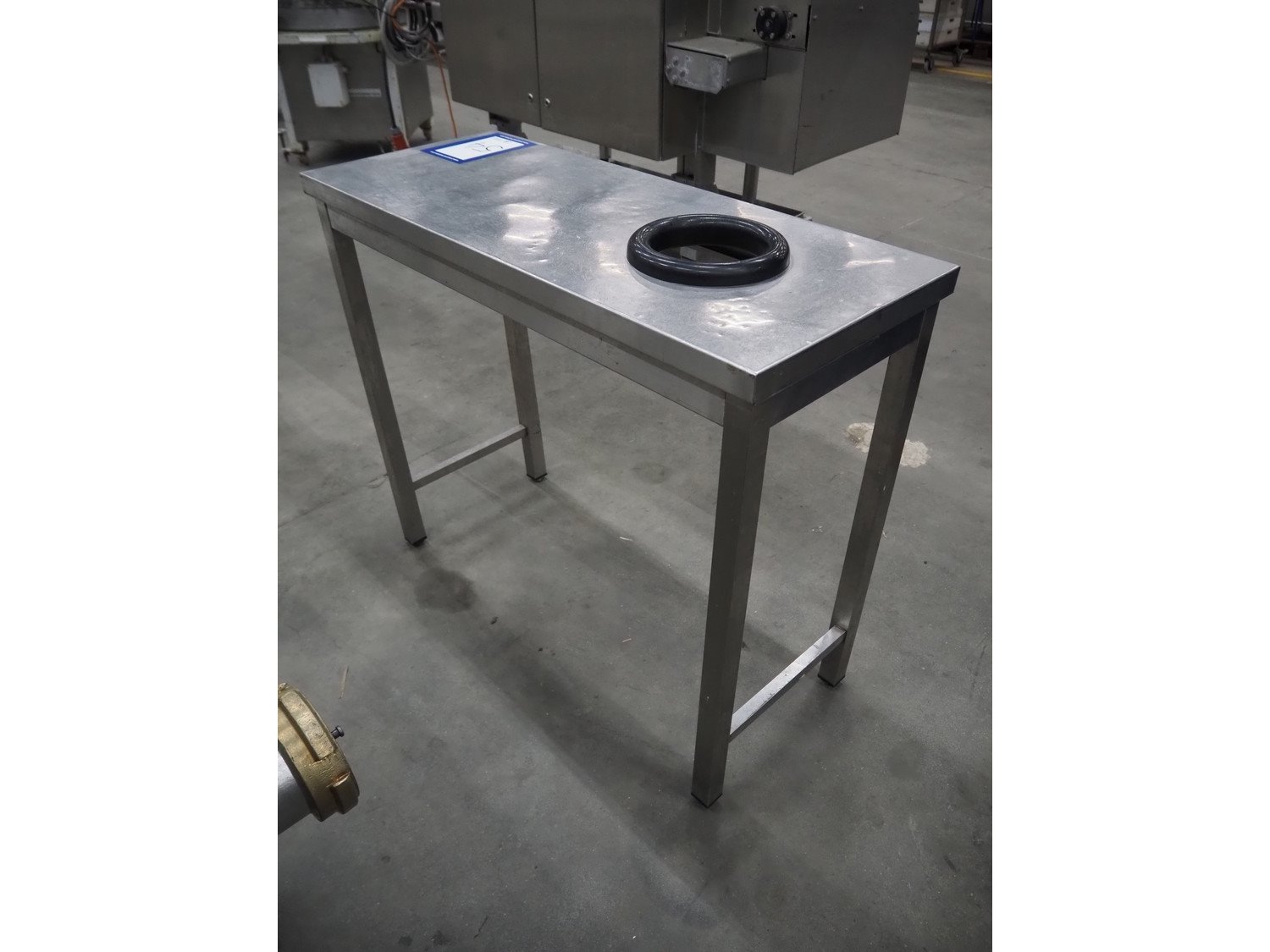 S/s table with opening, opening: Ø 160 mm, total dimensions: 1100 mm x 450 mm x 920 mm.